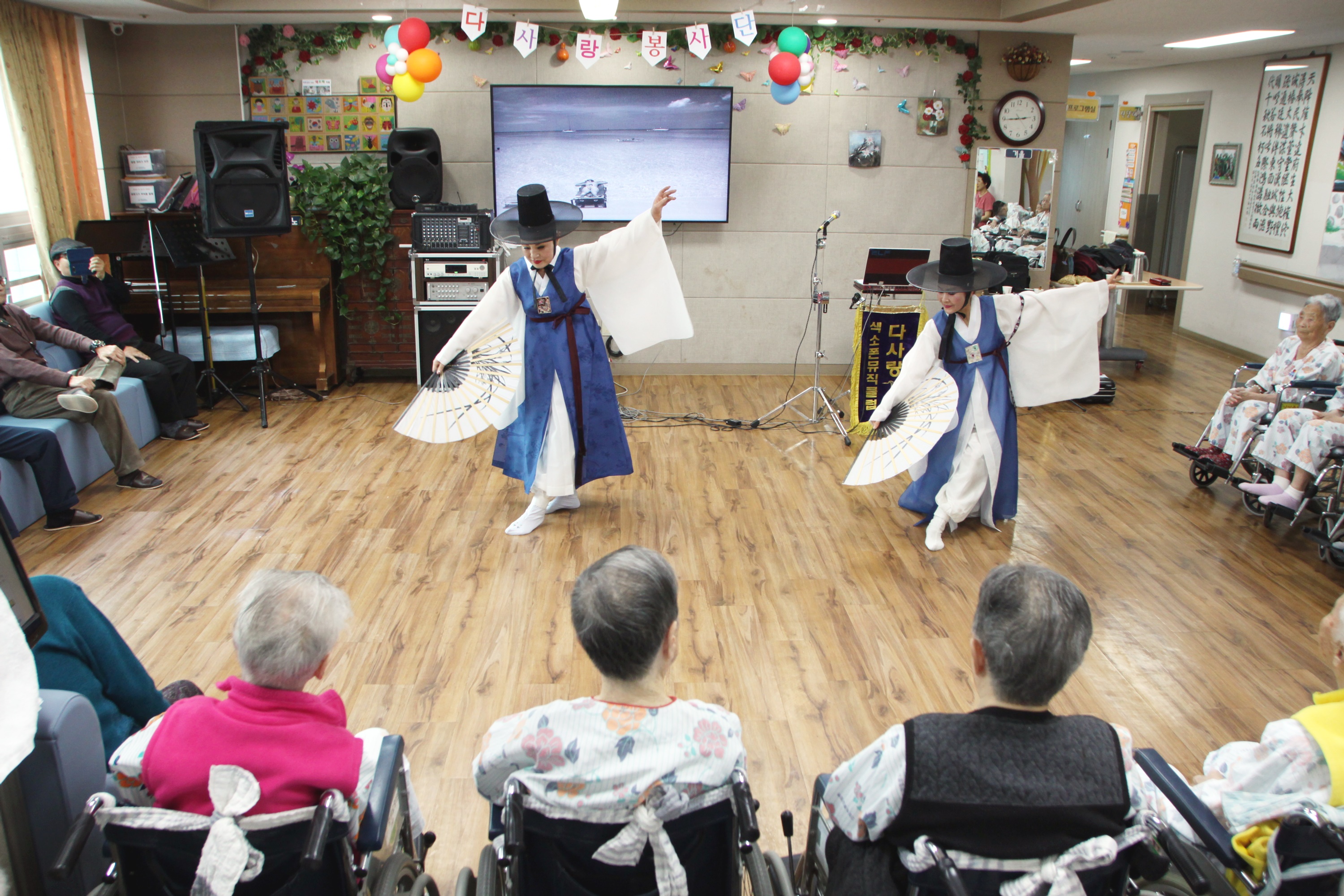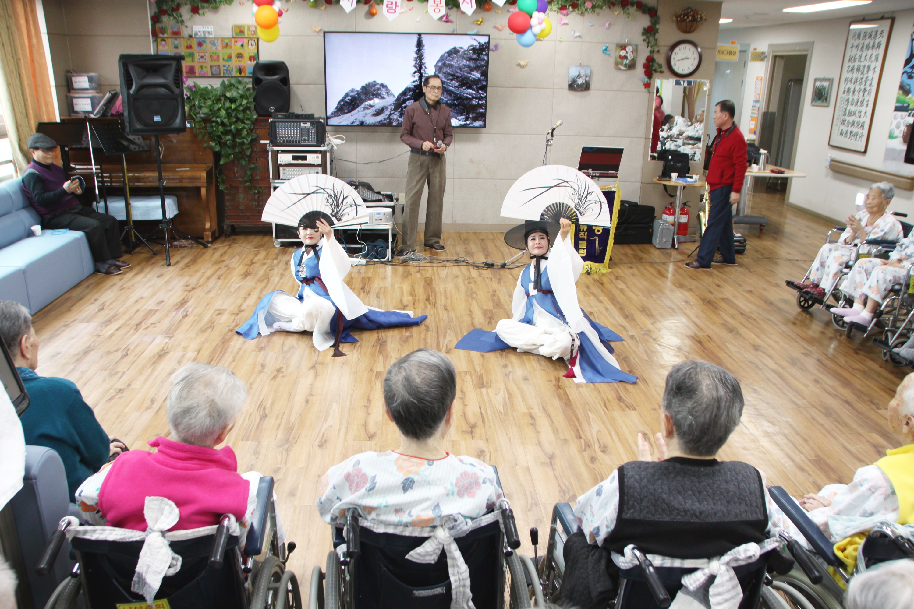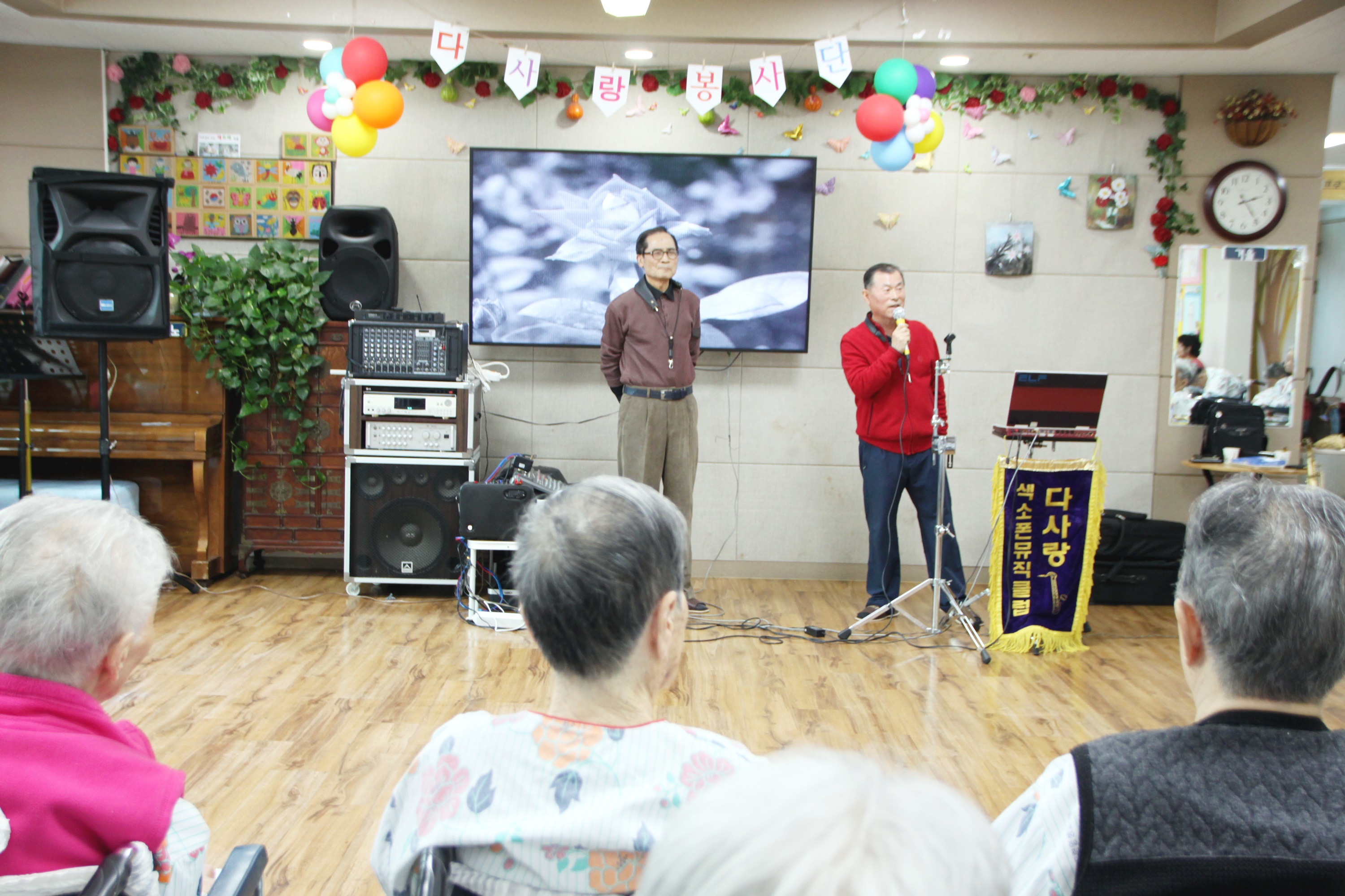 다사랑뮤직클럽 소리봉사단이 오셔서 어르신들에게 풍성한 공연을 보여 주셨습니다. 색소폰 공연, 한국무용 가수의 아름다운 노래까지 정월대보름 행사로 풍성하게 도움 주셨습니다.