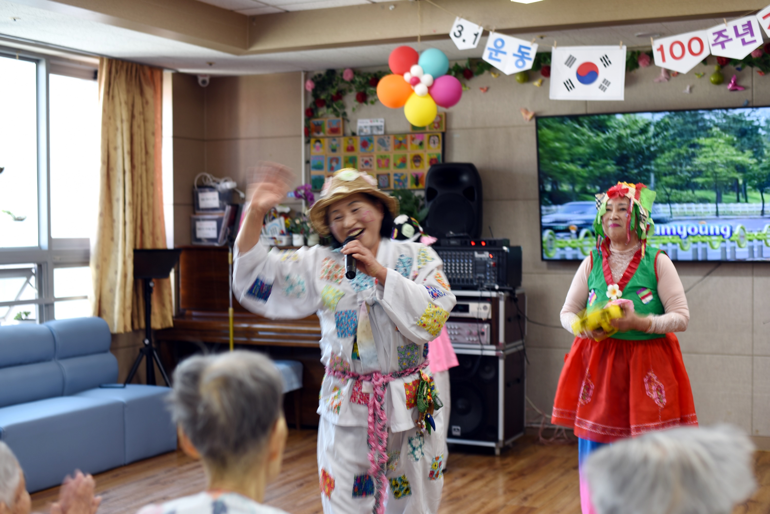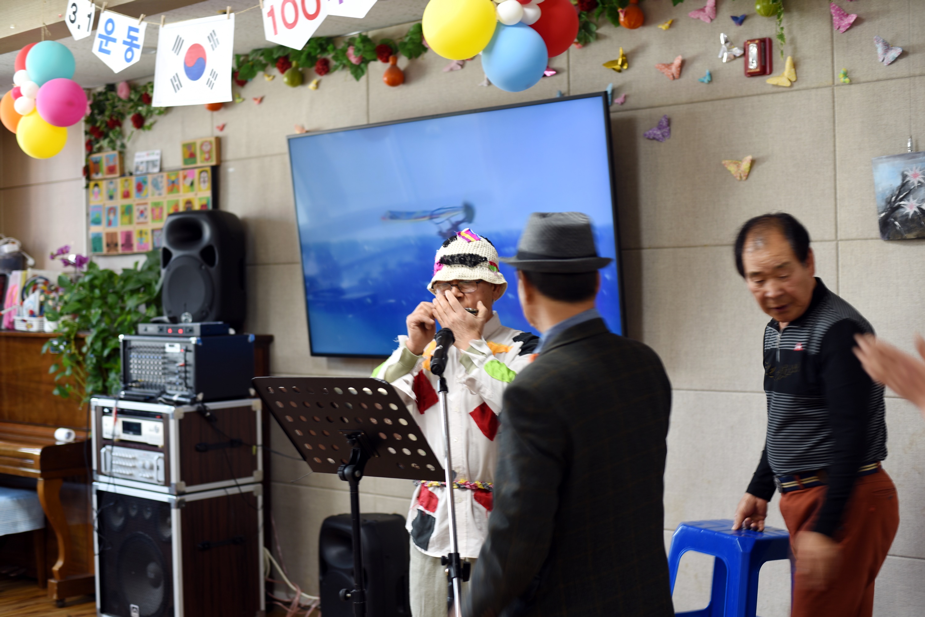 흥이 넘치는 품바타령과 노래로 어르신들에게 즐거운 시간을 주시는 삼대리평생학습봉사단께서 추억의 아코디언과 하모니카 노래 가위춤까지 멋진 공연을 준비해주셨으며 3.1운동 100주년 기념 ucc도 함께 촬영하셨습니다. |