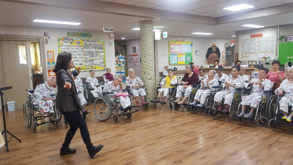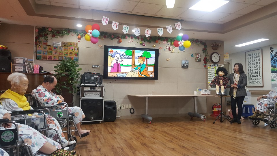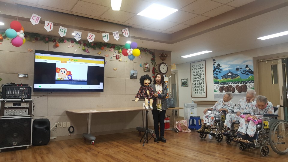 대가야스토리텔링 예술연구회 김은숙 선생님과 회원들이 요양원을 방문하셔서 입소 어르신들에게 재미난 동화와 레크레이션으로 즐거운 시간을 주셨습니다. |