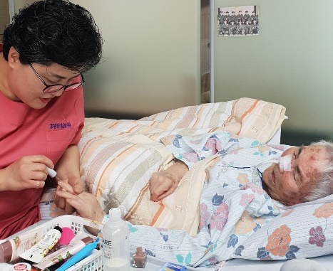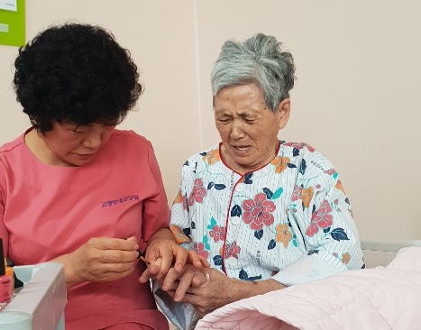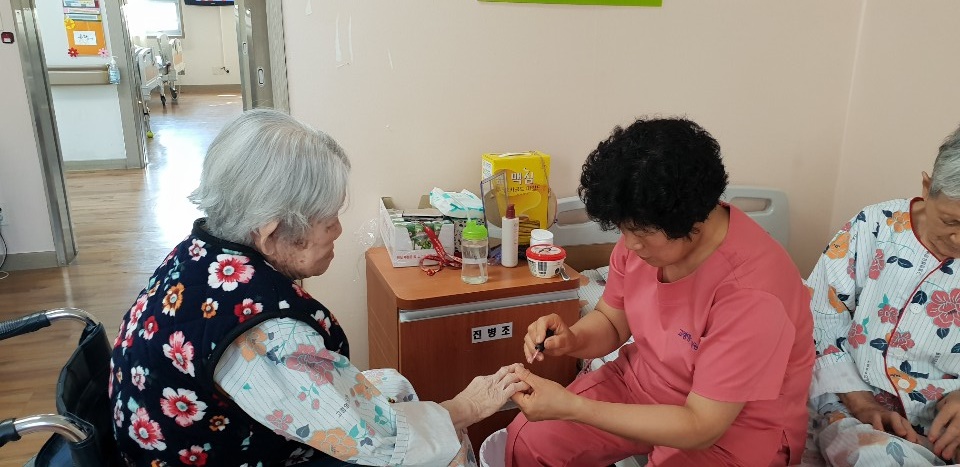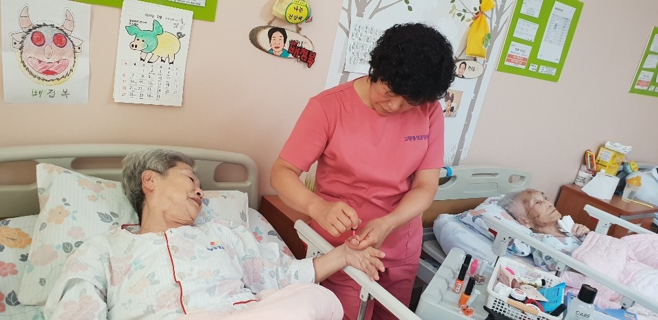 목욕후 보호사님들께 손마사지와 네일 아트를 서비스 받으셨어요 살맛난다~~~ 하시며 기분 쑥쑥~~ |