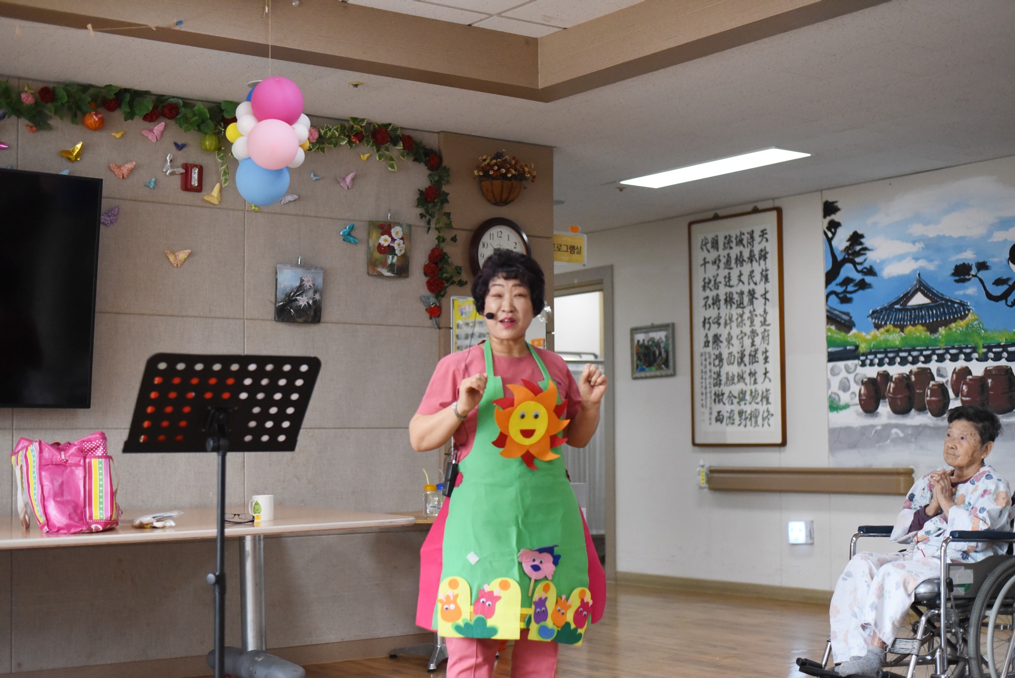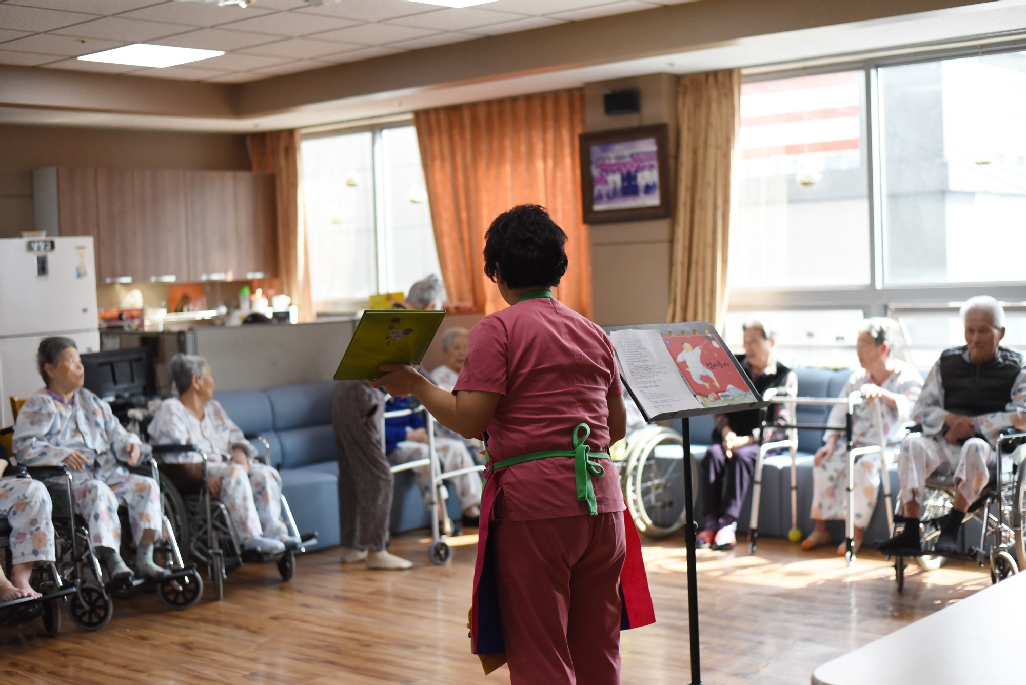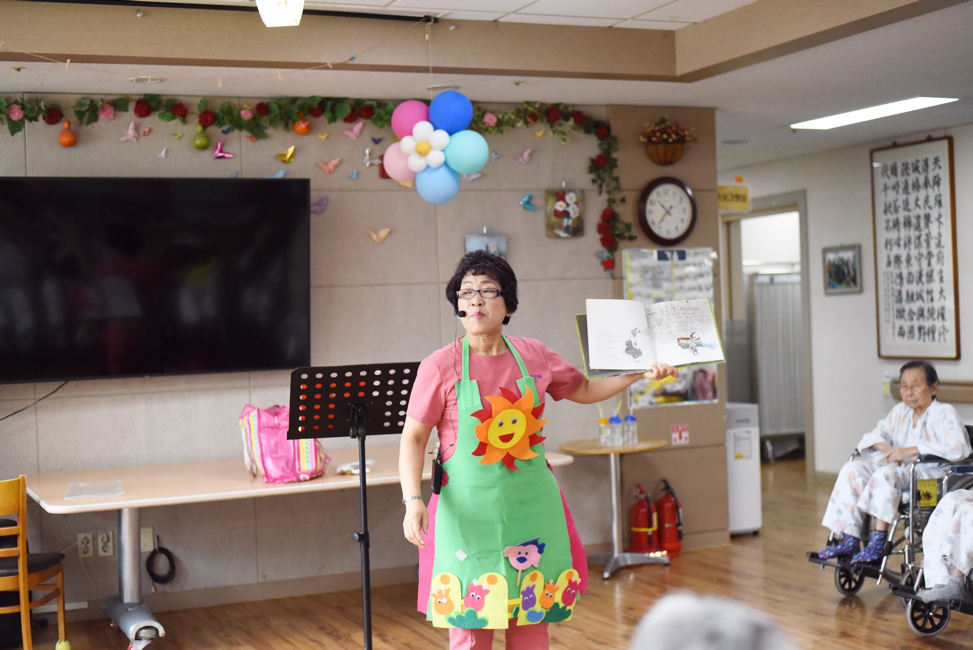 고령영생요양원 요양보호사 손유님 선생님은 어르신을 위해 동화구연 자격증을 따시고 매달 어르신을 위해 동화책을 선별해 손유희와 동화구연으로 도움을 주시고 계십니다. ~`