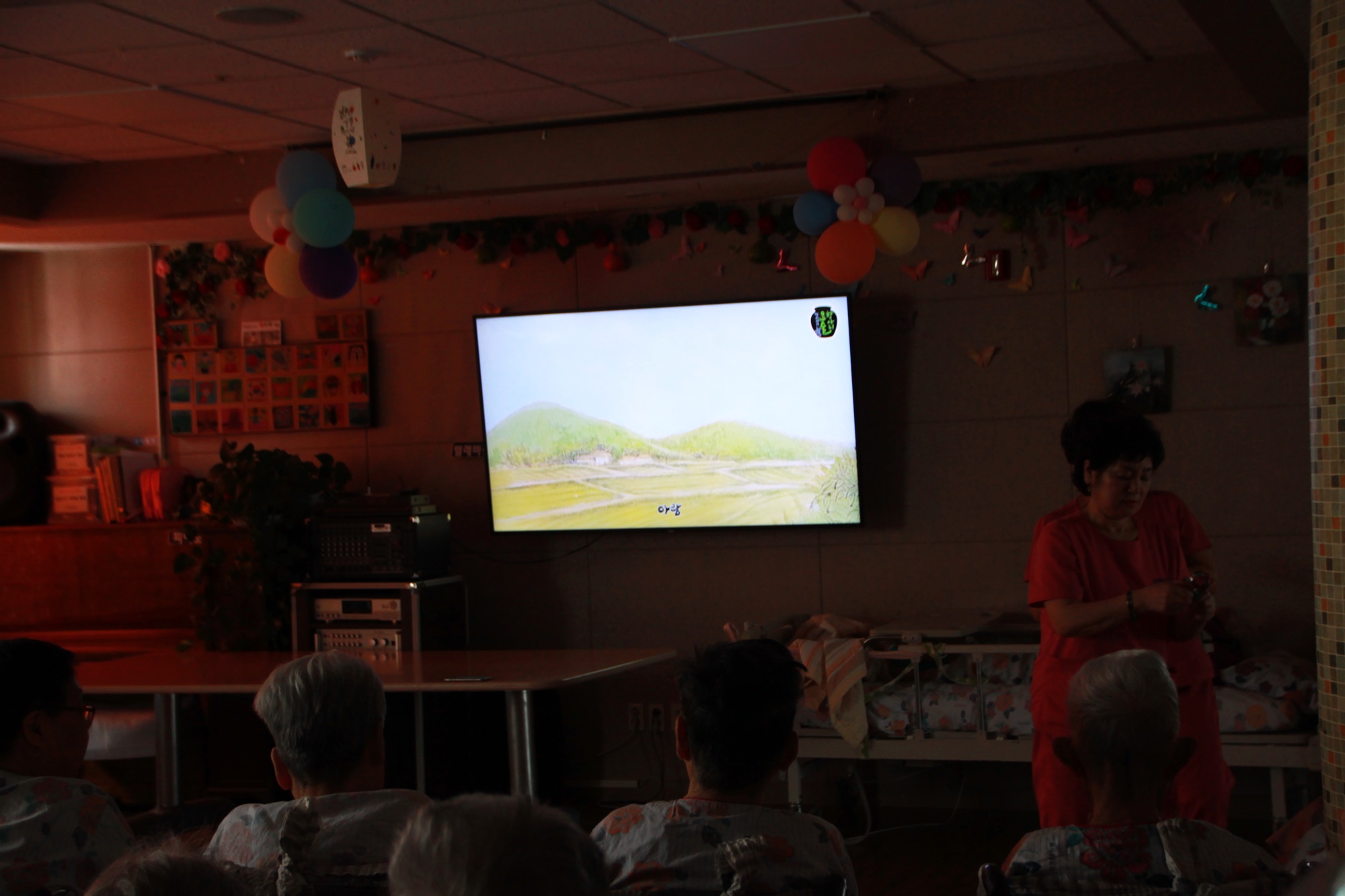 영상으로 움직이는 동화를 지난번 보여 드렸더니 좋아하셔서 오늘 일부 어르신 시장나들이 가시고 그외 계획된 어르신은 움직이는 동화를 시청하심 금도끼 은도끼 , 도깨비 감투를 보시며 옛날 할머니가 엄마가 또는 어르신이 손자 손녀에게 이야기를 들려 주신 것을 회상하시기도 하셨습니다. |