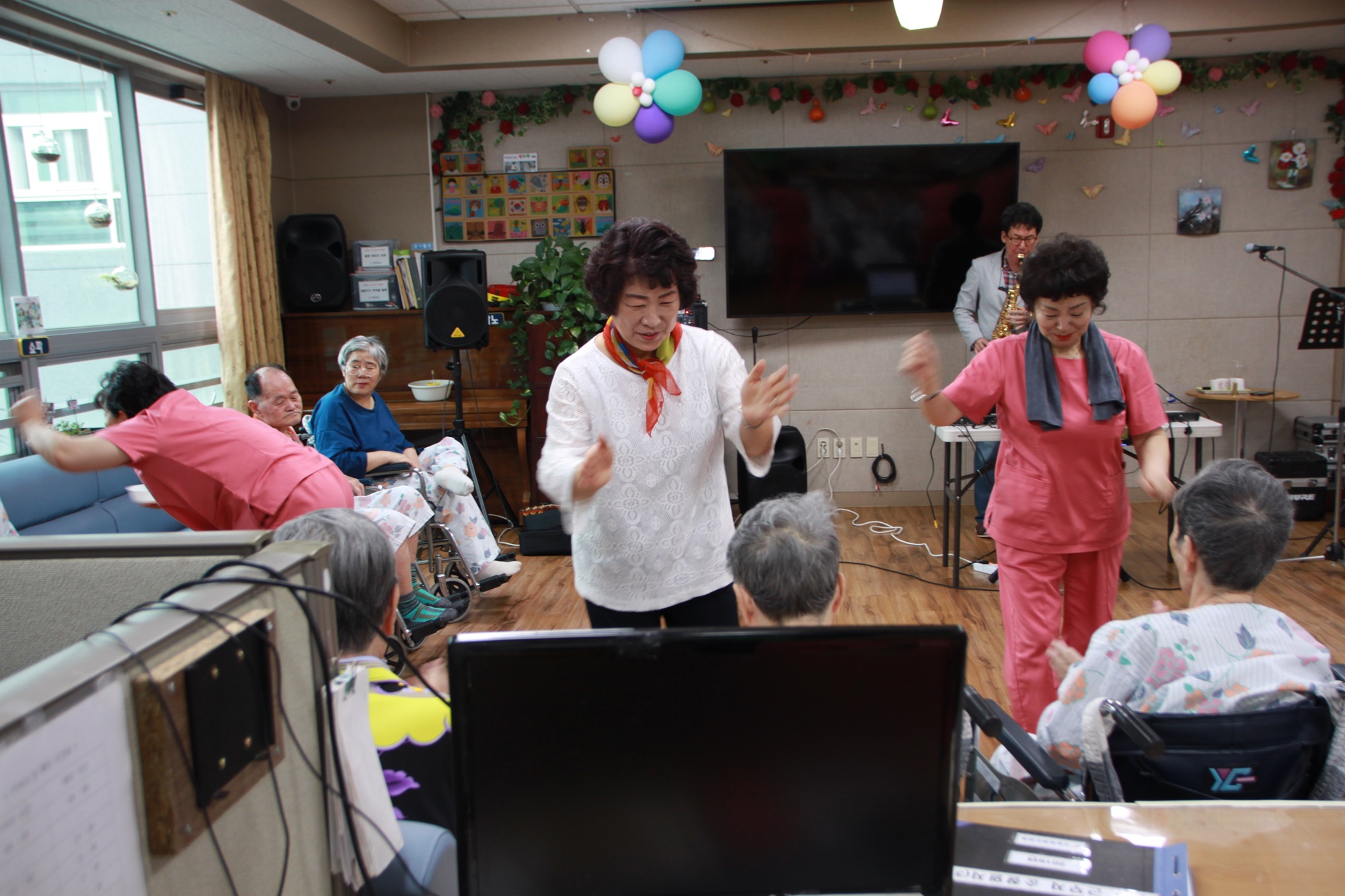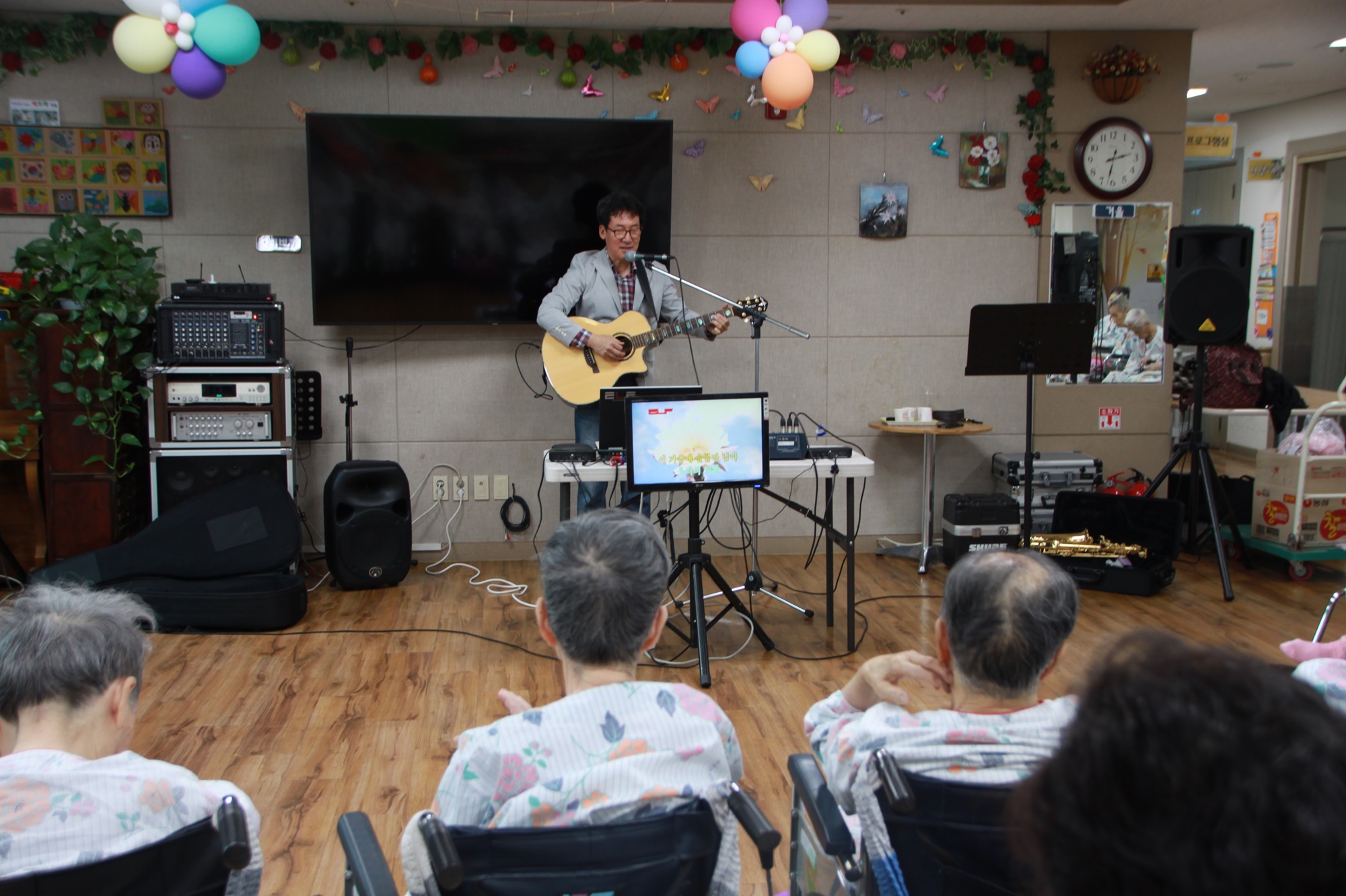 고령영생요양원에서 근무를 하시는 손유민 요양보호사 선생님과 배우자께서 요양원을 찾아 오셔서 즐거운 통기타와 오카리나 섹소폰 공연을 들려 주셨습니다. 또한 김경숙 요양보호사 선생님도 배우신 색소폰공연을 들려주신 시간~~ 어르신들 친숙하신 선생님들께서 공연을 해주시자 저 안정감을 가지시고 즐거워 하셨습니다. 손유님 선생님과 배우자 께서는 어르신들 사이에 인기가 대단하셔서 늘 오시기를 바라고 있습니다. 오늘도 수고해주신 손유민, 김경숙, 그리고 손유민 선생님 배우자님 감사드립니다. |