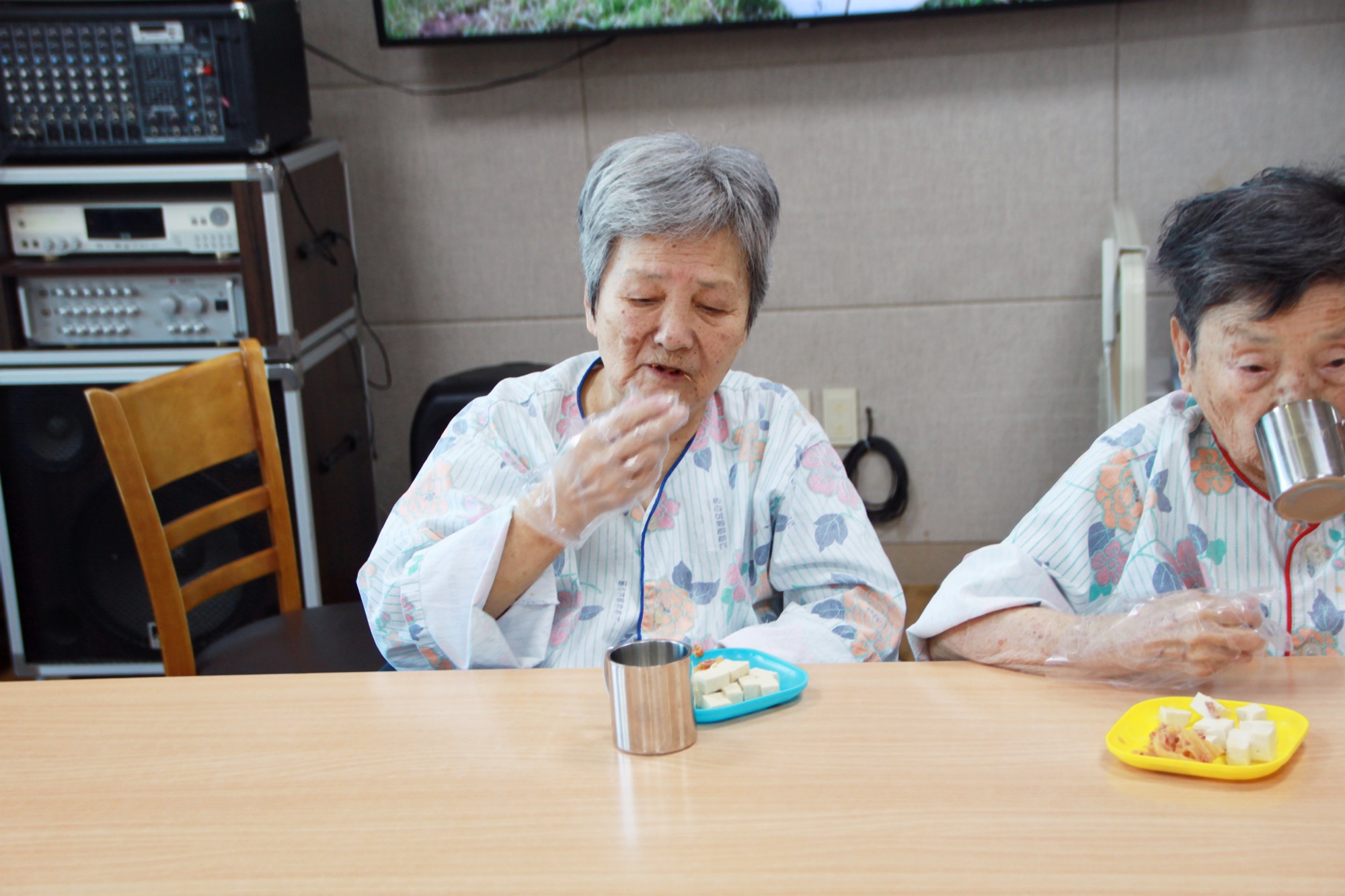 콩고르기 프로그램은 어르신들께서 많이 지루하게 생각하셔서 수행하는 시간은 집중을 해 20분 정도 하고 콩으로 만든 요리를 설명해렸습니다. 콩으로 만든 가공식품중 무엇이 있냐고 여쭈니 두부라고 말씀하셔서 미리 준비해둔 두부와 김치를 드실수 있도록 나눠드렸습니다. 두부를 드시며 콩 단백질과 건강에 대해 이야기를 나누는 시간을 가지니 프로그램을 즐거워하셨는데요 김치는 매우실것 같아서 씻어서 잘 다녀와 참치를 볶아서 드리니 잘드시고 아침햇살 음료수를 막걸리라고 하며 드렸더니 물이다 하시고 웃으신 즐거운 시간을 보냈습니다. |