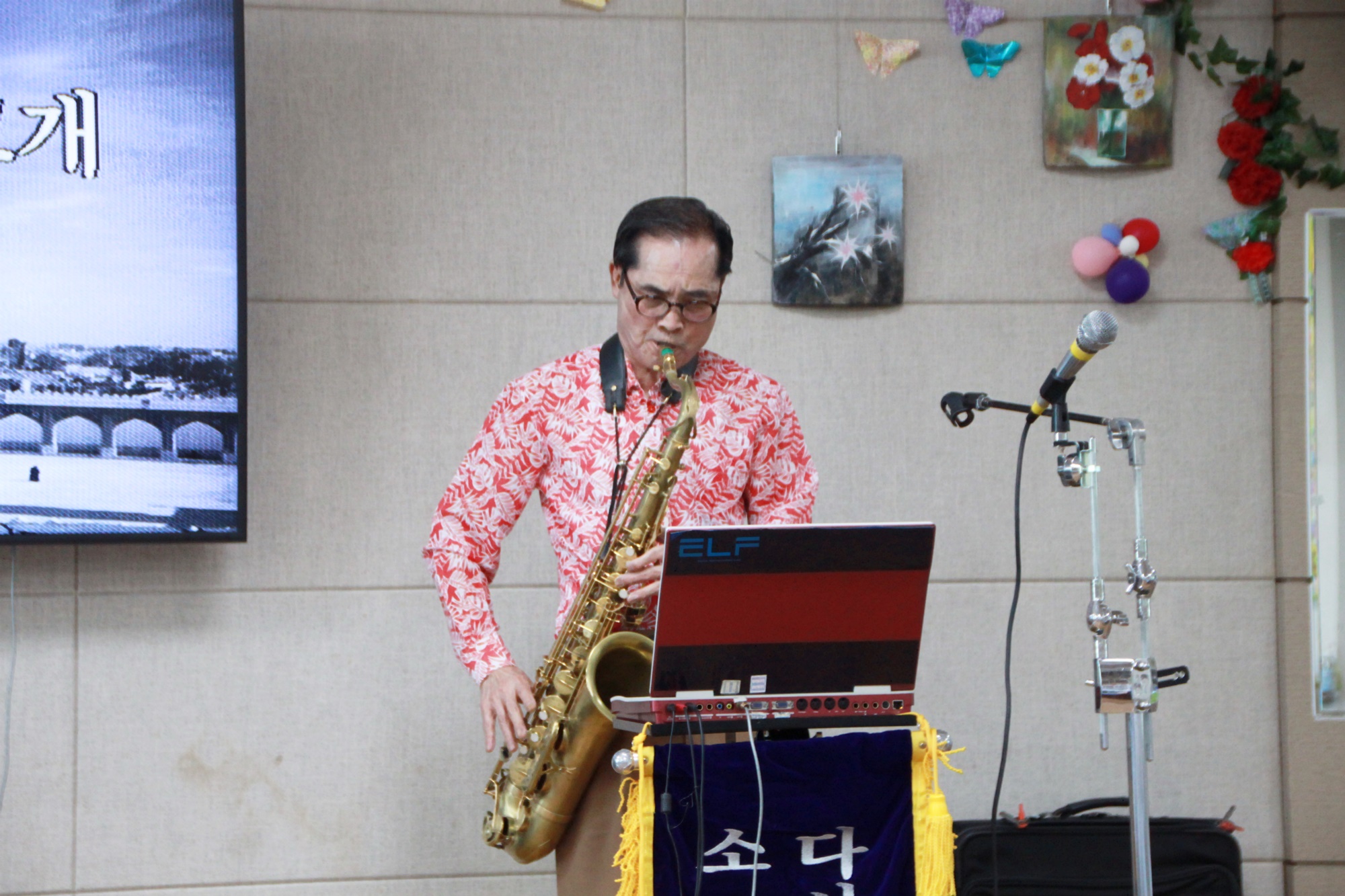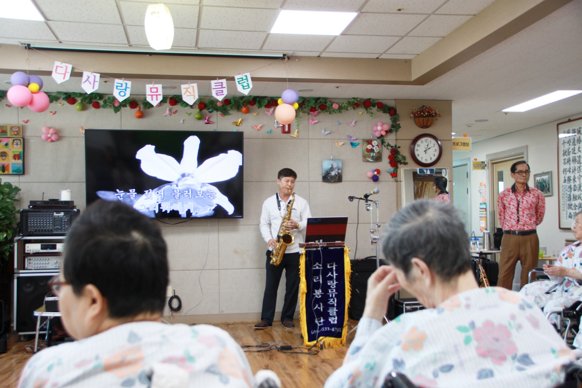 다사랑뮤직클럽 봉사단이 요양원을 매달 방문해 주셔서 흥겨운 시간을 주시고 계십니다. 색소폰 공연과 노래로 여흥의 시간을 주시는데요 늘 어르신의 마음을 헤하려 어르신이 좋아하시는 음악을 준비해 공연 도움을 주시고 계십니다. 어르신들의 노래 시간도 가지고 직원도 함께 하는 시간을 늘 만들어 주시는 다사랑뮤직봉사단 |