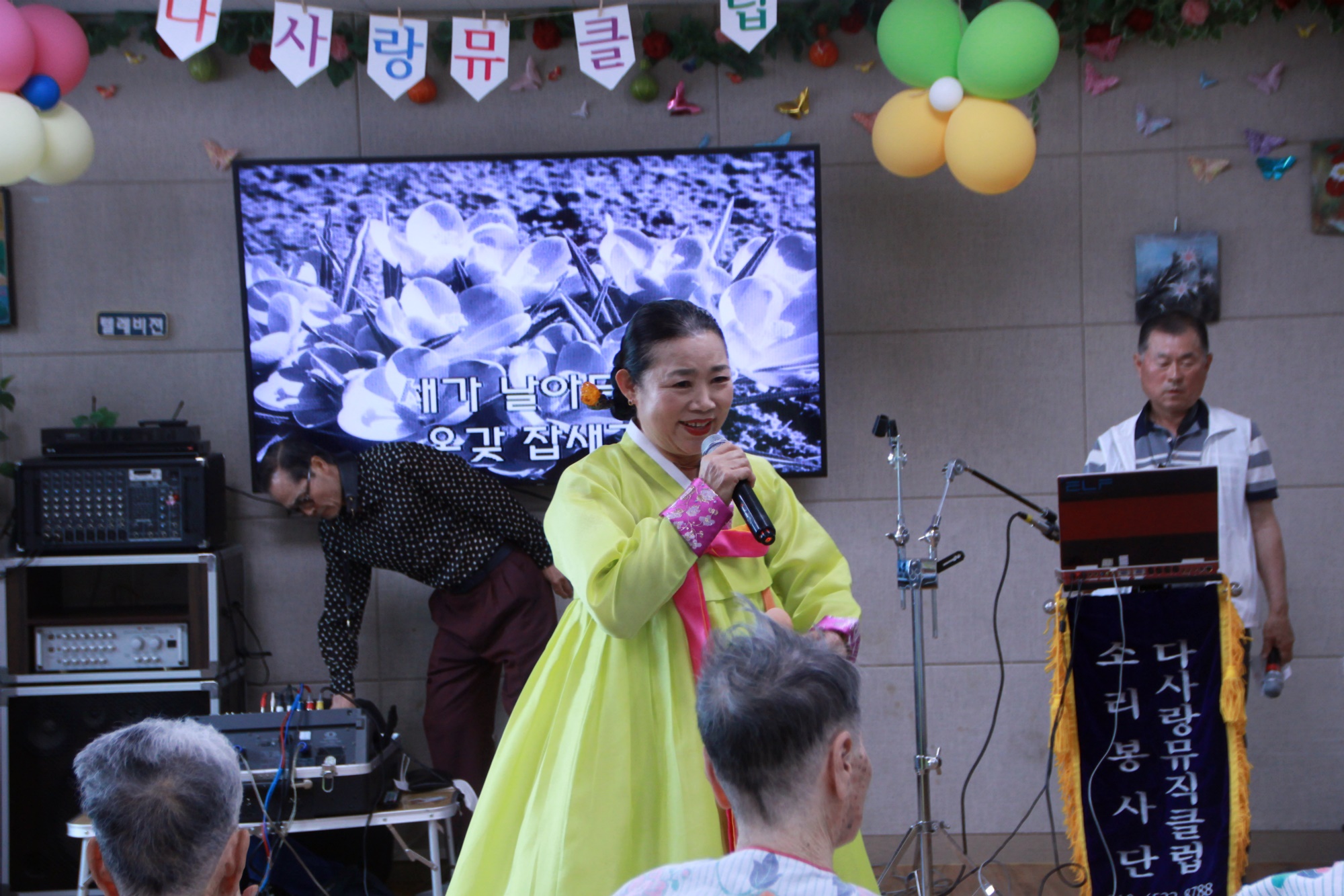 다사랑뮤직봉사단은 매달 요양원을 찾아 주시면서 어르신에게 여흥의 시간을 주십니다. 색소폰과 민요 가요로 어르신들에게 즐거운 시간을 드렸습니다. |