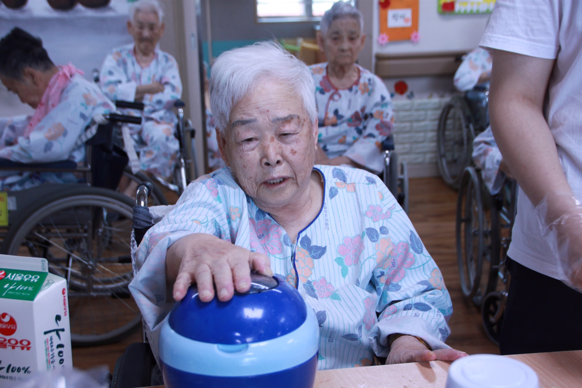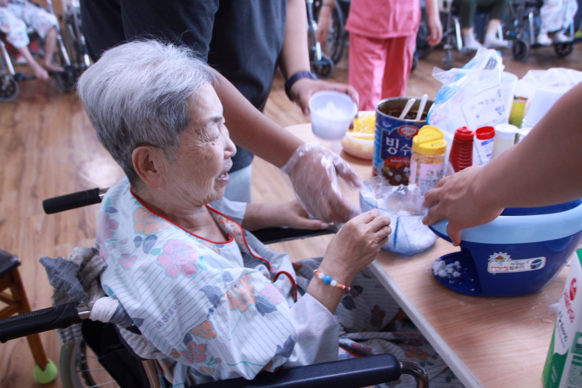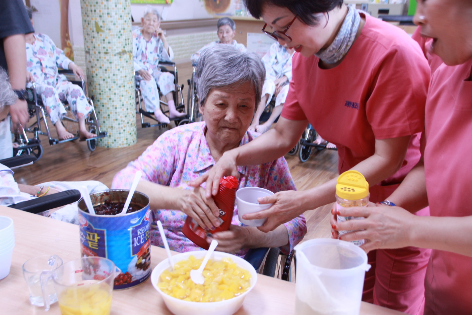 무더위야 물러가라 무더운 날입니다. 오늘 같은날~~ 시원한 얼음으로 더위를 식혀 볼까요 옛날 팥빙수 만들기~ 빙수를 직접 갈아 달달한 팥과 복숭아 연유 미숫가루 콘플러스트 우유를 넣고 쓱쓱 비벼서 먹어요 떡을 드실수 있는 어르신은 떡고 넣어드리고 ~~~` 감기증상과 배탈이 있으신 어르신은 ~~ 죄송합니다. 맛있는 긴식으로 드리겠습니다. 시원함으로 하루를 보낸 날~~ 요리시간 |