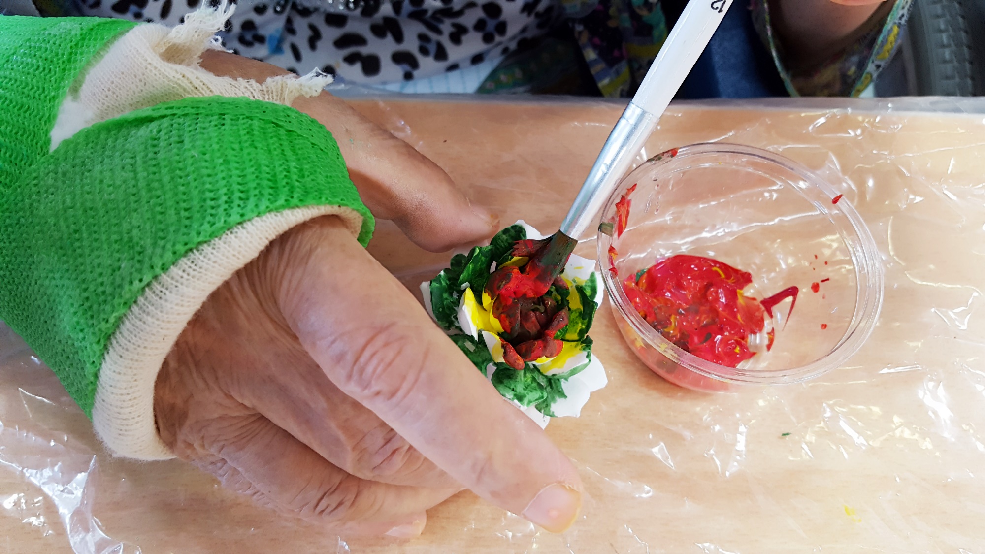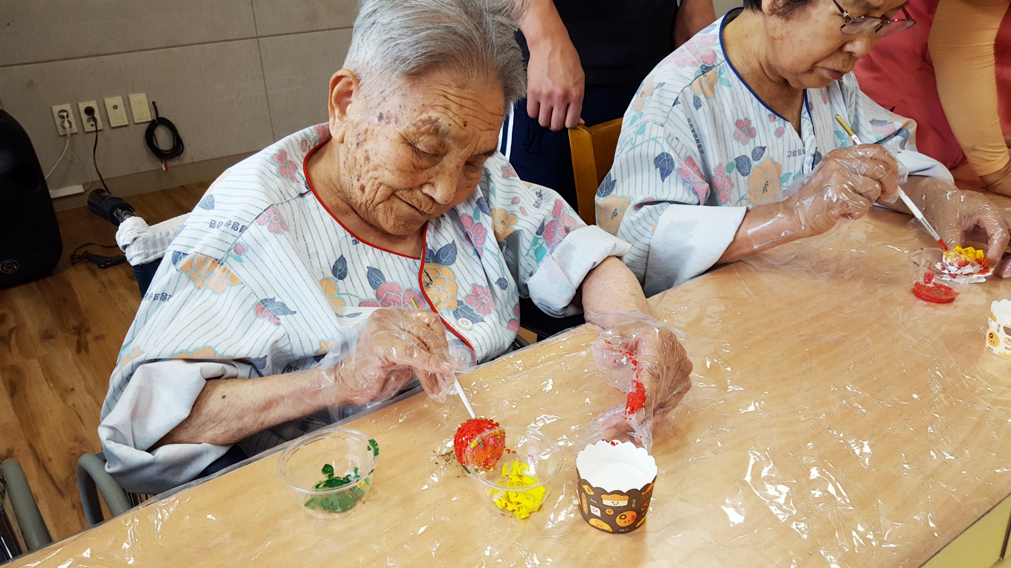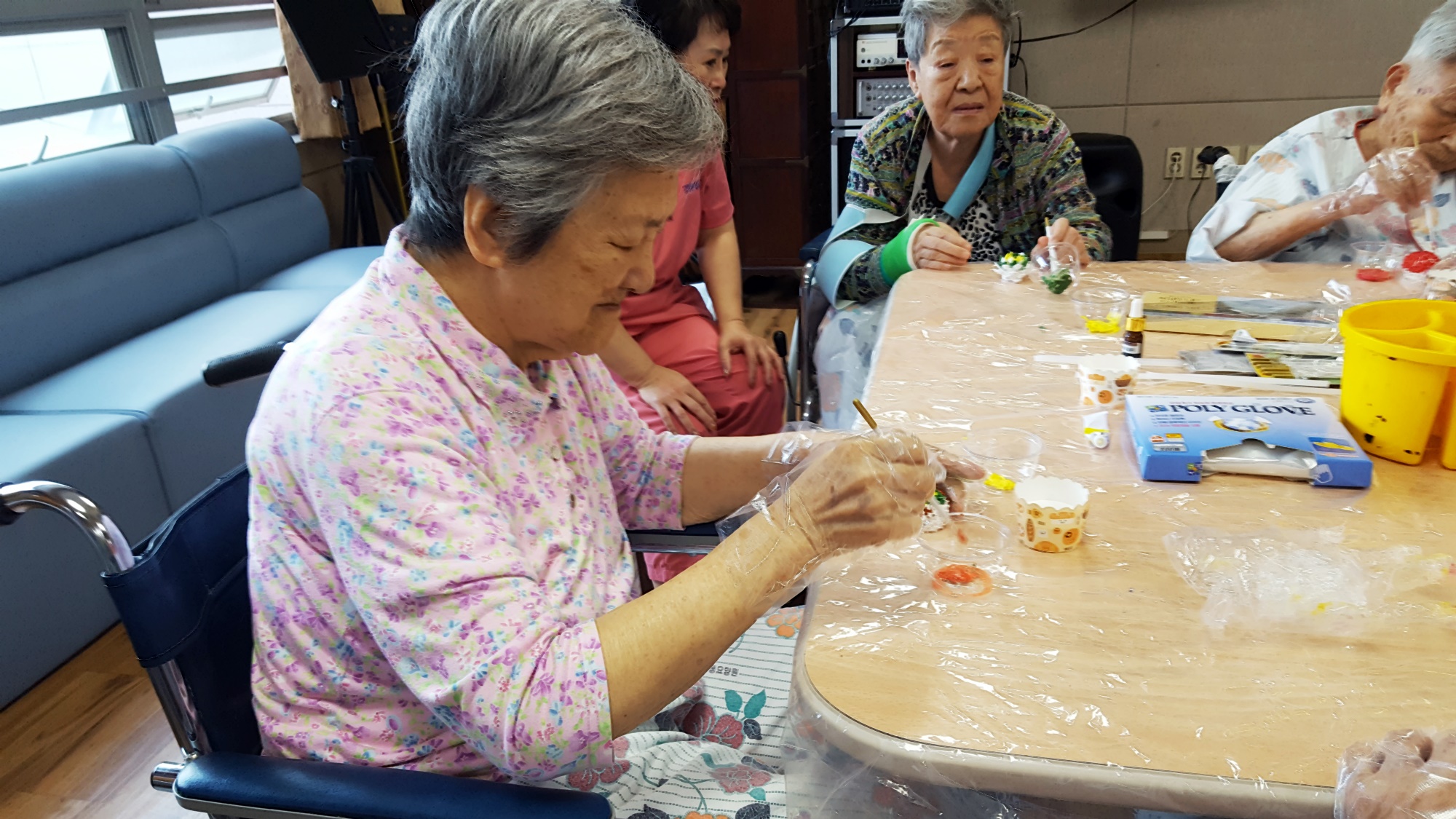 석고와 다육이 몰드를 이용해 미리 모양을 만들어 둔 후 어르신들이 아크릴 물감을 이용해 다육이 방향제 화분을 꾸미는 시간 어르신들 원하시는 색으로 아기자기하게 채색을 하십니다. 화분이 완성되는 모습을 보시면서 만족감과 성취감을 느끼셨습니다. 완성된 다육이방향제 화분을 햇볕이 들어오는 창가에 진열해 두고 프로그램 실에 오실때 마다 만족감을 느끼며 바라 보십니다. |