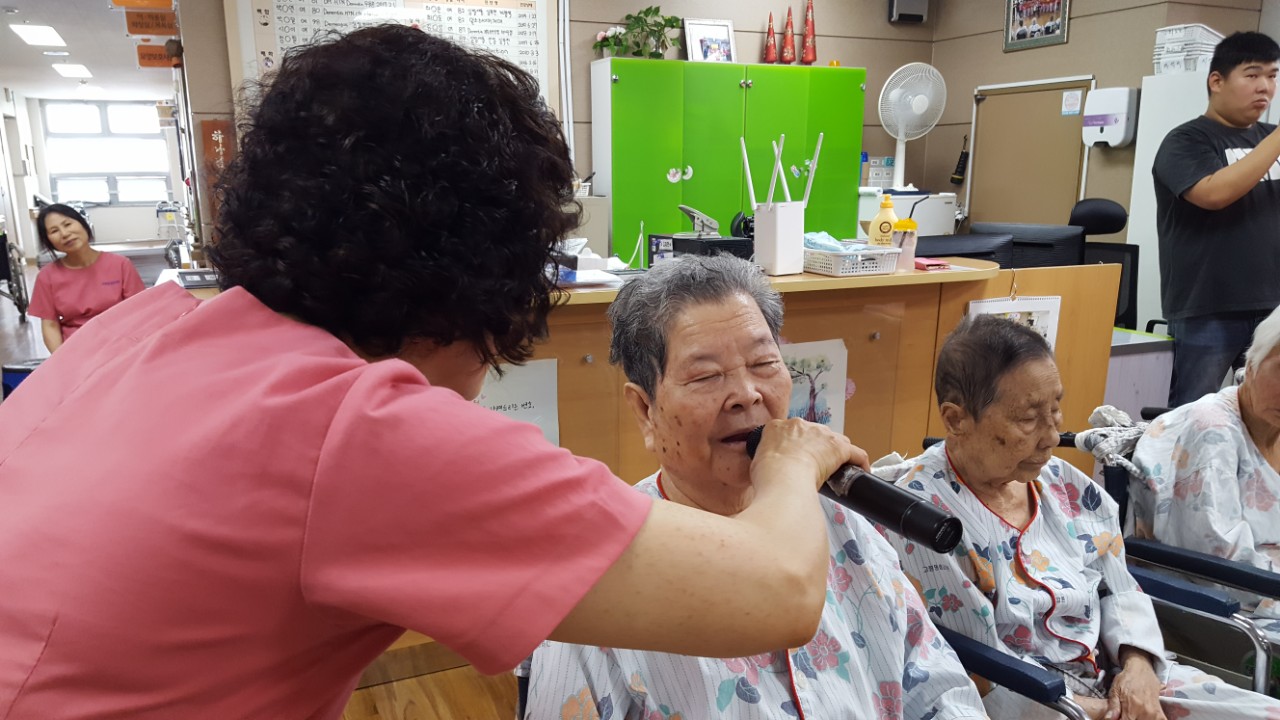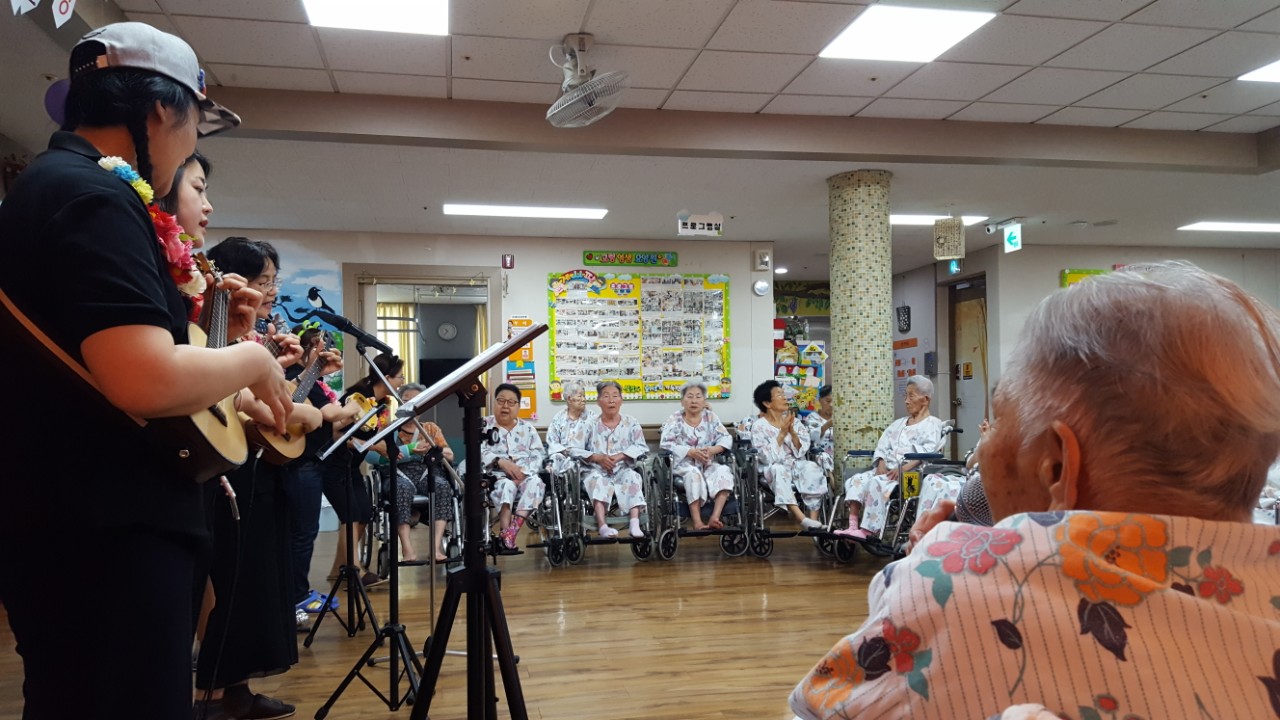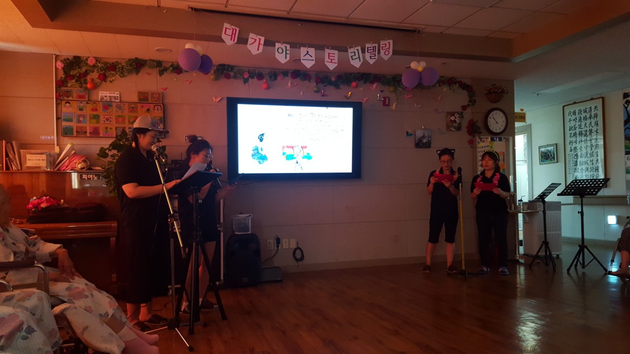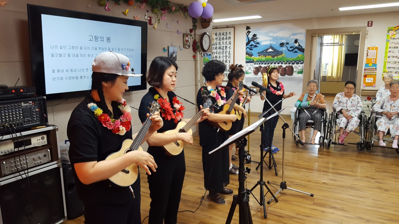 동화를 통해 표현력과 집중력, 기억력을 증진 하여 건강하고 즐거운 생활을 유지드리고자 대가야스토리텔링예술연구회 회원들께서 오셔서 어르신에게 우크렐라 연주와 ppt로 동화구연을 들려 주셨습니다. 알로하~~ 하와이 복장으로 어르신에게 즐거움을 주셨네요 또한 십오야 노래와 함께 율동을 들려 주시며 어르신의 인지 증진 과 노래를 부르시며 자긍심도 가지고 율동 수행으로 즐거운 시간을 보내셨습니다. |