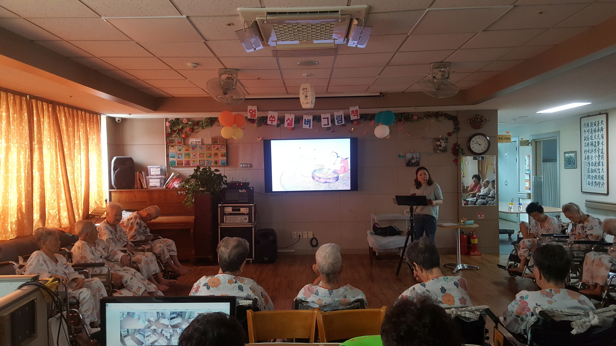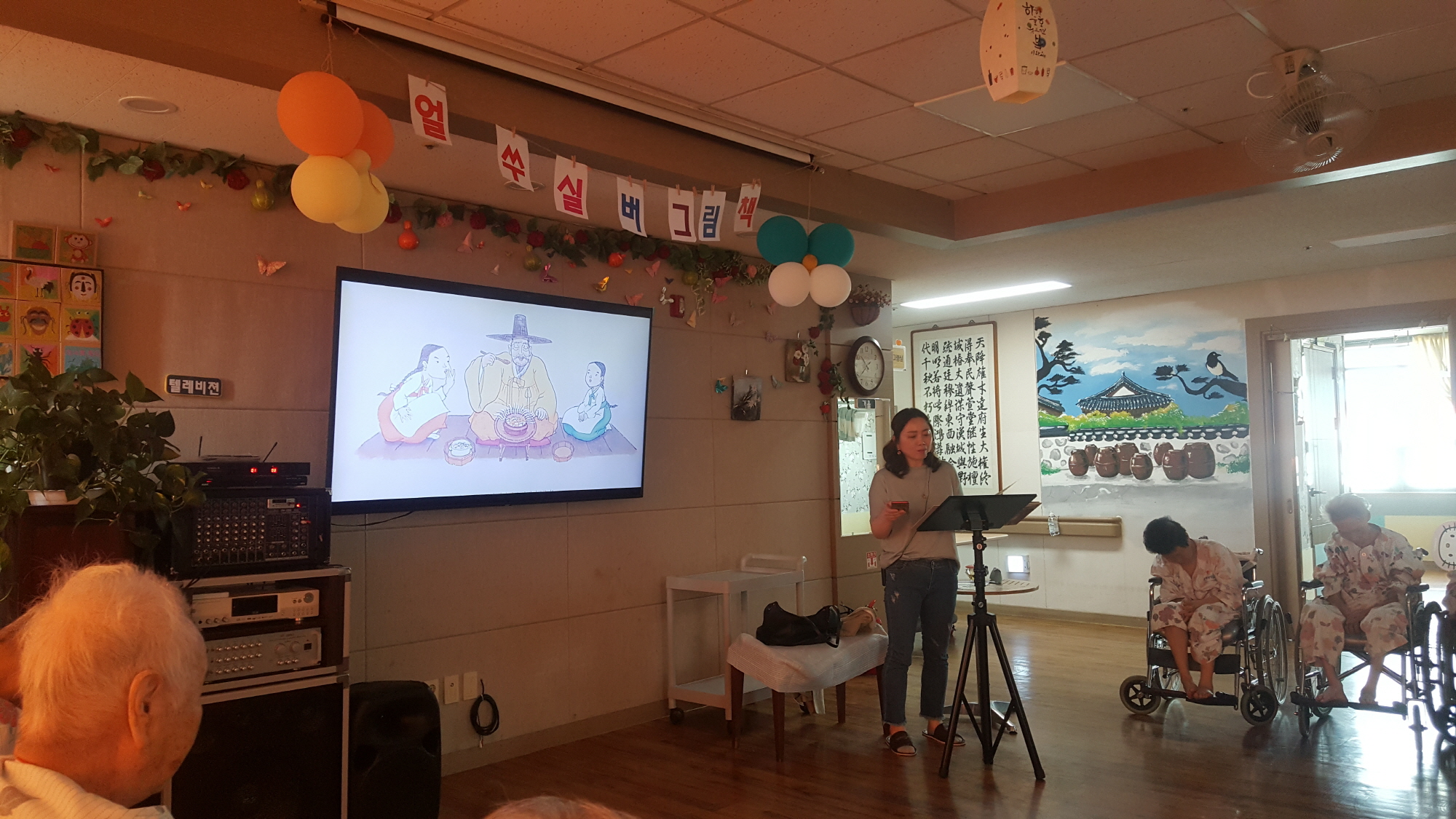 동화를 통해 표현력과 집중력, 기억력을 증진 하여 건강하고 즐거운 생활을 유지드리고자 고령도서관에서 4월부터 20회차로 어르신을 위한 동화구연시간을 주셨습니다 매주 화요일 오전 10시~ 11시까지 이원주 강사와 함께 동화도 들으며 만들기와 손체조등 다양한 활동을 전개 합니다. 된장을 잘 끓이는 딸과 된장을 끓이지 못하는 딸의 이야기로 된장을 담그는 법을 이야기 해주는 어르신 회상을 자극하는 이야기를 들려주셨습니다. 할머니의 된장맛은 미원~~ 이라는 결론을 내면서 웃음바다가 되었습니다. |