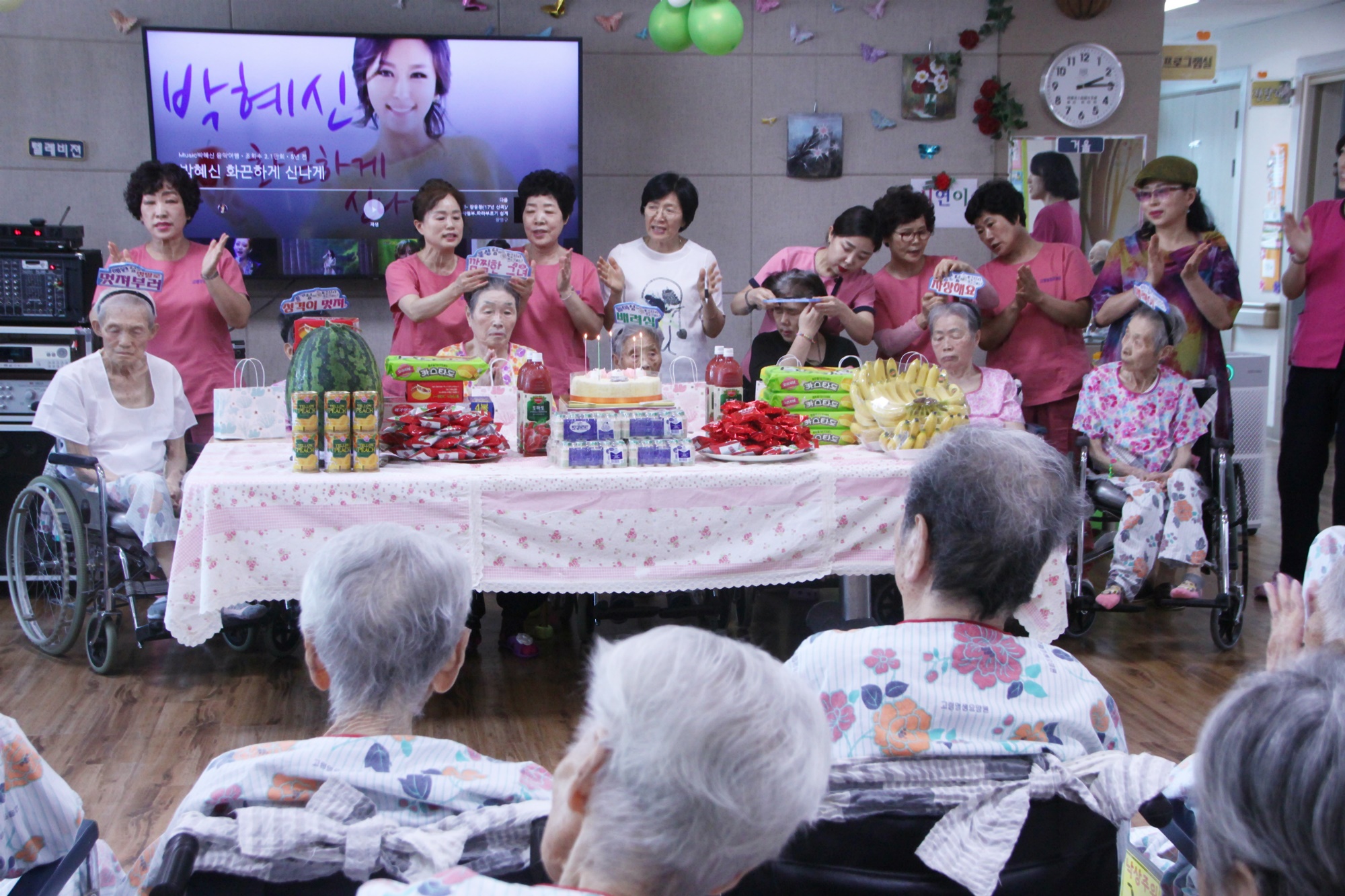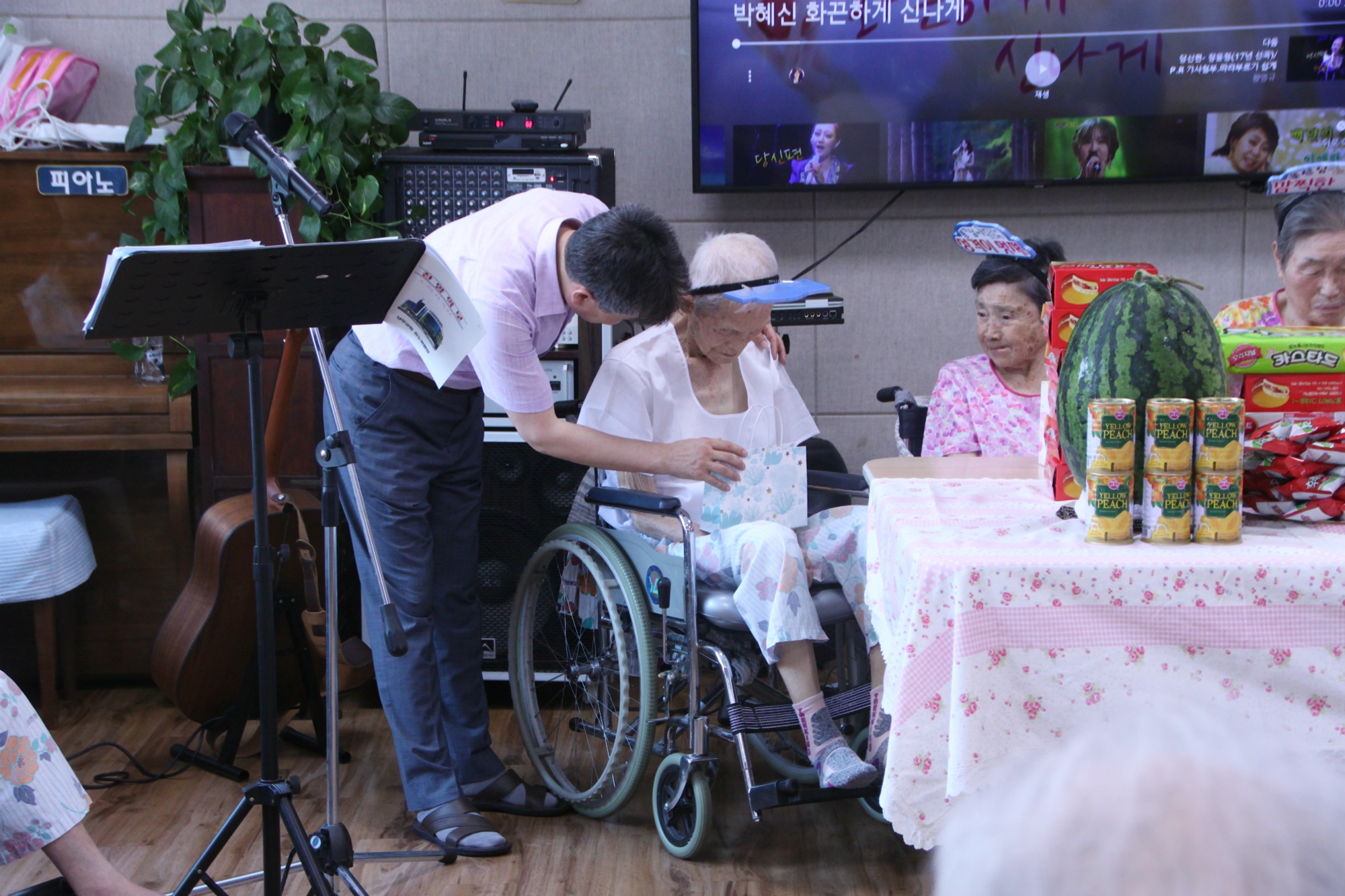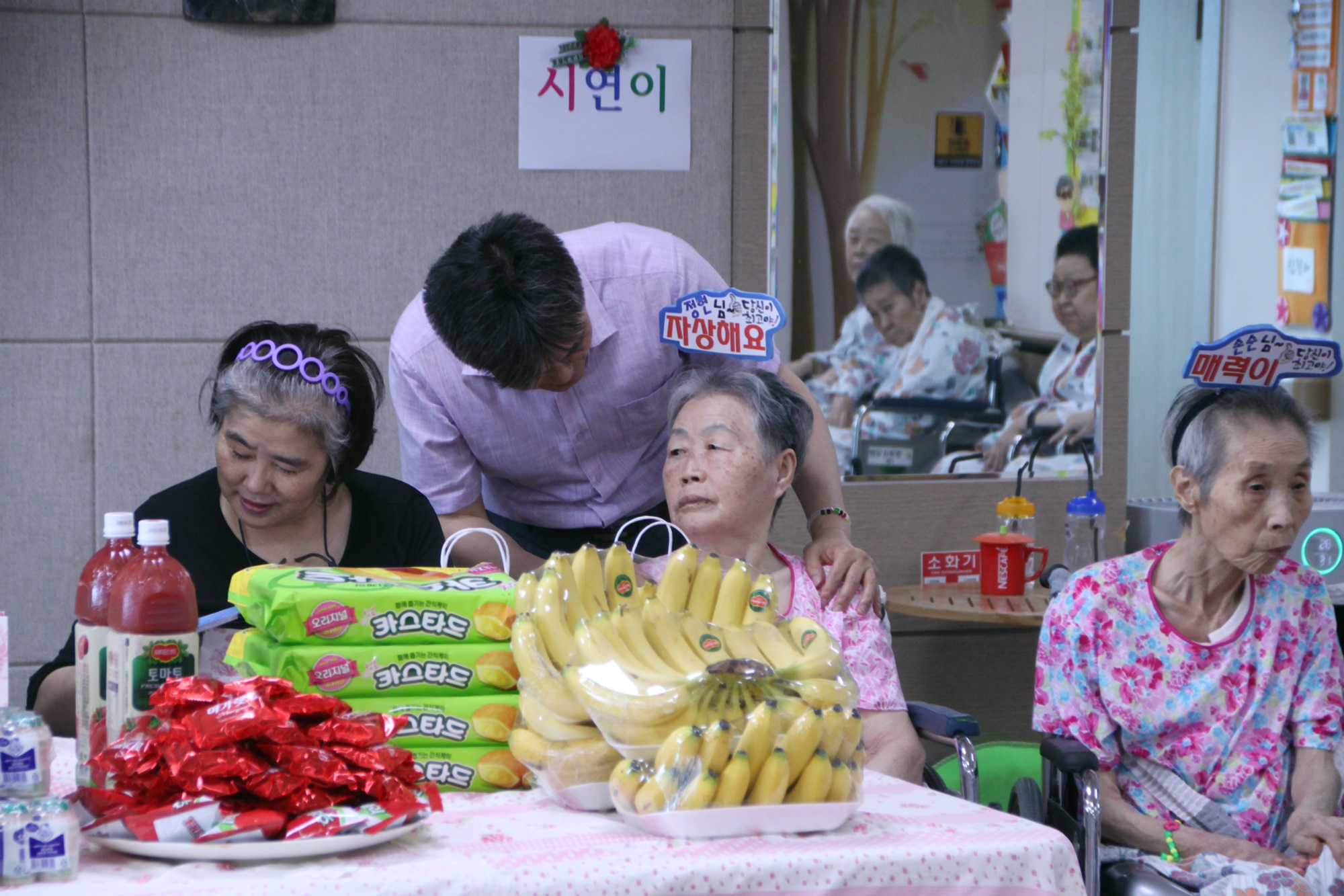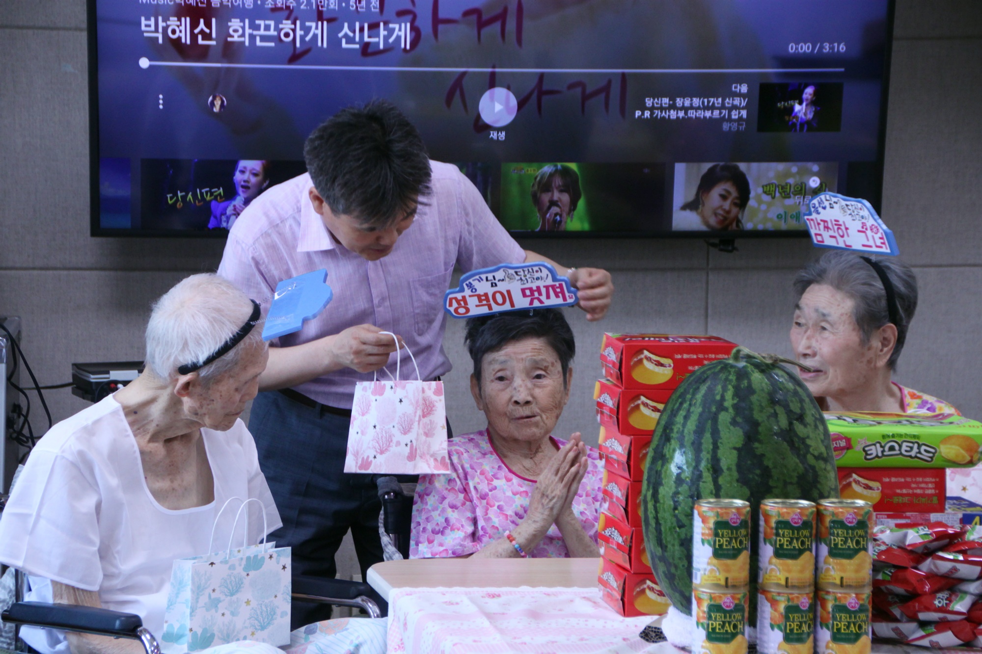 8월 생신어르신 강해원, 남은희, 박정연, 배돌이,석봉기, 정을선, 한손순 어르신 생신이십니다. 더운날 태어 나신다고 힘드셨네요 선물로 시원한 모시옷과 티셔츠를 준비해 드렸습니다. 머리띠는 귀욤귀욤 폭팔~~ 메세지를 담아 어르신들의 마음을 즐겁게 해드렸어요 고령영생요양원 선생님들이 공연을 재미있게 준비해 주셨습니다. 원장님 기타와 물리치료선생님의 춤과 노래 손유민 선생님 동화구연 김경숙 선생님 섹소폰연주 공익들의 신나는 댄스와 춤으로 즐거운 시간을 가졌습니다. 끼가 넘치는 고령영생요양원 직원들과 어르신들~~뿡뿡 고령영생요양원의 생신잔치는 가족참여 프로그램으로 늘 가족분들이 생신날 방문하셔서 함께 추억을 만드는 날입니다. |