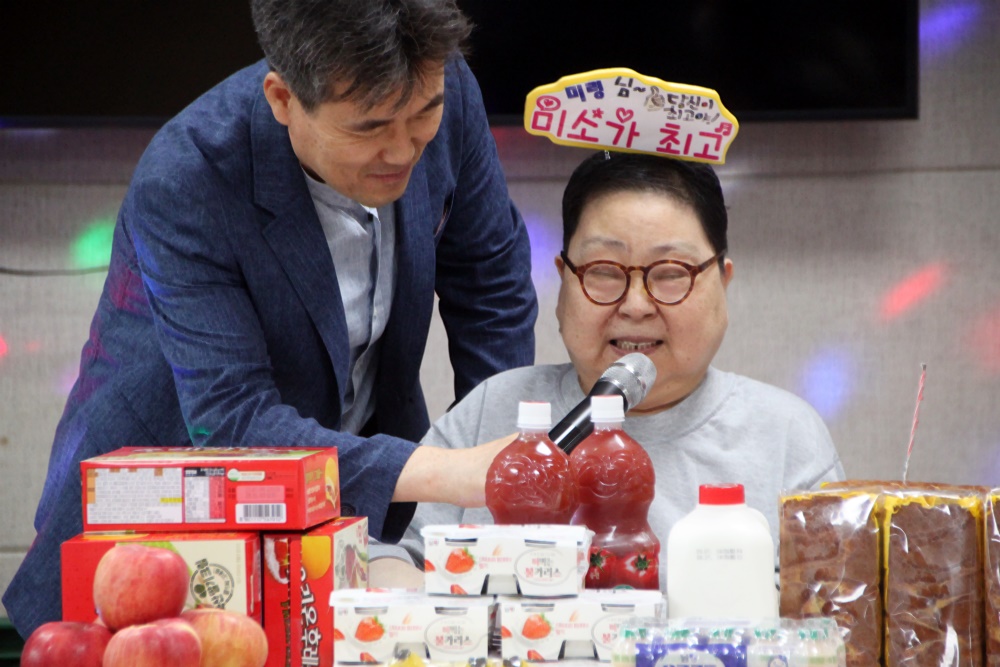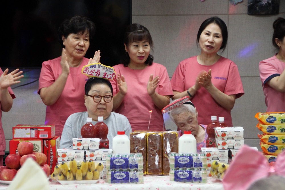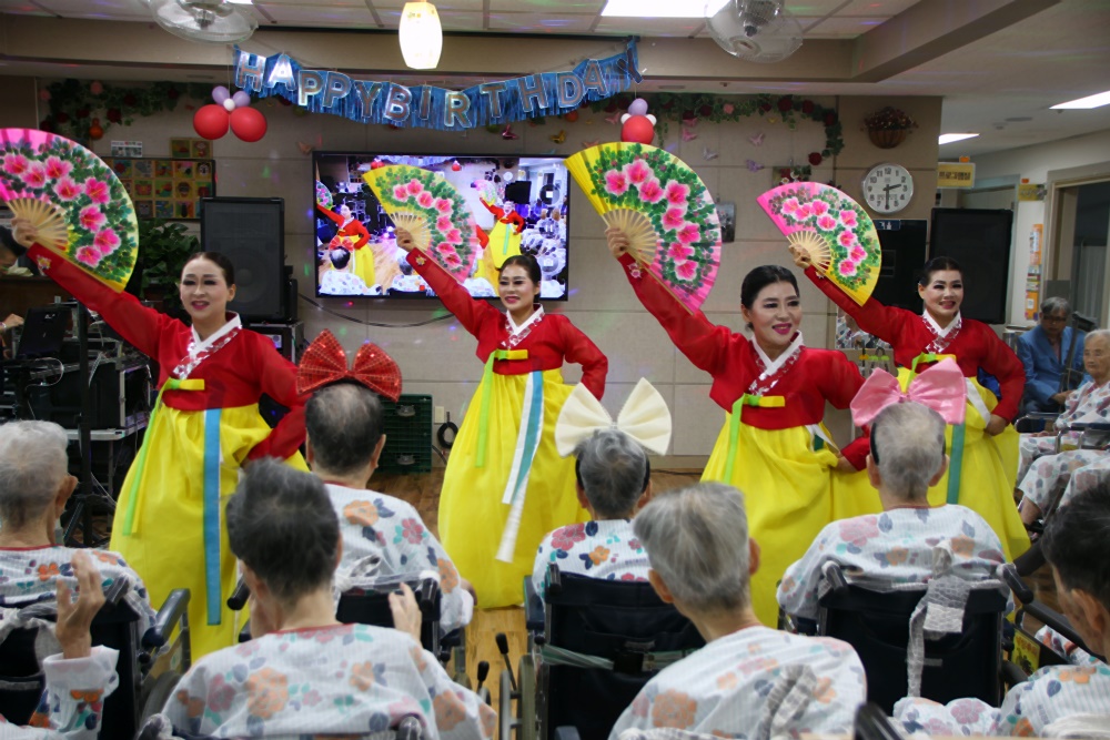 9월 생신어르신 신00, 김00 어르신 생신이십니다. 더운날 태어 나신다고 힘드셨네요 선물로 시원한 모시옷과 티셔츠를 준비해 드렸습니다. 머리띠는 귀욤귀욤 폭팔~~ 메세지를 담아 어르신들의 마음을 즐겁게 해드렸어요 가인회에서 11명의 가수들이 함께 오셔서 어르신 생신을 축하 해드렸습니다 멋진 맨트와 노래 댄스로 어르신들 향연의 시간을 보내셨습니다. 고령영생요양원의 생신잔치는 가족참여 프로그램으로 늘 가족분들이 생신날 방문하셔서 함께 추억을 만드는 날입니다. 생활실에 계시는 어르신들께는 음식을 준비해 전달해드리며 함께 참여하시도록 함 |