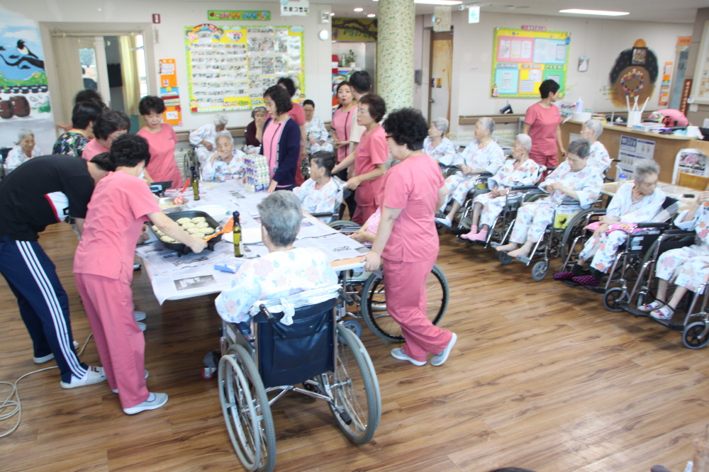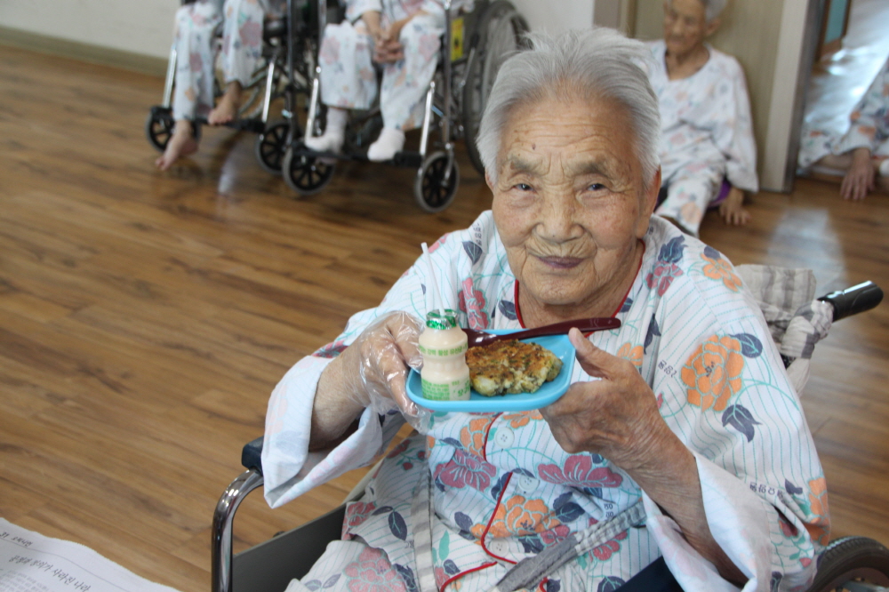 녹두빈대떡 만들기 어르신과 활동 인사를 나누고 손을 깨끗하게 씻고 앞치마를 하신 후 녹두가루와 부침가루를 혼합해 손을 저어보며 신체활동을 하셨습니다. 어릴적 녹두전을 맛있게 먹었던 추억을 회상하며 만드신 녹두전을 맛보시며 간식으로 드셨습니다. |