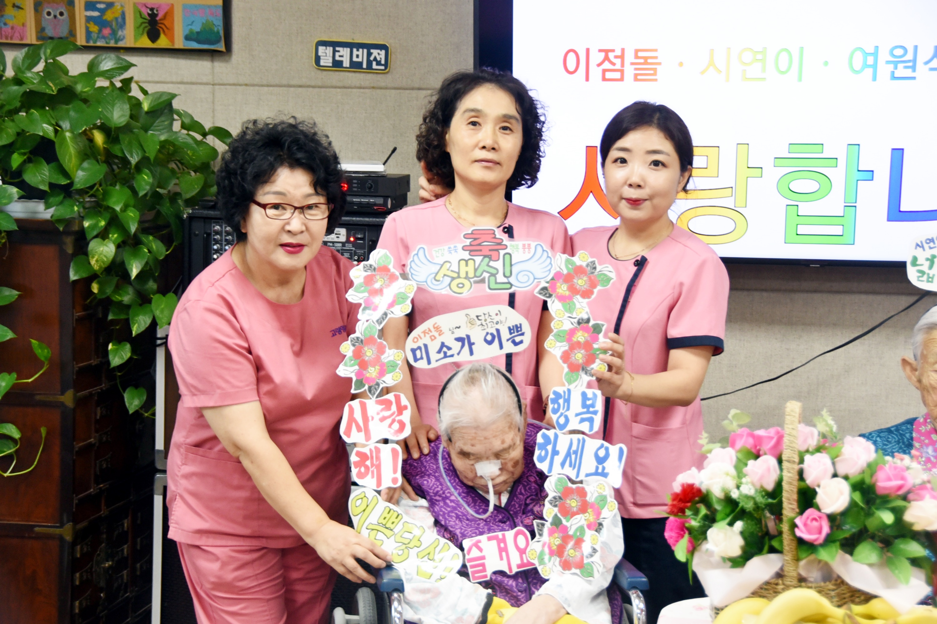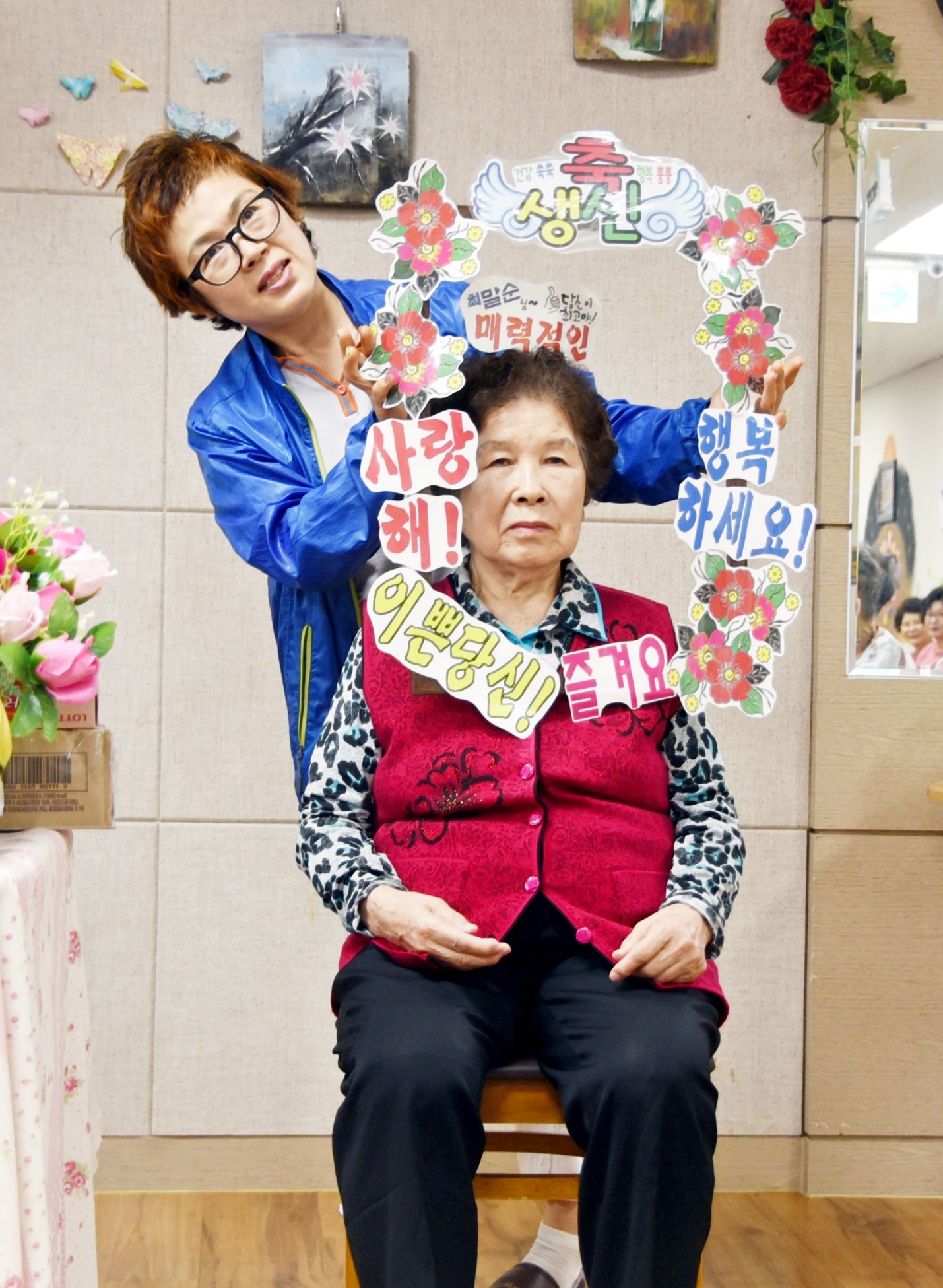 시00, 이00, 여00, 최00 어르신 10월 탄생을 축하드립니다. 최00 어르신과 시00 어르신의 케이크 떡 바나나 찬조에 감사드리며 어르신들과 맛있는 음식을 함께 드셨습니다. 생신 액자를 만들어 추억 사진을 담아 봅니다. 어르신에게 따뜻한 조끼를 선물로 드리고 항상 건강하기 바라는 맘을 담아 덕담을 말씀해주시는 김영규원장님~~~ " 어르신들 늘 지금처럼 행복한 삶을 사셔야합니다. 그러실 자격이 충분히 계시니까요" 추임새에서 어르신 생신잔치를 축하 드리기 위해 태풍을 뜷고 오셔서 좋은 공연을 함께 해 주셨습니다. 감사드립니다.