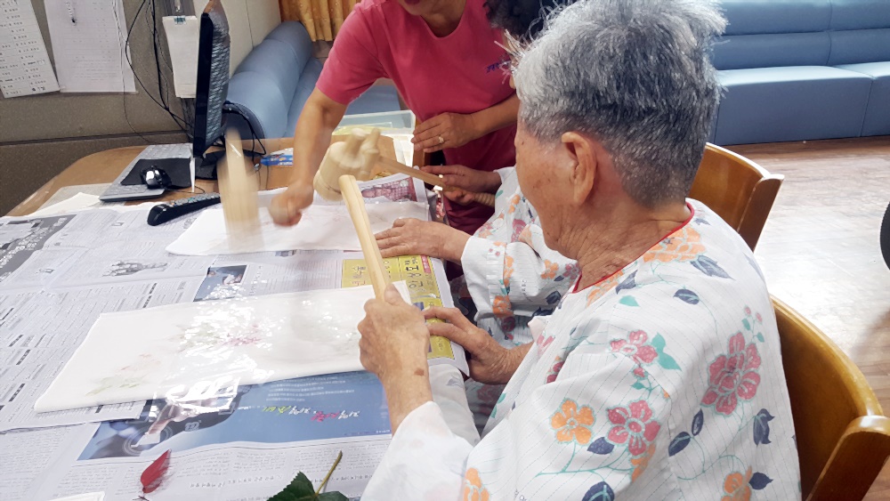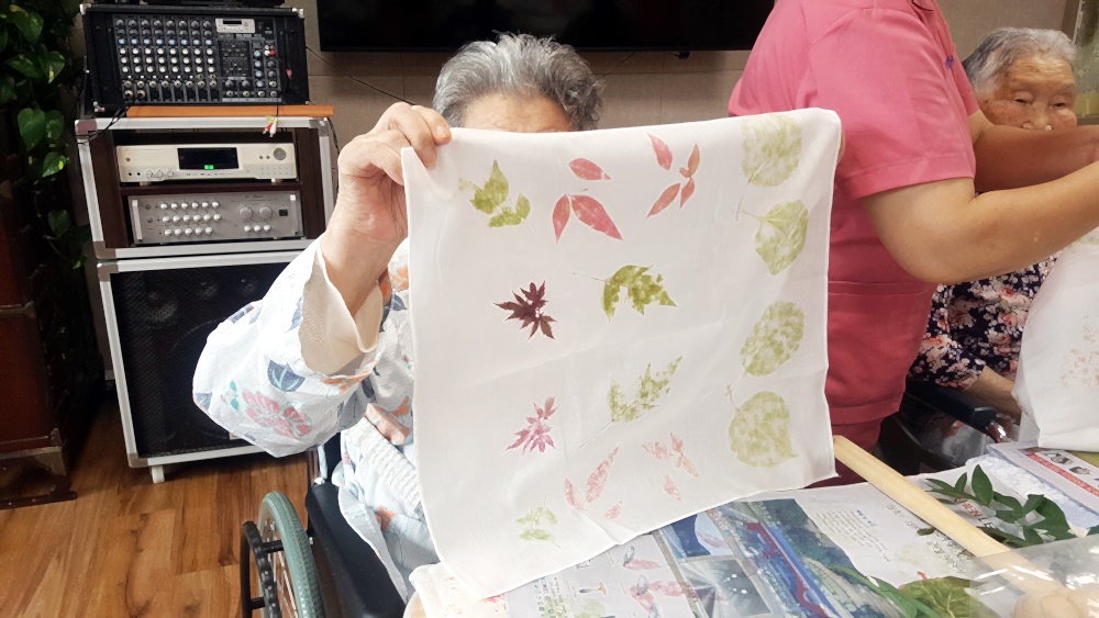 자연염색 ~ 단풍잎을 이용해 손수건을 염색해보는 체험으로 자연물 이용 프로그램입니다. 단풍이 물드는 가을에 하기 좋은 프로그램 알록 달록 단풍잎을 준비해 하얀 손수건에 꾸민 후 고무망치를 이용해 두들겨 단풍잎을 물들이는 기법으로 소근육 활동과 단풍잎이 물든 손수건을 보시며 가을을 느껴보는 시간을 가져 봤습니다. 단풍잎이 물드는것을 보고 신기하다고 하시며 알록달록 단풍잎이 보고 가을 왔다고 하심 세부진행사항 1. 해당그룹 어르신들을 안전하게 해당 층으로 이동한다. 2. 휠체어 어르신들께서는 원을 만들며 자리를 만든다. 3. 워커 활용 어르신들께서 앉으실 수 있도록 의자를 준비한다. 4. 어르신들과 진행자가 서로 인사를 나눈다. 5. 진행하게 될 손수건 염색에 대해서 설명을 드린다. 6. 염색 후 어떻게 되는지를 설명을 드린다. 7. 준비물을 종류별로 1인당 1개씩 나눠 드린다. 8. 단풍잎을 자유롭게 꾸밀수 있도록 유도한다. 9. 각자 오늘 진행한 프로그램에 대해서 소감을 들어본다. 10. 참여 해주신 것에 대해 감사인사를 드리며 프로그램을 마친다. |