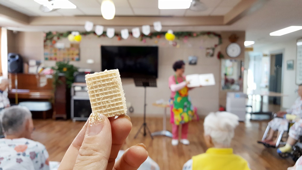 손유민과 함께 하는 동화시간 창작 동화보다 옛날 이야기를 좋아하시는 어르신들을 위해 늘 동화를 선별해 오십니다. 책을 미리 선정해 재미나게 읽어 주셨습니다. 어르신들은 익숙하신분들의 공연도 좋아하셔서 손유민선생님께서 진심을 담아 들려주시는 동화구연은 인기 시간입니다. 오늘은 어르신의 인지를 쑥쑥 올려드리기 위해 퀴즈선물과 과자를 나눠드려 더 집중력있는 동화구연 시간이 되었습니다. 어르신의 관심에 감사드립니다. |