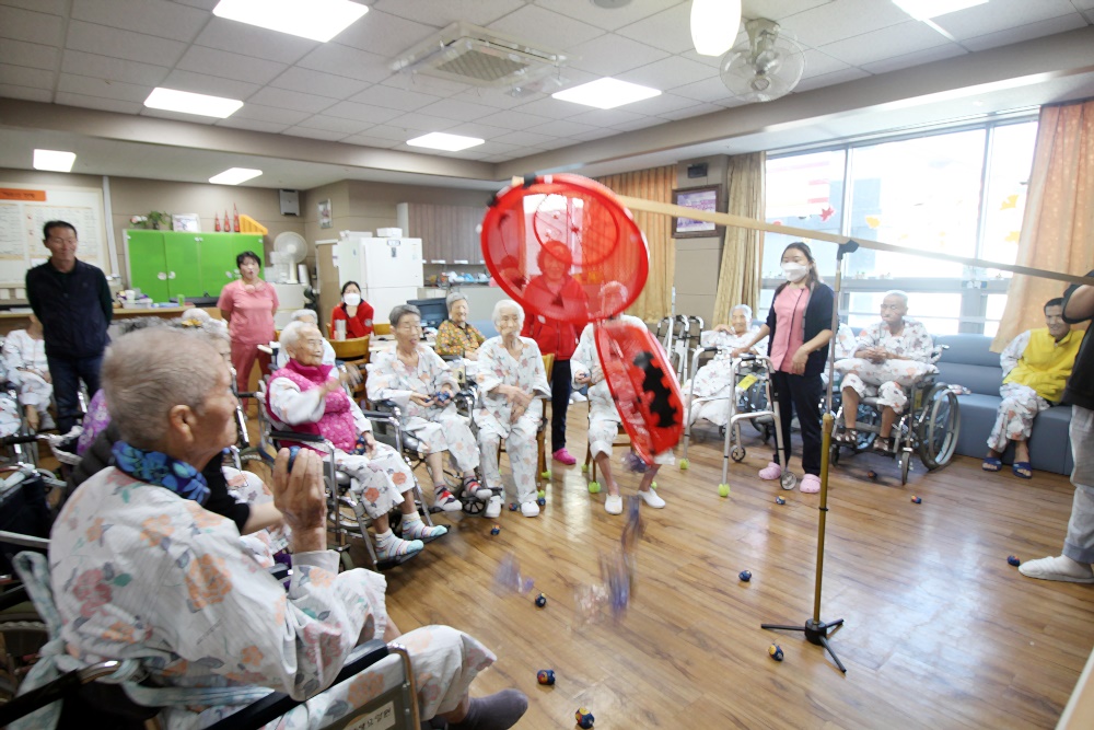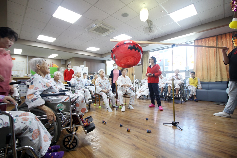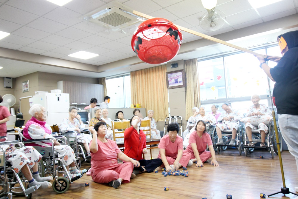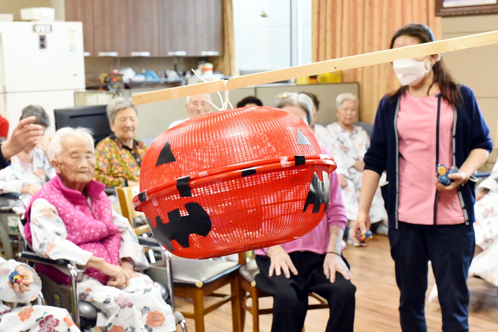 고령영생요양원 할로윈데이 축제가 열렸습니다. 호박모양 박터트리기를 준비해 과자를 넣고 어르신들과 추억의 게임 오자미 던지를 진행했습니다. 손자들이 운동회때 하던 추억을 떠올리시며 직접 해보기는 처음이지만 재미있다고 하셨습니다. 게임 후 느낀 점을 이야기 하며 어릴적 손자의 모습을 회상해 보는 시간과 손근육 활동으로 재미있는 게임을 즐겼습니다. |
