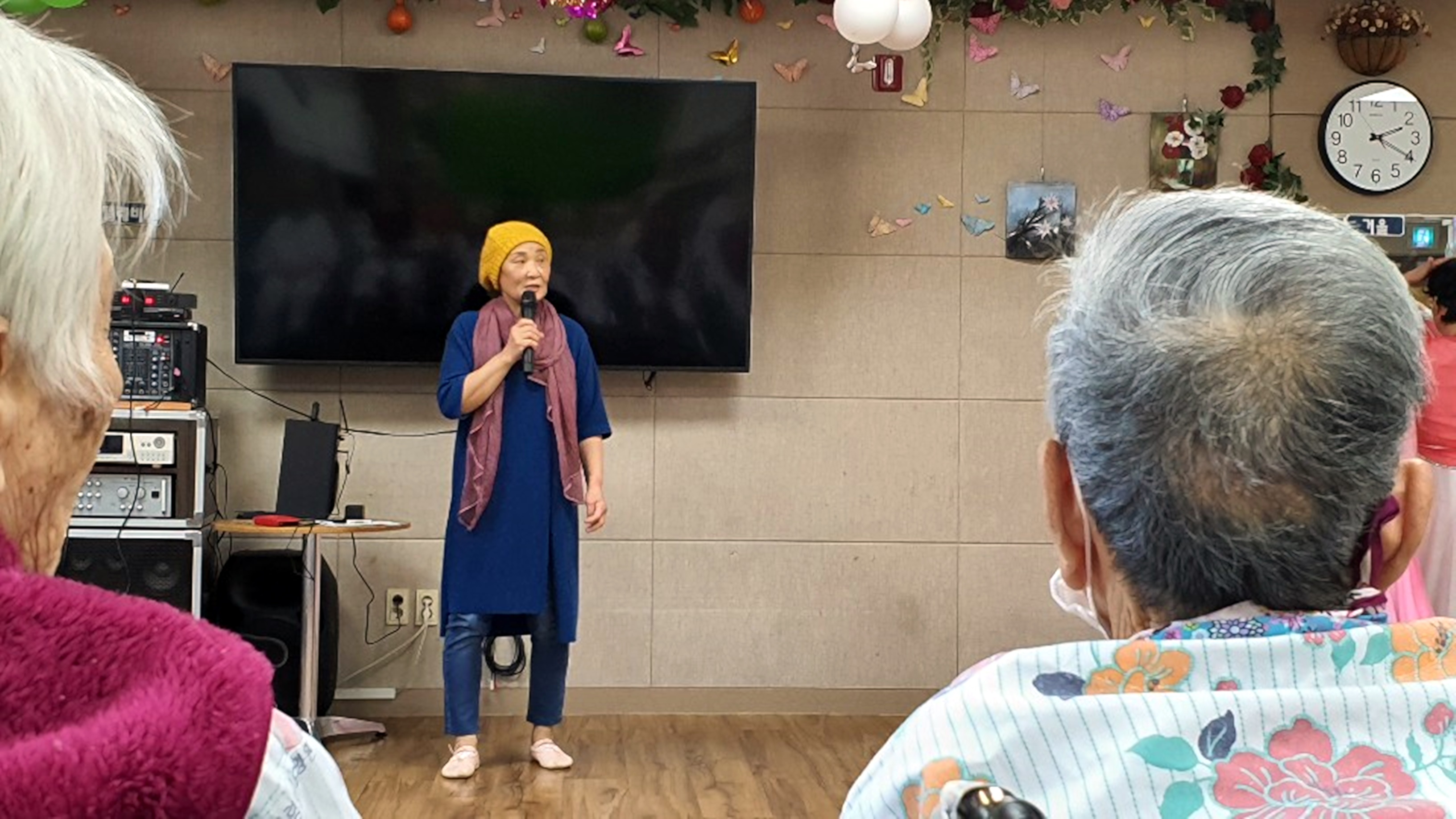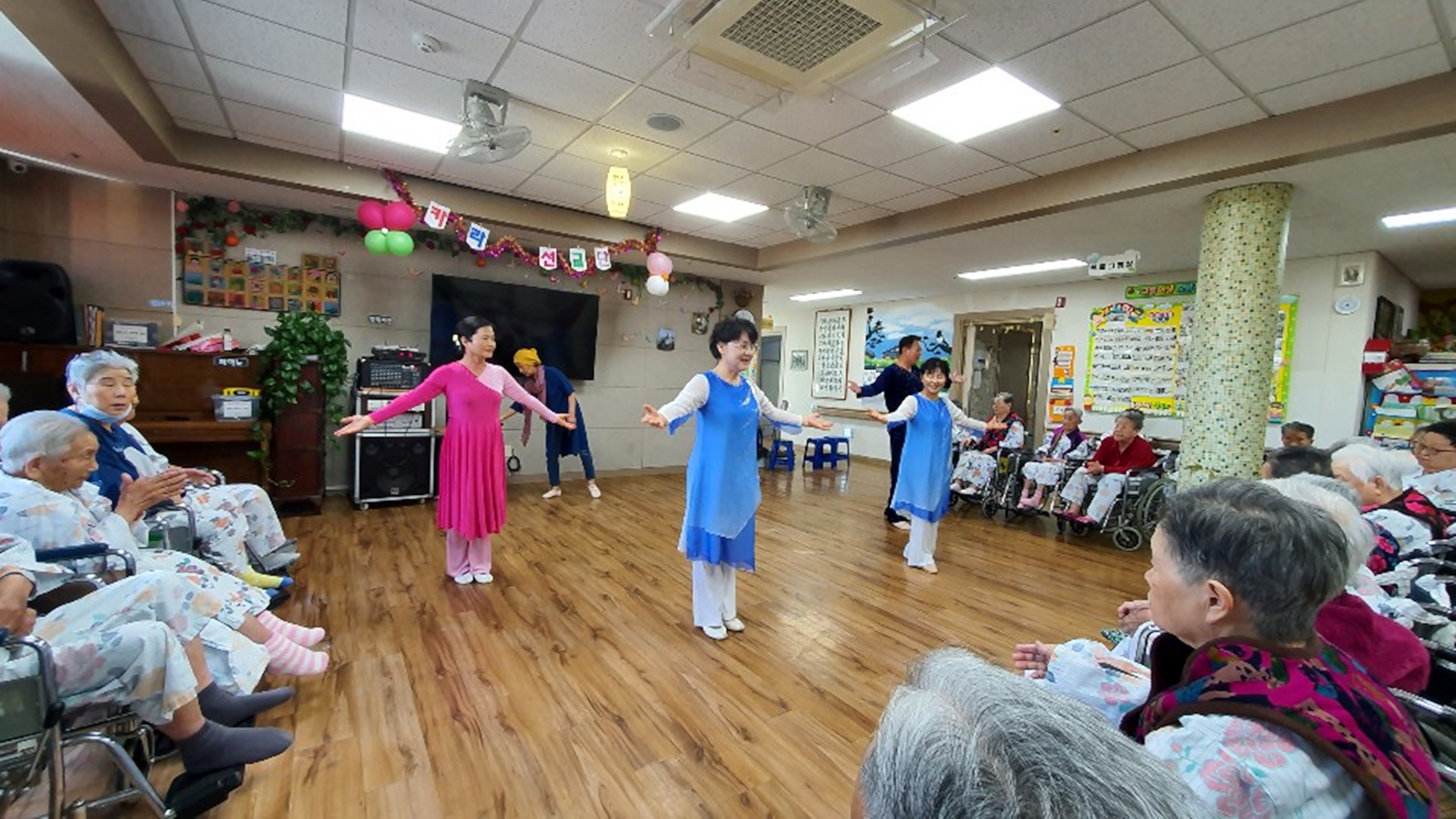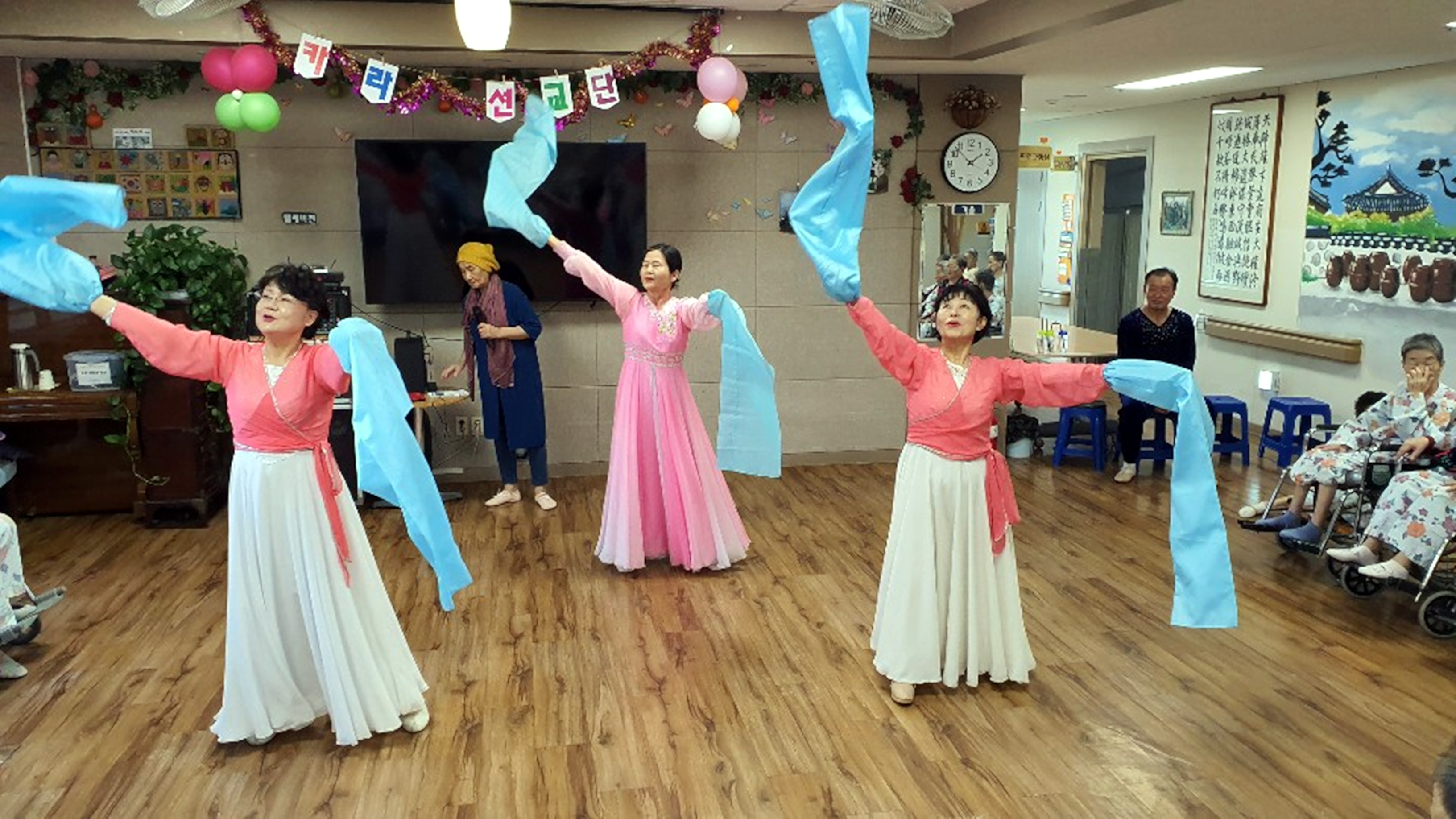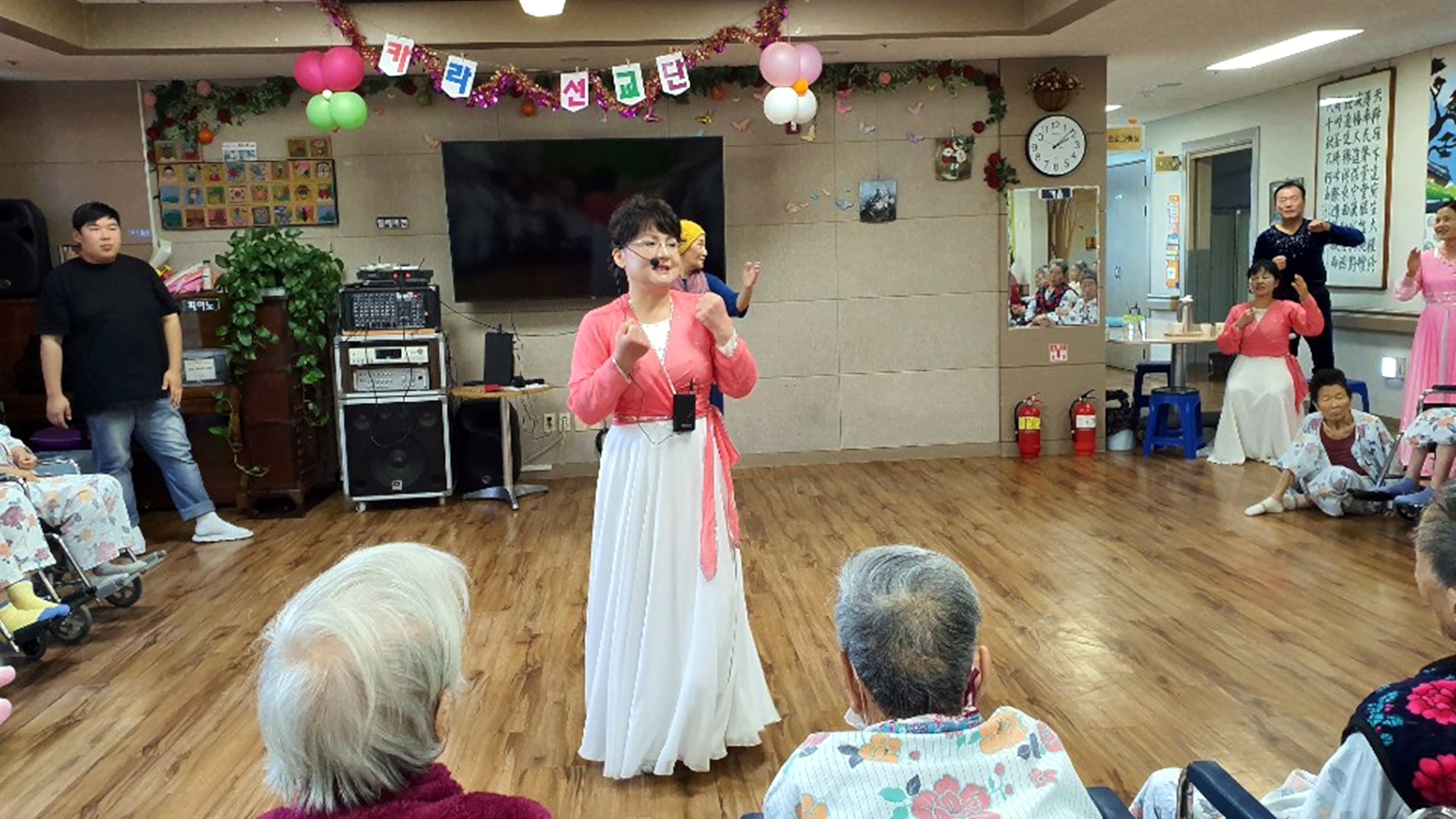 하하 호호 웃게 해주시는 웃음 치료와 좋은 말씀 율동으로 어르신 들에게 건강을 챙겨 주십니다. 웃음치료는 어르신들에게 웃음을 가져다 주며 좋은 에너지가 넘치는 힐링 시간을 주십니다. 늘 새로운 율동과 말씀으로 찾아 주시는 카라선교단에 감사드립니다.