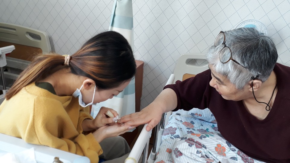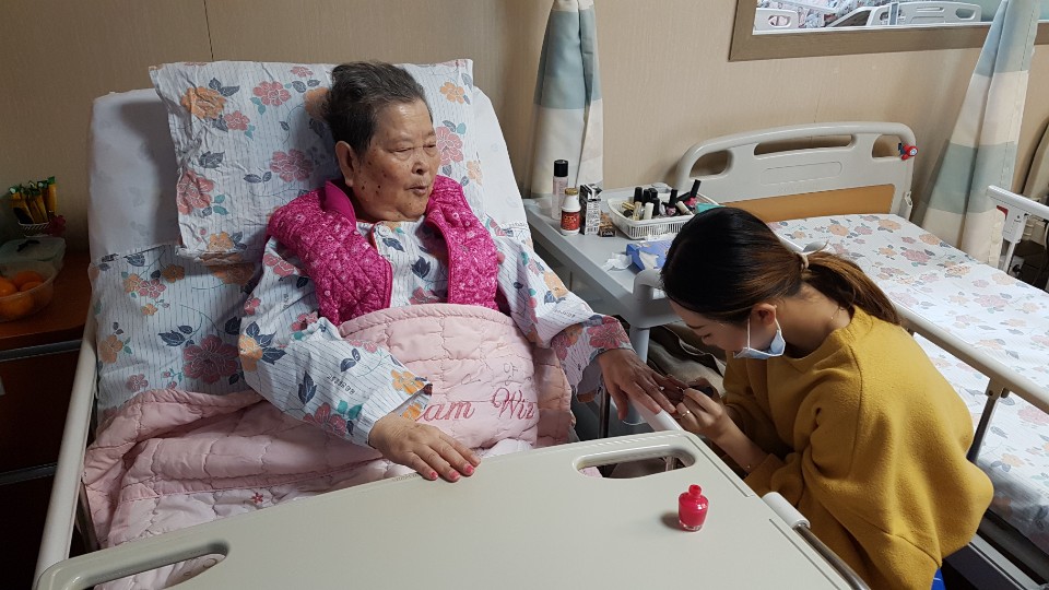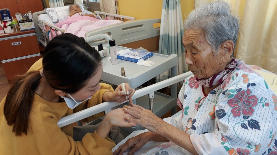 어르신 손마사지와 네일아트 시간을 가져 봅니다. 어르신들 늙어서 해서 뭐하냐 하시지만 해드리면 좋아들 하세요 나이가 들어도 여자! 남자! 어르신들 생활실을 다니며 봉사학생이 진행을 합니다. 어르신과 이야기도 나누며 즐거운 시간을 가졌습니다. |