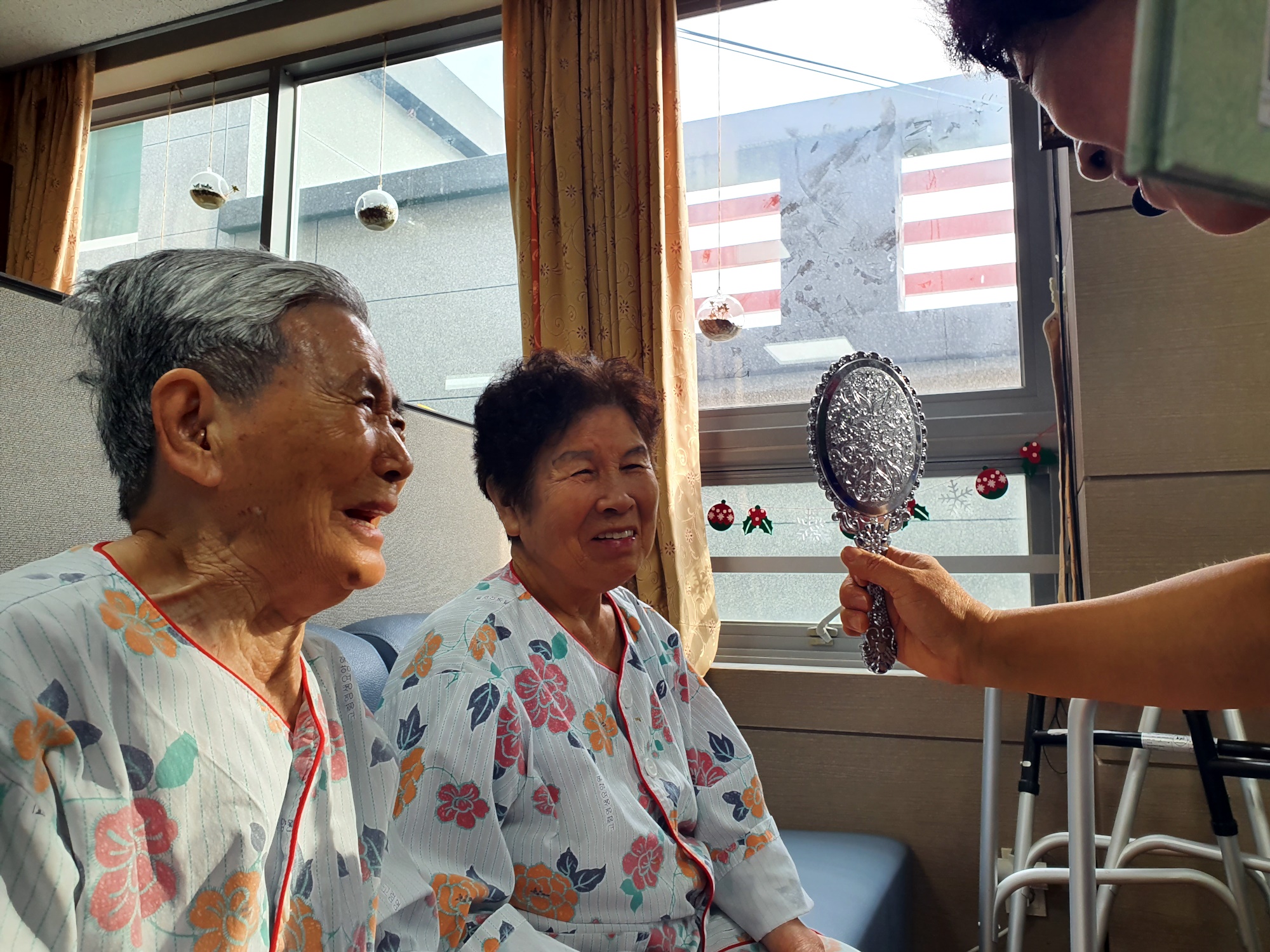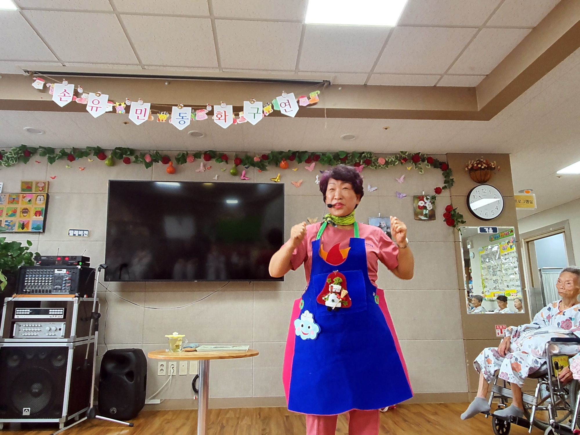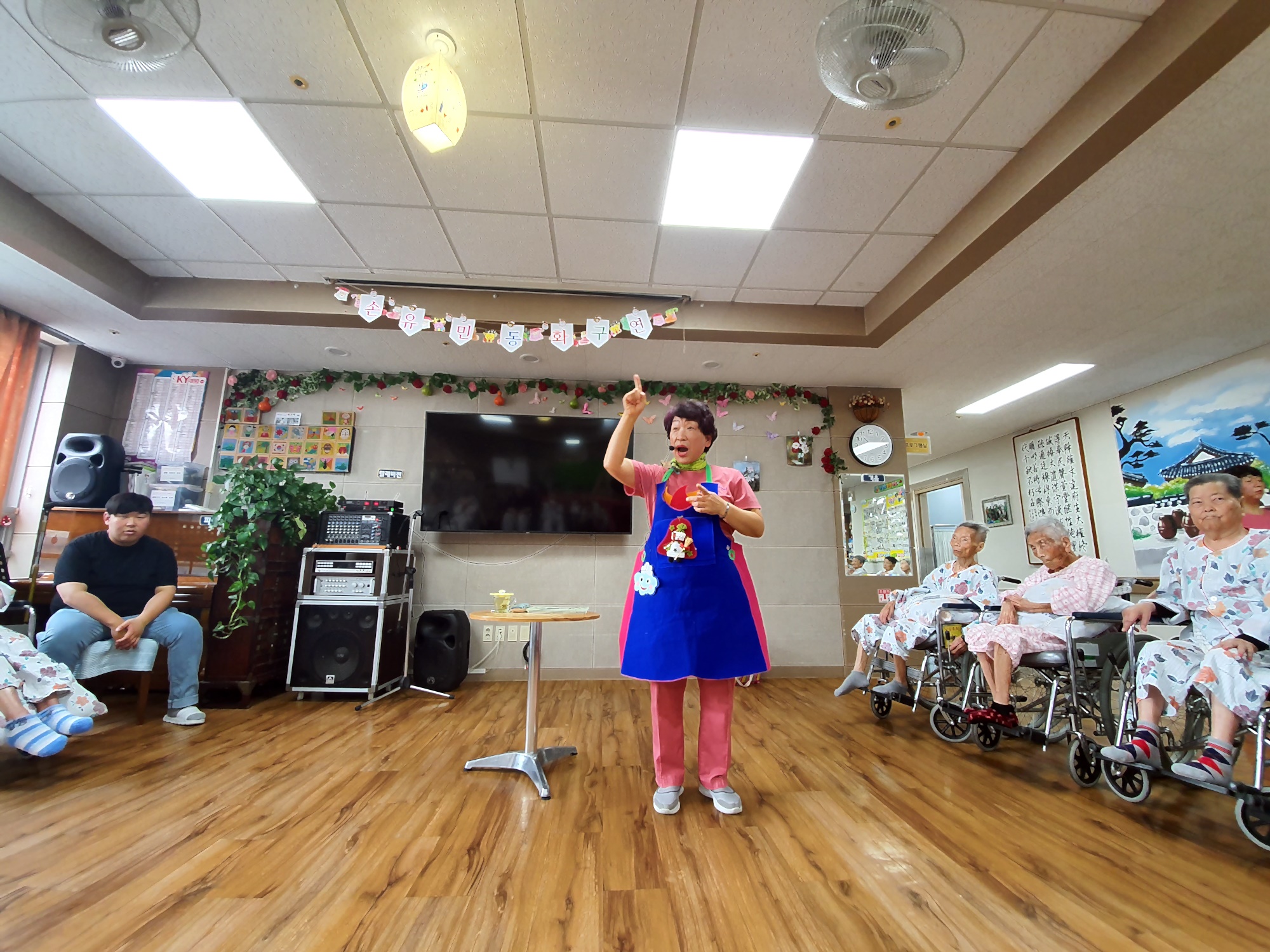 손유민 선생님들께서 어르신들을 위해 준비해주신 동화구연시간거울속에 누굴까? 거울로 일어나는 재미난 이야기를 들려주시며 어르신들 얼굴에 웃음꽃이 활짝 피었습니다. 손유희로 즐거운 시간을 함께 하셨습니다.