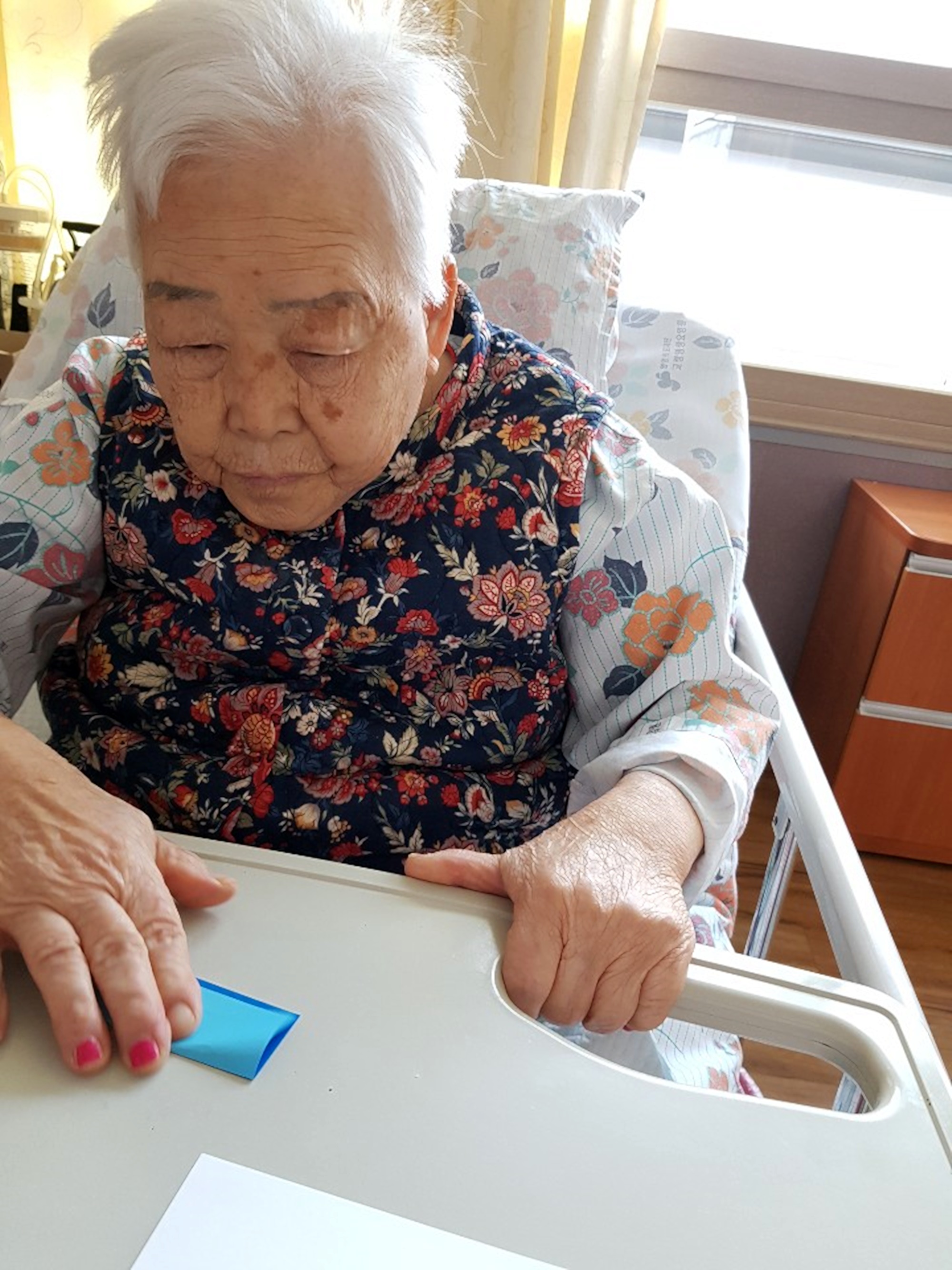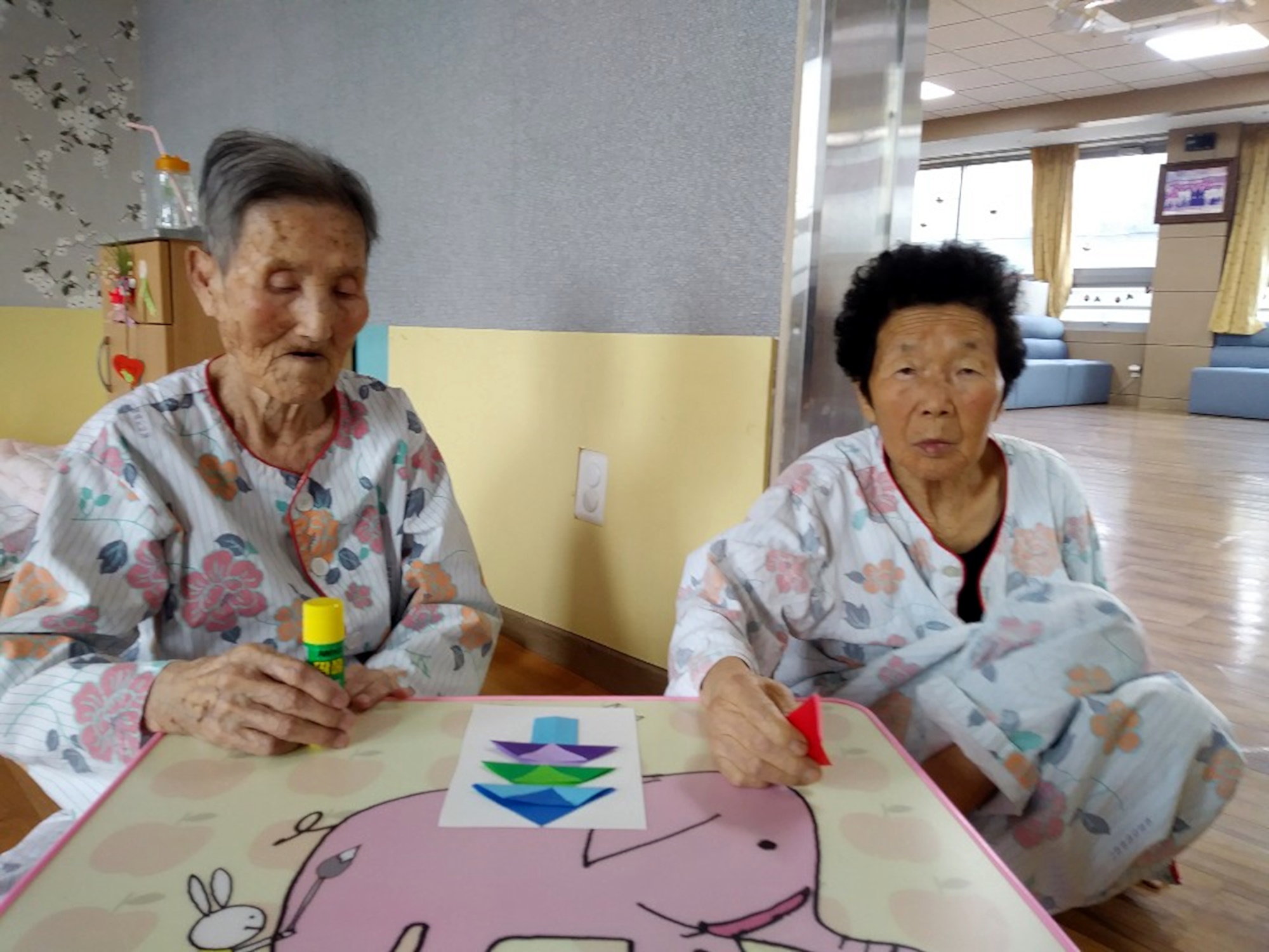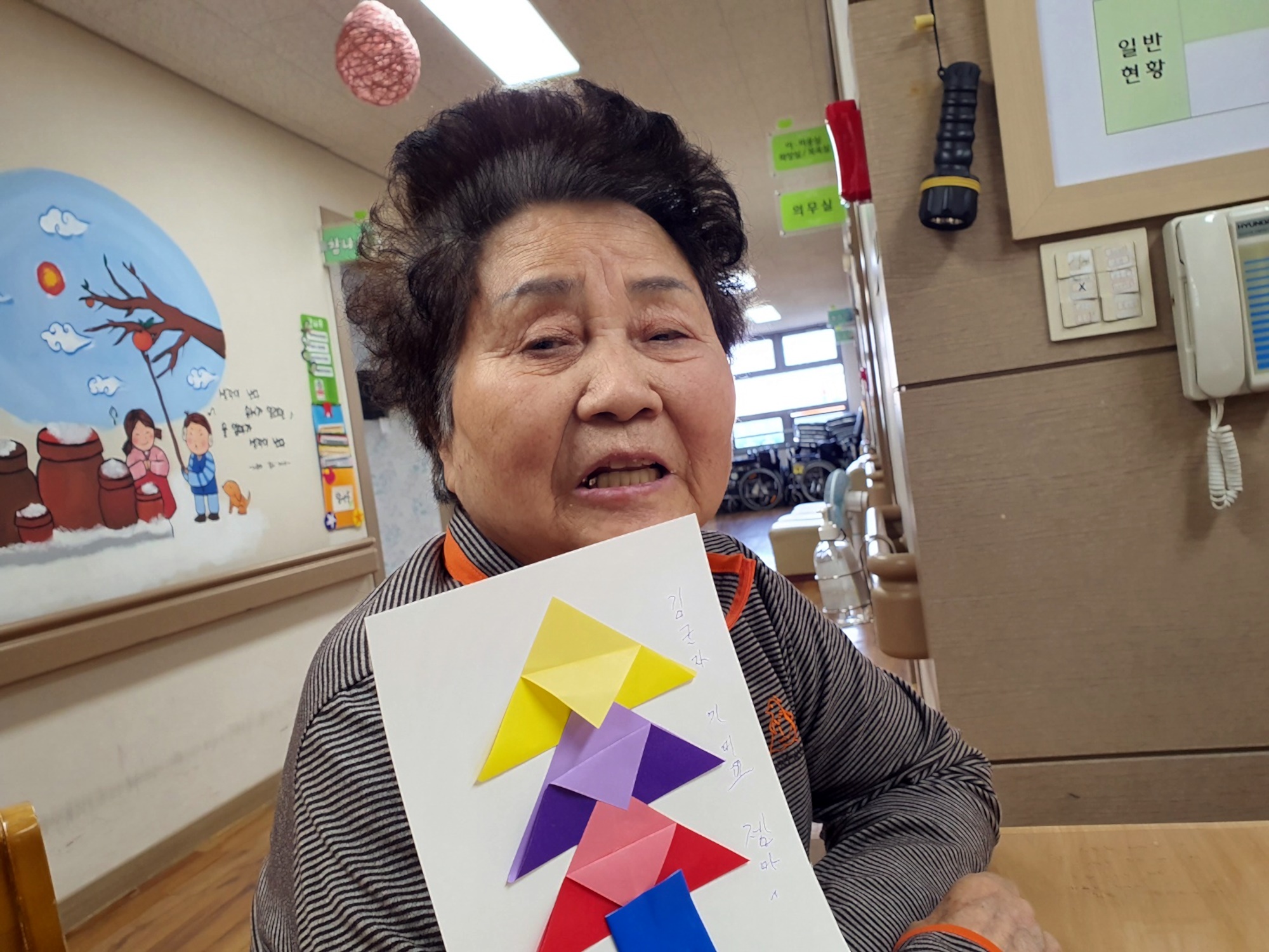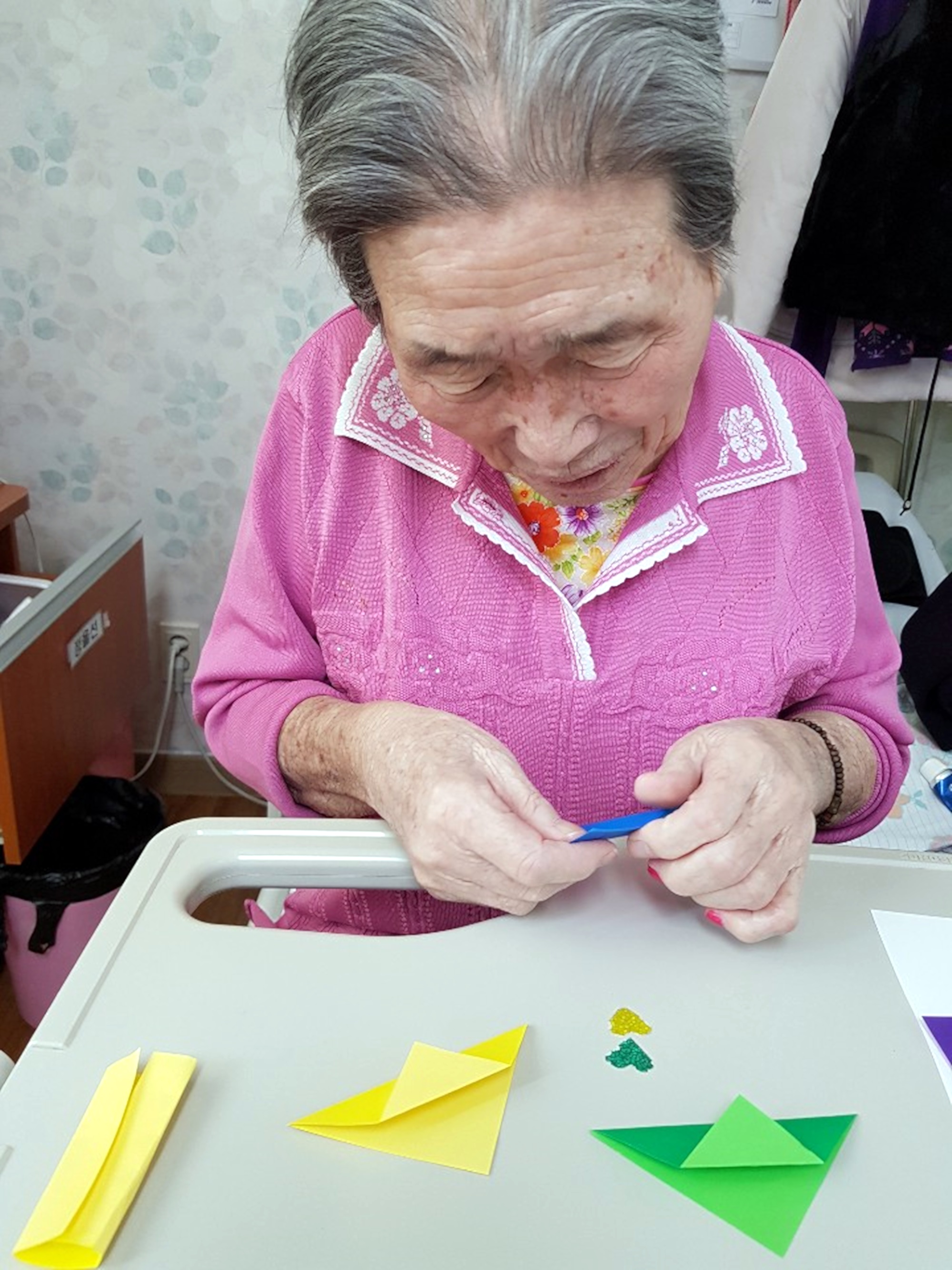 색종이를 접어 트리를 표현하는 기법으로 어르신들 재미있게 수행을 해주셨습니다. 독감으로 프로그램실로 모일 수없어서 마스크를 착용하고 어르신 방으로 찾아가서 프로그램을 진행함 먼저 시범을 보여드리고 접도록 도움드리니 잘 수행해주시고 내일이 크리스마스 이브인것을 설명드리고 산타할아버지가 찾아 오실수 있는지 여쭤보며 울지 않으셨죠 착한일 하셨나요 하고 여쭤보니 착한일 많이 했다 하고 허허 웃어 주셨습니다. |