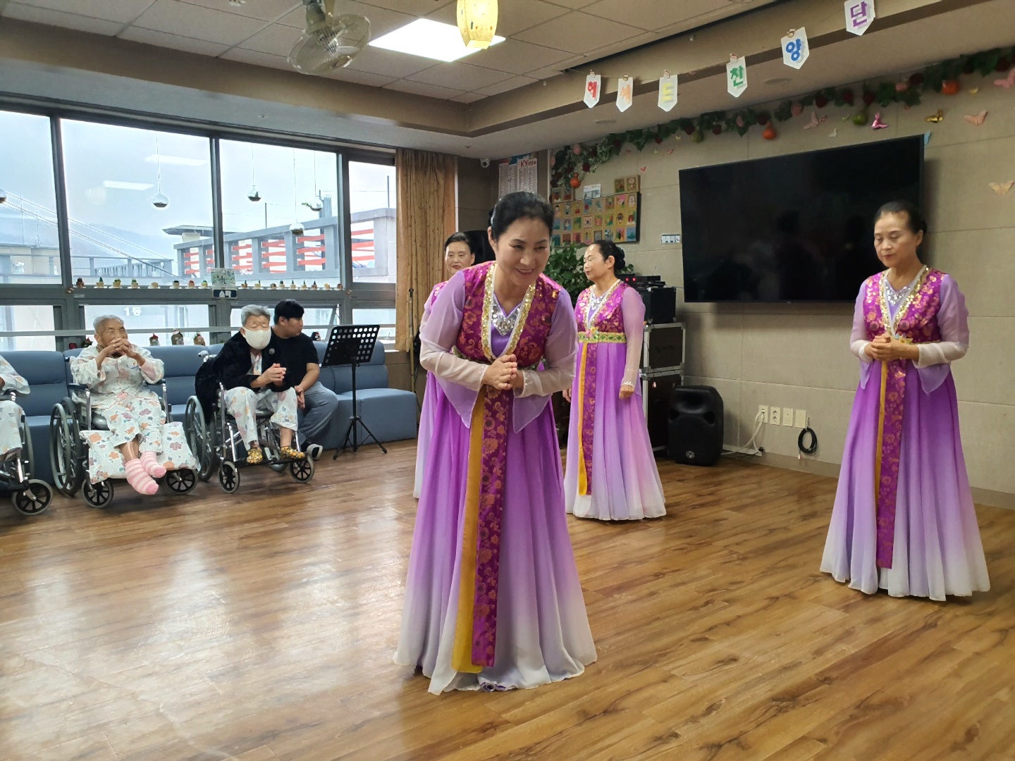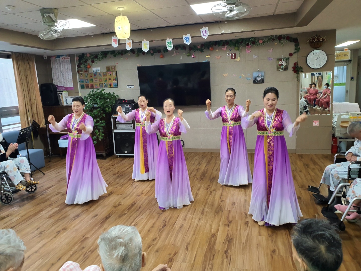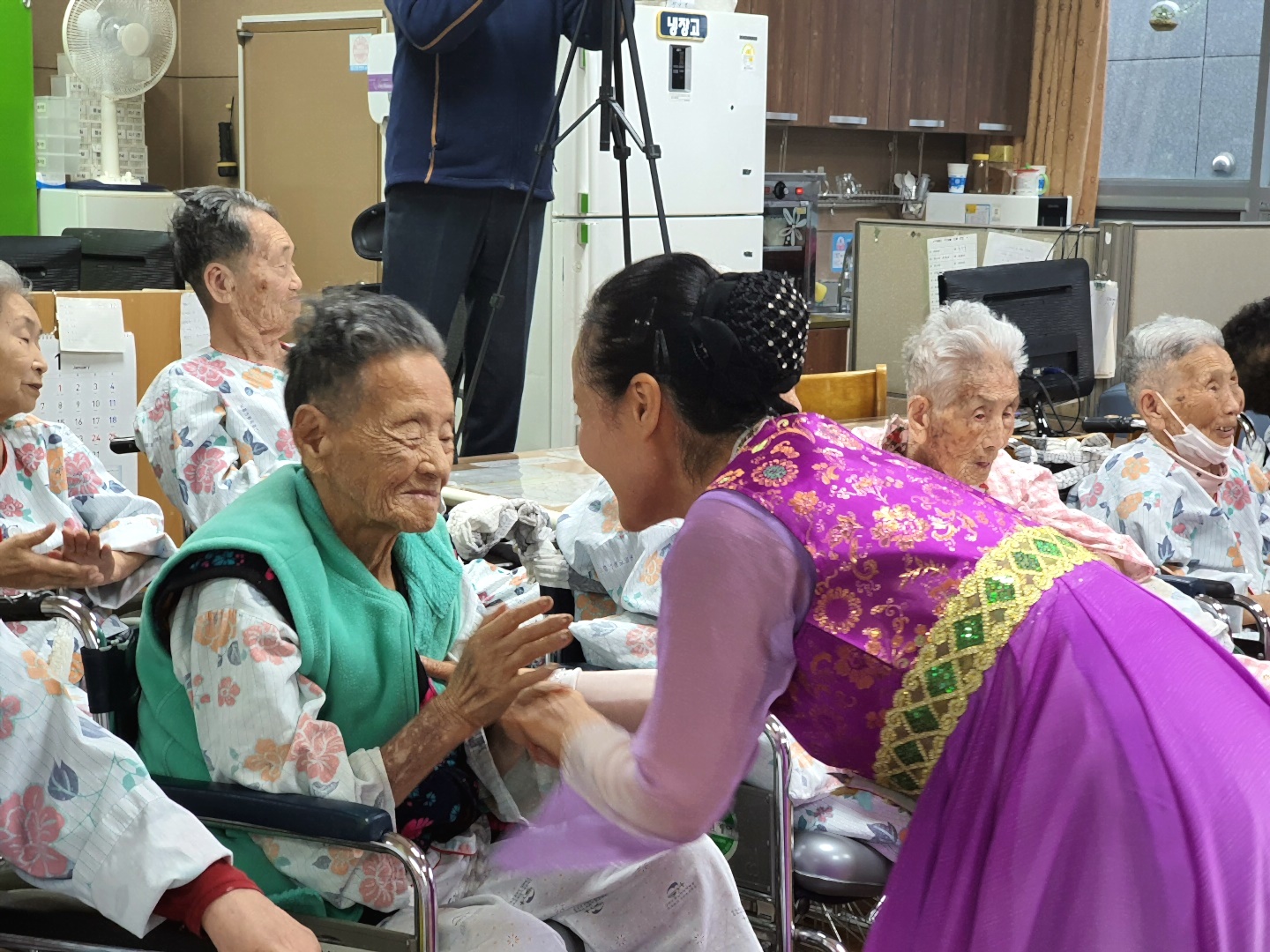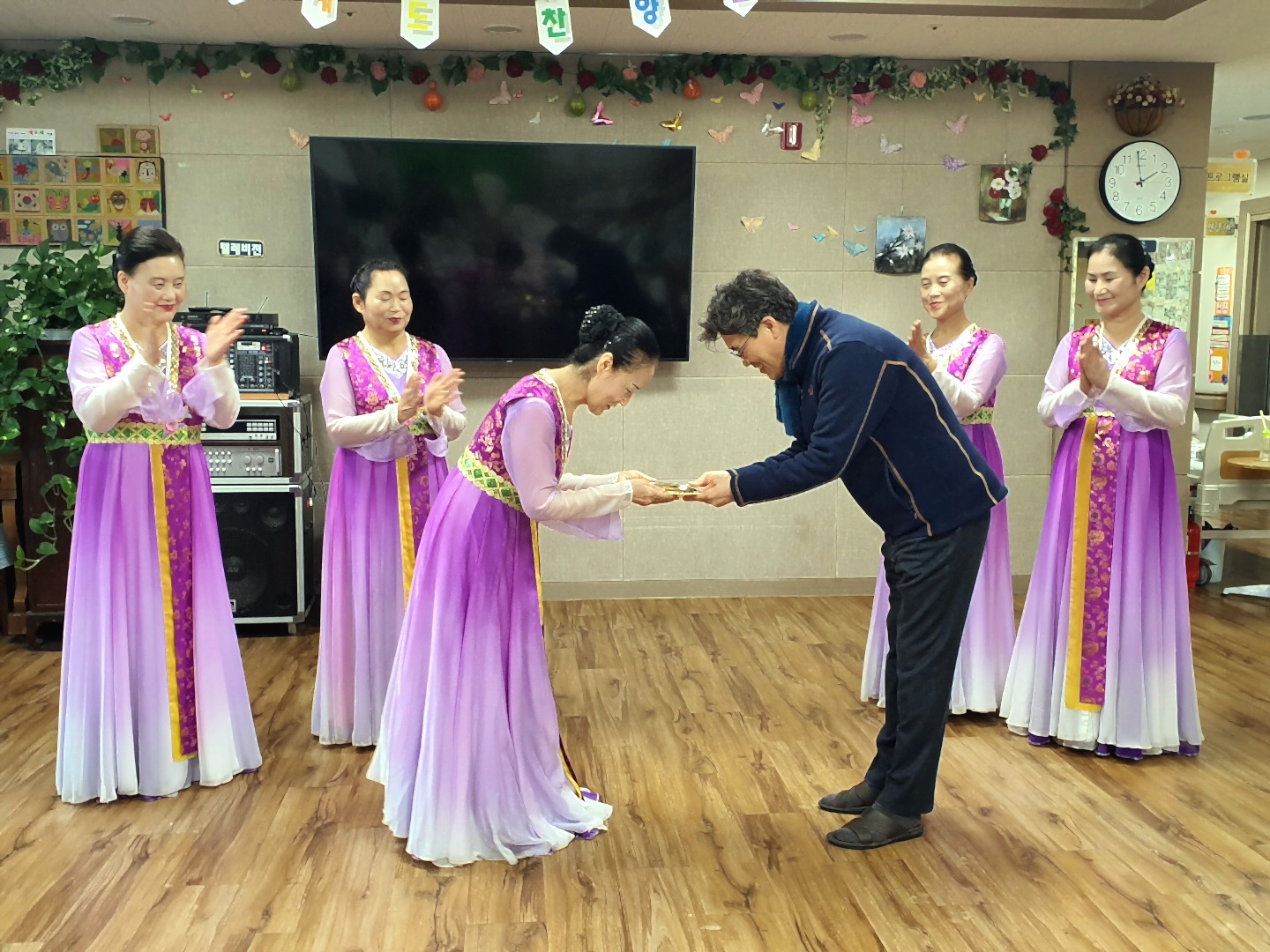 율동과 노래 손유희로 어르신들을 찾아 오시는 헤세드워크샵 찬양단은 매달 첫주 월요일 어르신을 찾아 뵙고 즐거움과 활력을 주십니다. 매달 요양원을 방문하셔서 새로운 율동을 준비 해주시는데요 오늘도 어김없이 공연을 구상해 오셔서 즐거움을 주고 레크레이션을 따라하도록 해 주셔서 어르신 인지력도 쑥쑥 올려 주시고 계십니다 늘 어르신의 마음 안정과 몸과 마음을 건강하게 챙겨주시는 헤세드찬양단 체조와 아름다운 율동으로 공연과 인지쑥쑥 프로그램을 진행 해주십니다. 요양원 10주년을 기념해 한달에 한번씩 찾아 주시는 헤세드 봉사단에 감사패를 증정해드림 요양원봉사에 빠짐없이 도움주셔서 감사함 드립니다. |