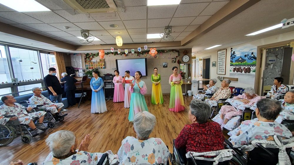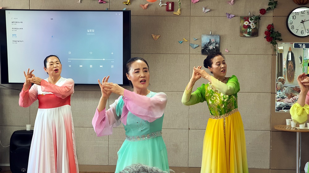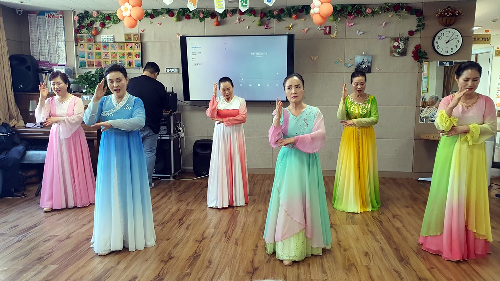 율동과 노래 손유희로 어르신들을 찾아 오시는 헤세드워크샵 찬양단은 매달 첫주 월요일 어르신을 찾아 뵙고 즐거움과 활력을 주십니다. 매달 요양원을 방문하셔서 새로운 율동을 준비 해주시는데요 오늘도 어김없이 공연을 구상해 오셔서 즐거움을 주고 레크레이션을 따라하도록 해 주셔서 어르신 인지력도 쑥쑥 올려 주시고 계십니다 늘 어르신의 마음 안정과 몸과 마음을 건강하게 챙겨주시는 헤세드찬양단 체조와 아름다운 율동으로 공연과 인지쑥쑥 프로그램을 진행 해주십니다. 색소폰 연주로 어르신들 마음의 안정을 느끼심 |