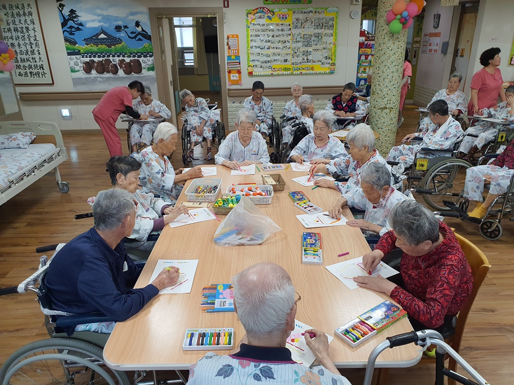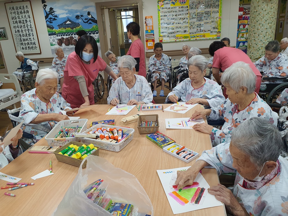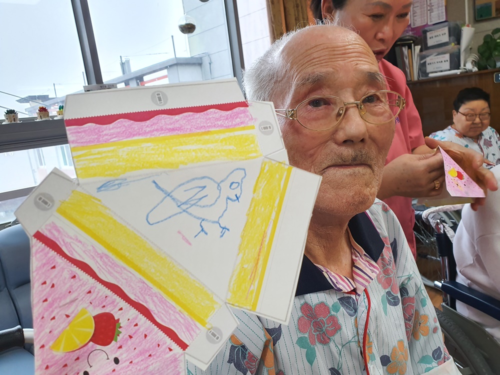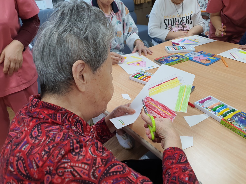 채색을 다양하게 표현하시고 손떨림이 있으신 어르신도 천천히 수행을 하셨습니다. 아이들 처럼 창의적이지 않으셔서 스스로 색을 선택하시는것을 힘들어 하시는 부분이 있으시나 잘 유도드려 원하시는 색을 선택하시도록 도움드림 가위도 잘 다루시고 자르지 못하는 부분 까지 자르기도 하시지만 열심히 끝까지 수행하시고 만든 케이크의 초를 후 불면서 영원히 꺼지지 않는 촛불이라고 좋아하셨습니다. |