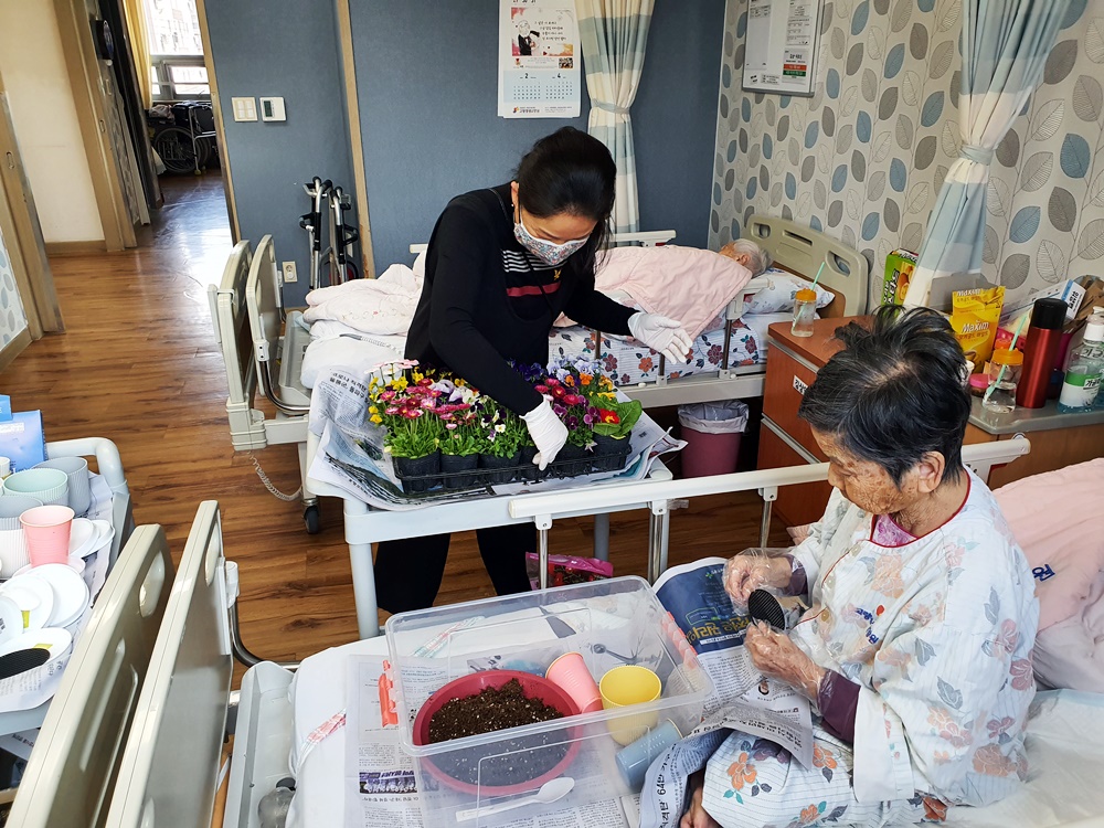 본요양원 서영자 요양보호사님께서 팬지꽃을 기증해주셔서 어르신과 원예활동을 즐겼습니다. 코로나 19로 생활실에서 마스크를 착용하고 손소독 후 1:1 로 도움을 드리며~~ 팬지 꽃의 꽃말이 ' 나를 생각해주세요' 입니다. 어르신을 오래 오래 생각해주세요 ~ 꽃이름을 어르신 이름을 붙여 김00 꽃 신 00 꽃등으로 푯말을 적어 화분에 꼽아 드렸습니다. 외출을 할 수 없으나 봄을 느끼시길 바라는 맘으로 봄꽃을 심어 창가에 두시고 봄을 느끼시도록 도움드렸습니다. 어르신들 꽃을 보고 안정감을 느끼시고 꽃을 심으며 행복한 시간을 보내셨습니다. |