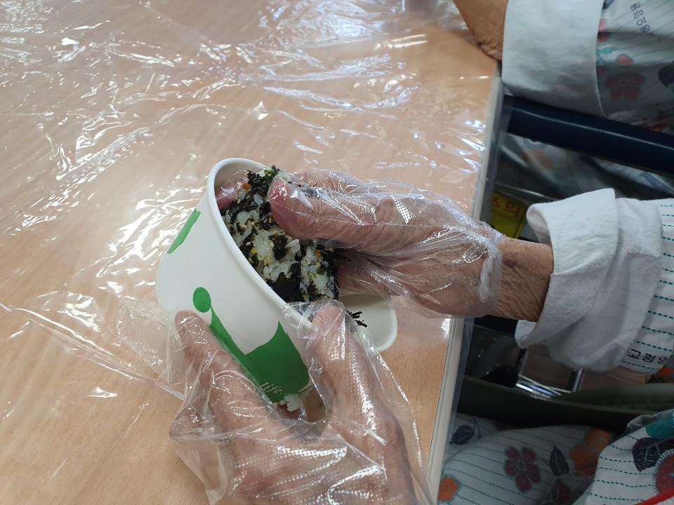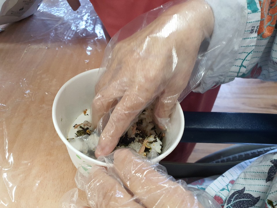 어릴적 간식 또는 점심으로 많이 만든 주먹밥을 만드시며 많이 해먹었다고 이야기를 해주셨습니다. 처음 접하는 요리보다 추억의 요리를 하면 더 즐거워 하십니다. 어르신들 소근육 활동으로 조물조물 만들어 맛있게 드시는 시간 주먹밥 만들기 시간을 가졌습니다. |