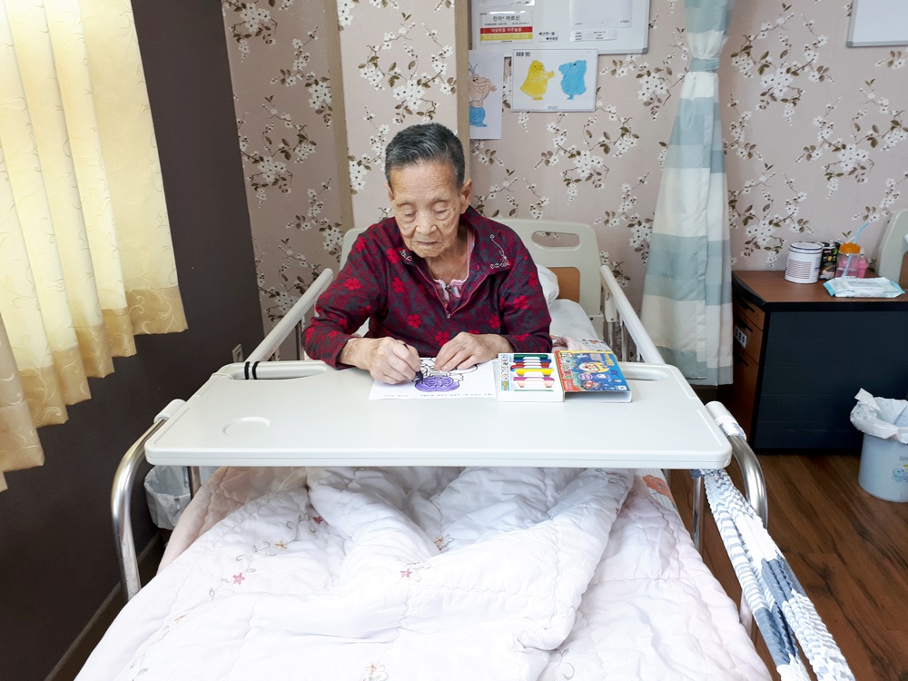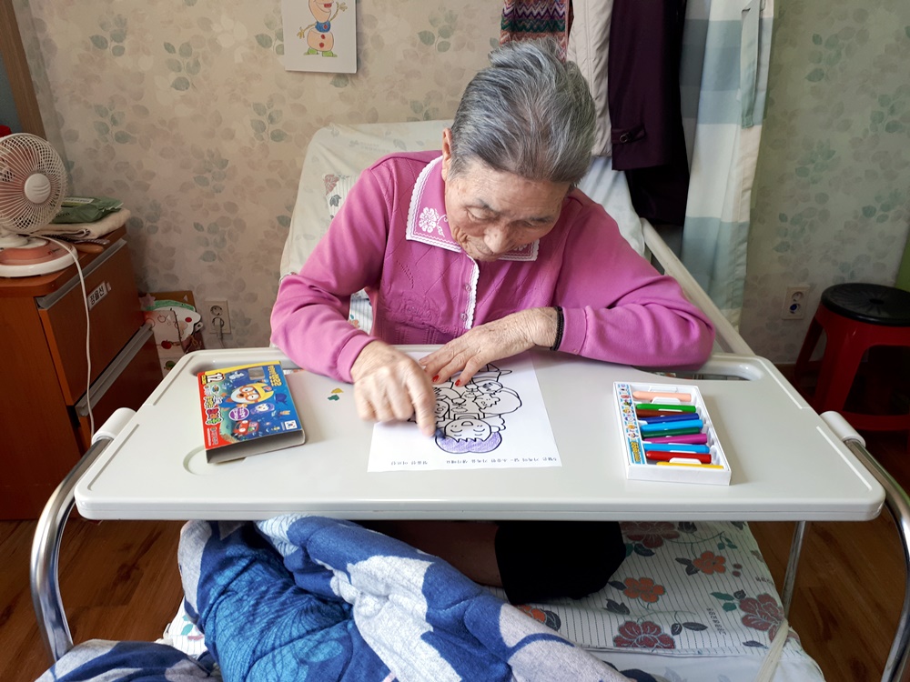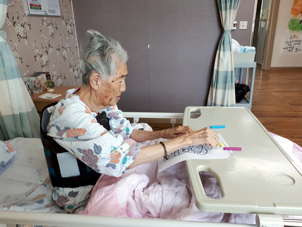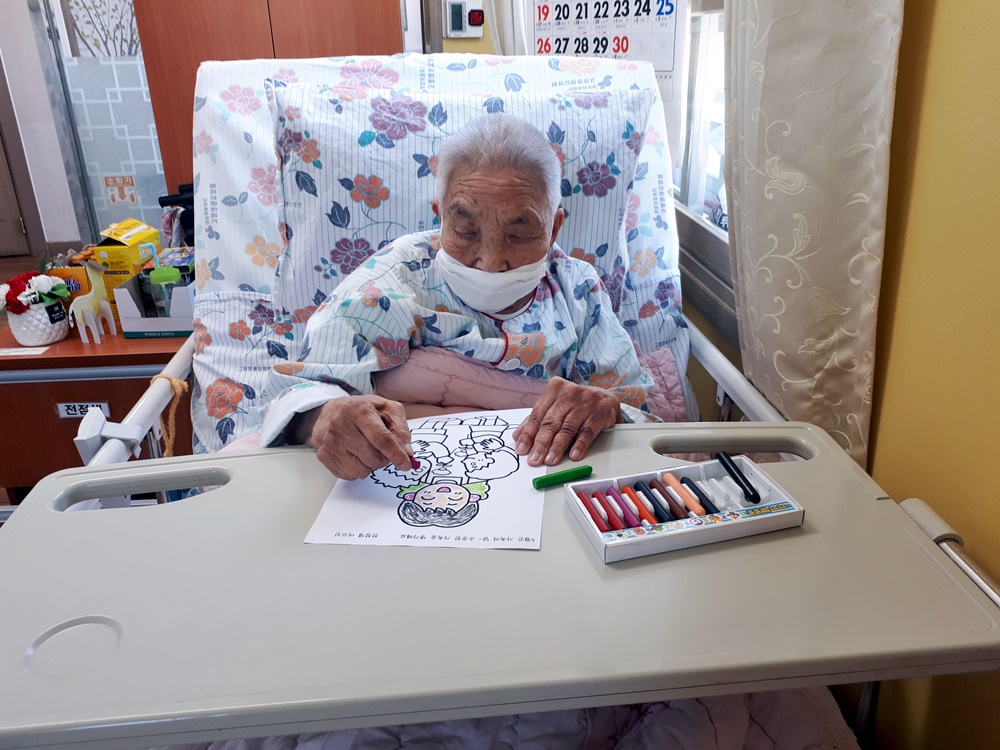 요양원 인테리어 관계로 생활실에서 수행을 하셨습니다. 5월은 가정의 달이라 화목한 가족의 모습을 도안으로 제시해드려 엄마가 아이들에게 카네이션을 받는 모습을 꼼꼼하게 색칠들 하셨습니다. |