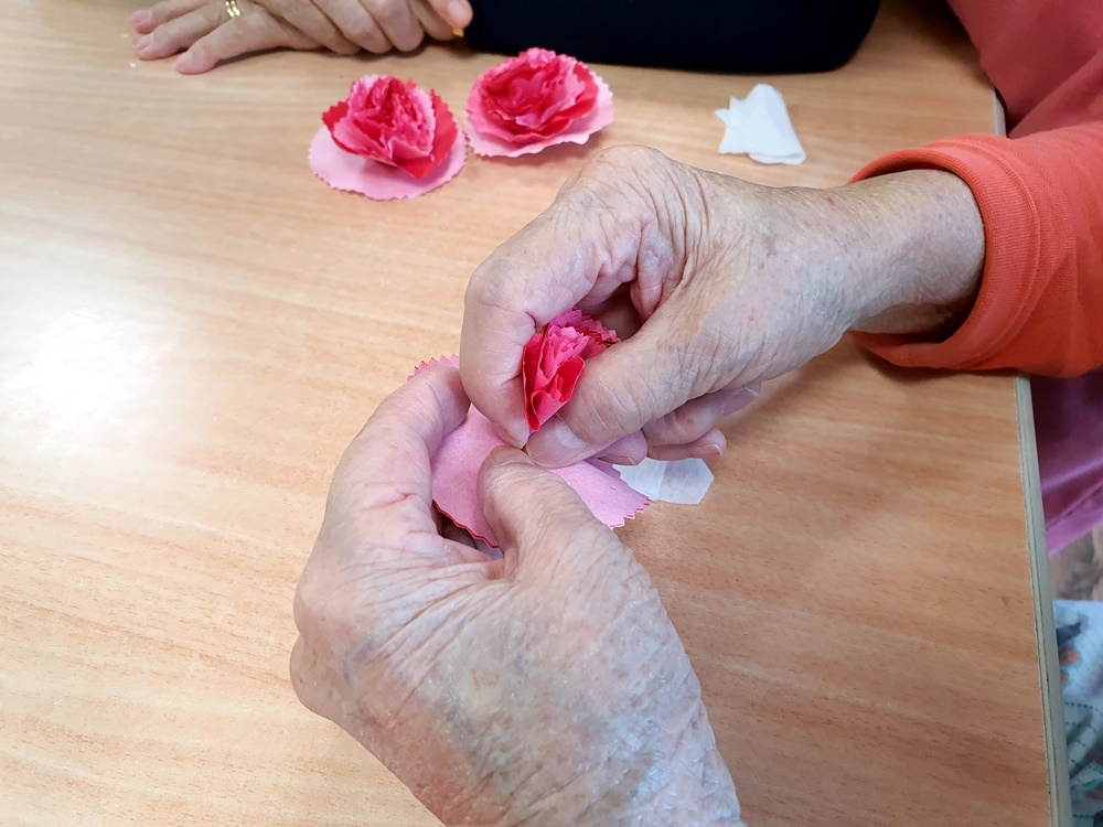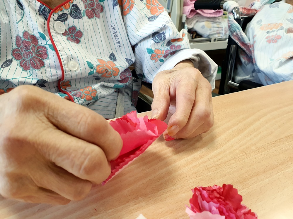 카네이션의 꽃말은 모정, 사랑, 부인의 애정이라고 합니다. 5월은 가정의 달로 가족과 함께 하는 달이죠 코로나19로 가족들을 만나지 못하셔서 가슴이 짠하셨는데요 ~~ 비대면으로 어르신과의 면회가 가능하십니다. 그러나 늘 조심조심~~ 오늘은 어르신과 한지카네이션 만들기를 수행했습니다. B.C그룹 어르신을 모시고 카네이션꽃을 나눠드리는 선물에 붙여 제공해드릴 어버이날에 전달해 드릴 예정입니다. 소근육활동으로 손을 움직여 한지 카네이션을 만들며 신기하다고 하시고 예쁘다고 좋아하시며 이름을 적어 어르신이 만든것을 표기하고 모아서 5월8일 어버이날 ~ 드리려고 했더니 ㅎㅎㅎ 만드신 카네이션 가슴에 다셨습니다. 예쁘게 포즈도 취하시며 찰칵~~~ A그룹 어르신에게 전달될 카네이션도 함께 만들어 준비해 두었습니다. |