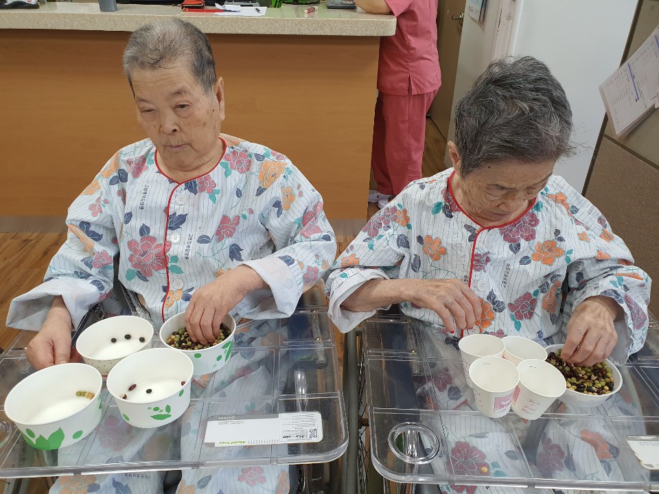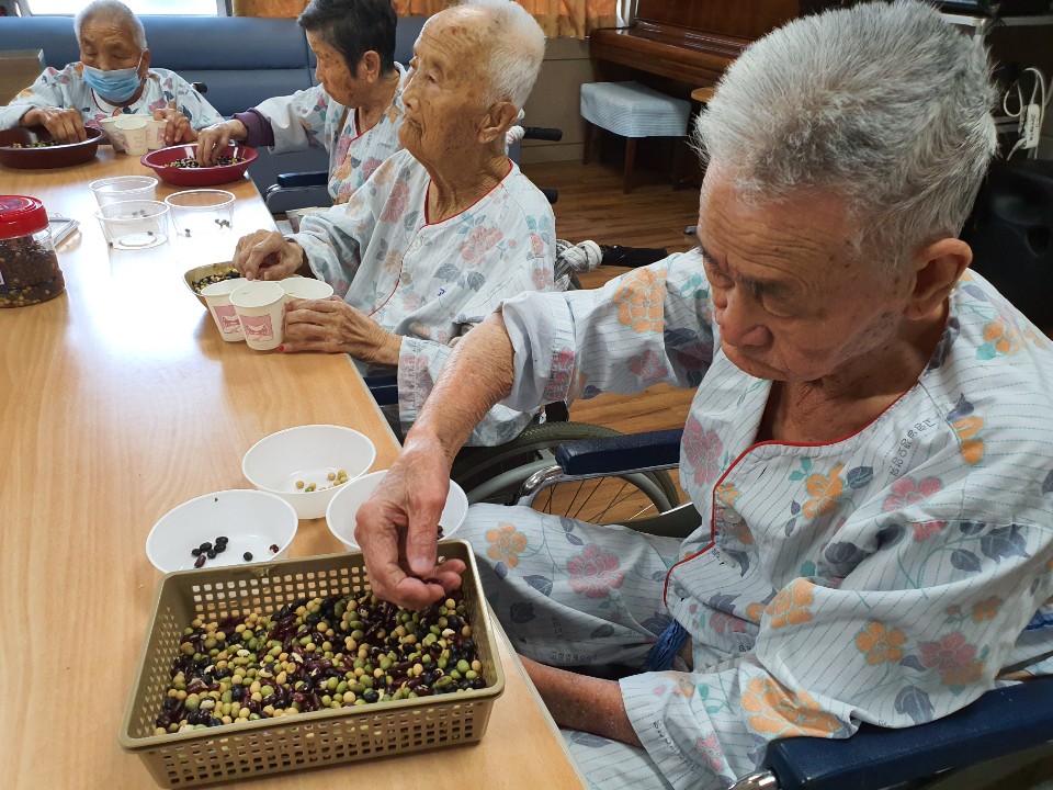 4가지의 콩을 종류별로 섞어드려 콩을 고르는 시간을 가져 봅니다. 어르신들 콩고르기 집중도가 좋으시며 소근육 활동에 잘 참여 하셨습니다. 피아노 음악을 들으며 안정적인 분위기 속에서 프로그램 진행드렸으며 모든 어르신 집중력이 좋으셔서 잘 수행하셨으며콩 분류를 완수하여 성취감을 얻으시고 다양한 감각을 활용을 통해 인지기능을 자극시키셨으며 차분한 시간을 통하여 내면을 다스리며 정서가 안정감을 느끼시고 콩과 연관된 이야기를 나눔으로써 지난날을 회상해 봤습니다. |