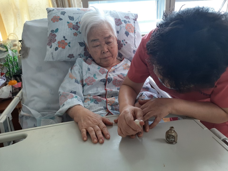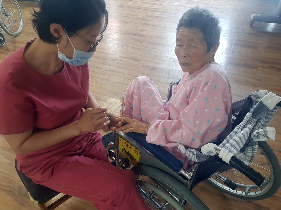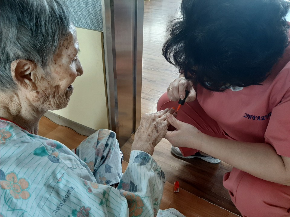 네일아트를 통해 어르신의 심적 마음의 여유를 즐기고 삶의 활력을 얻도록 해드립니다. 어르신들 네일아트를 좋아하시고 네일아트를 원치 않으시는 어르신은 손마사지로 도움드렸습니다. |