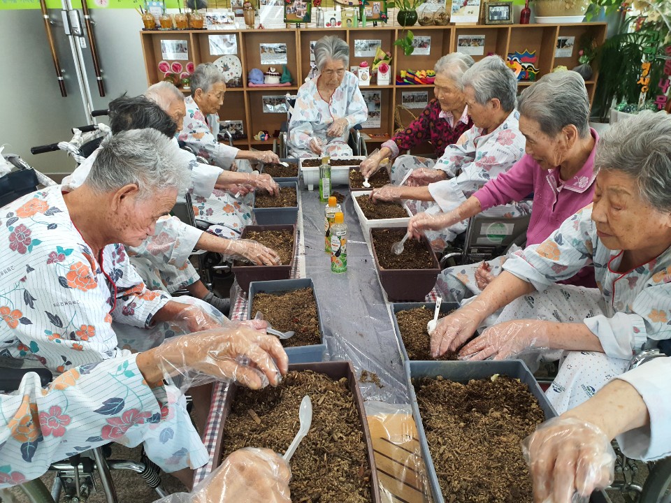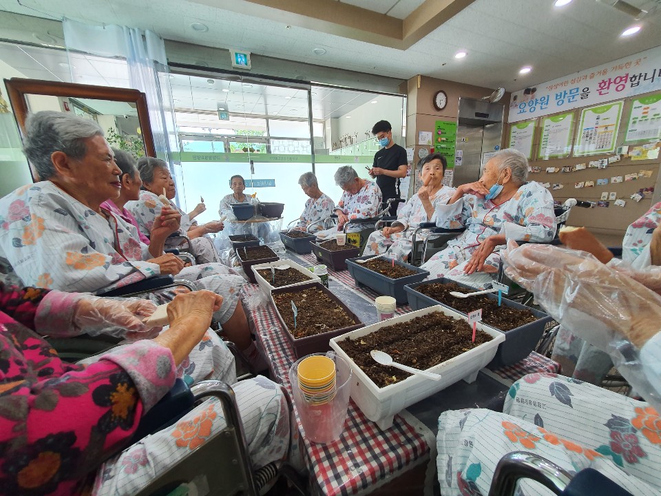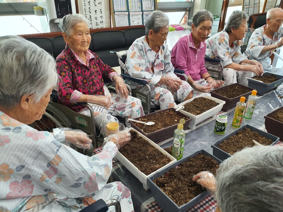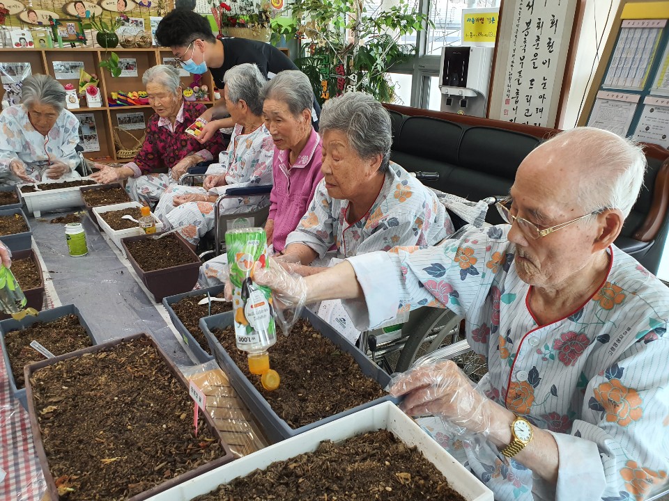 옛날 밭에서 일을 하실때 참을 먹었다고 하시며 꽃씨를 심고 콩국을 준비해 막걸리 한잔 노래를 부르며 한잔씩 맛있게 드셨습니다. 신00 어르신께서 닭 강정도 내셔도 안주삼아 전00, 여00, 최00 어르신으 오동추야 노래를 하시며 꽃씨를 심으셨습니다. 흙은 어르신에게 생명을 드리는것 같습니다. 큰 활동은 아니나 꽃씨를 심으며 흙을 만지며 옛 추억을 떠올리는 시간을 가지셨습니다 |