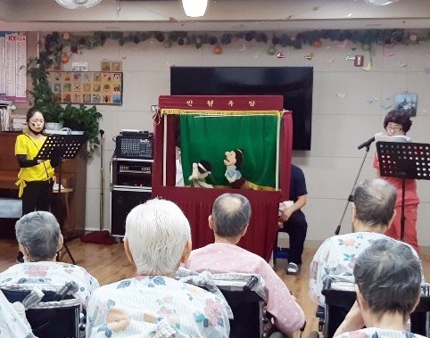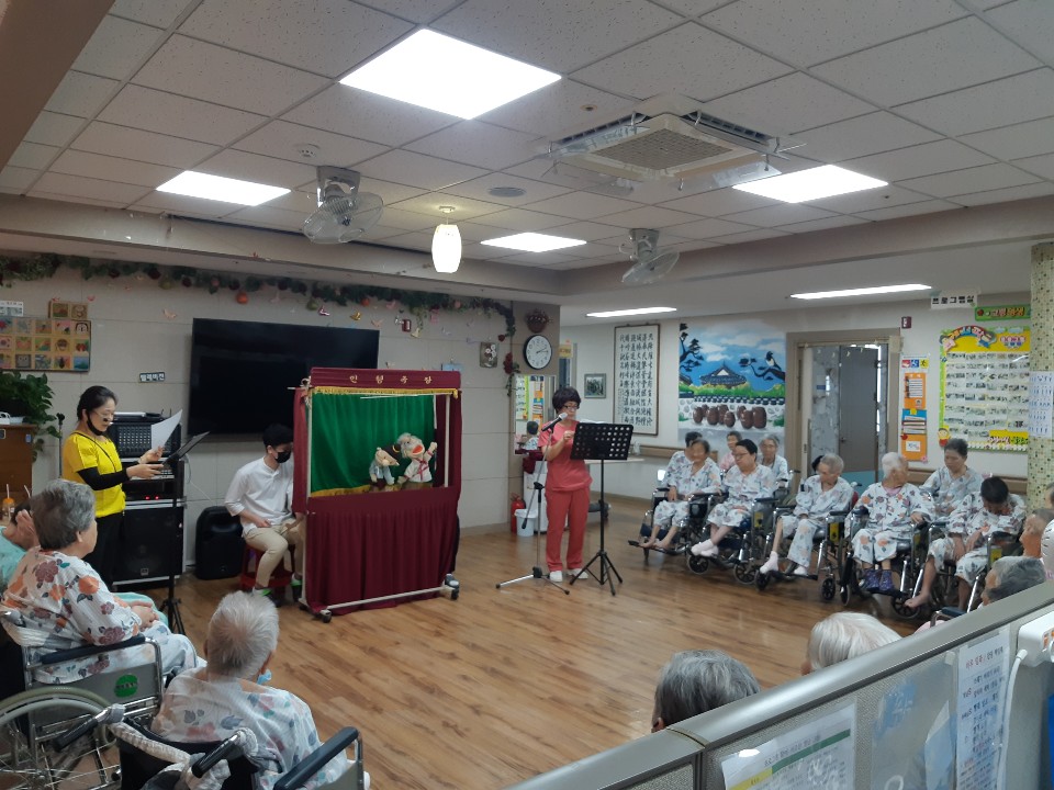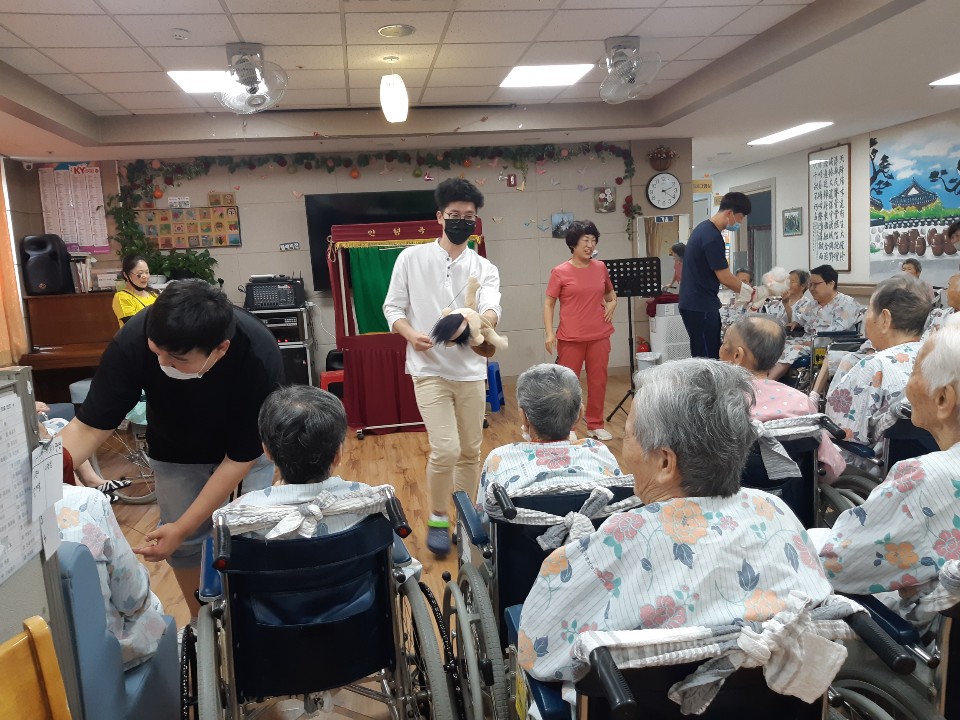 코로나19로 외부공연이 불가피해 사회복무요원과 요양보호사 선생님들 함께 인형극을 준비 했습니다. 어르신들 외부 공연도 좋아하시지만 직원들이 보여주는 공연도 재미있어 하셨습니다. 금도끼와 은도끼의 이야기를 들으시며 친구간에 사이좋게 지내야 한다며 언제 어디서나 사이 좋게 지내자고 옆 어르신들과 악수도 하셨습니다. 인형을 이용해 더 실감난 동화이야기 재미있었다고 하시며 호흥도가 좋으셨습니다. |
