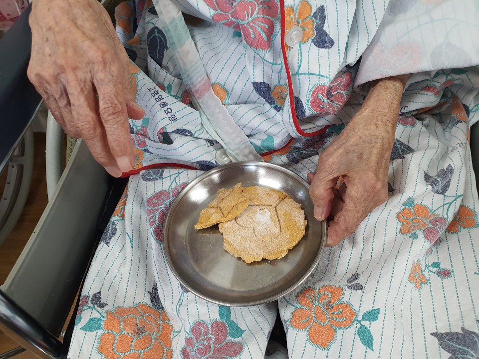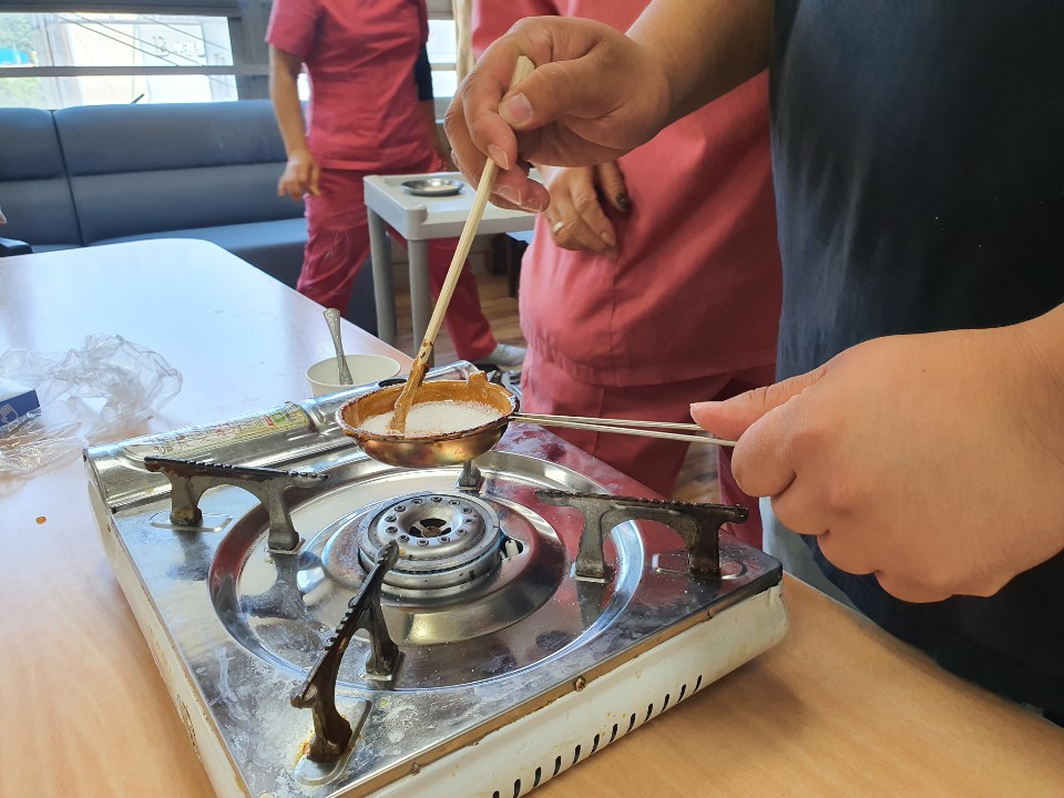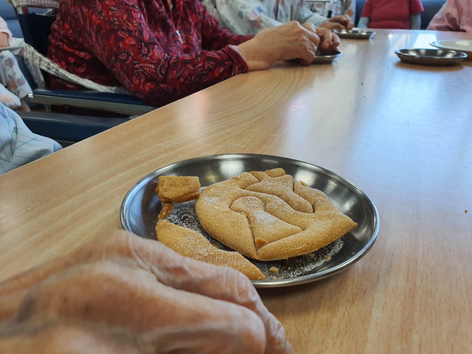 어릴적 추억의 음식이자 놀이 달고나 만들기 힘든 시절 여름에 시원하게 먹던 추억의 음식 화상의 우려가 있어서 어르신들은 직접 수행을 드리지 않고 달고나 모양을 완성해 보는 시간 학교앞에서 달고나를 하기위해 줄을 섰다 엄마를 기다리고 아이를 데릴거 갔던 추억들 달고나에 대한 다양한 추억을 이야기 나누시며 도깨비가 데려간 세딸 동화책도 읽는 시간을 가졌습니다. |