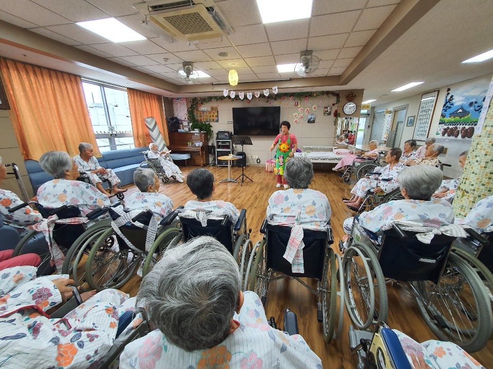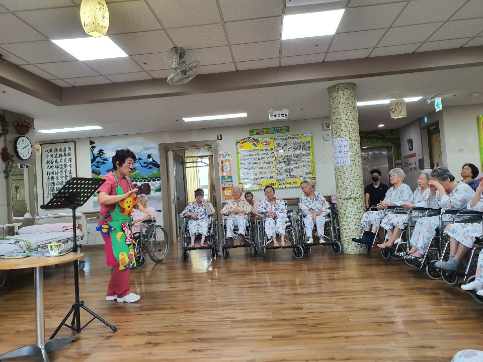 손유민과 함께 하는 동화시간 전래동화책을 동화구연을 해주셨습니다. 재미있는 손유희와 어르신들 인지 체조까지 함께 해주셔서 어르신들 호흥도가 좋으십니다. 도깨비가 데려간 세딸과 방구쟁이 이야기를 재미있게 들려 주셨습니다. 어르신의 호흥도가 좋은 시간이었습니다. |