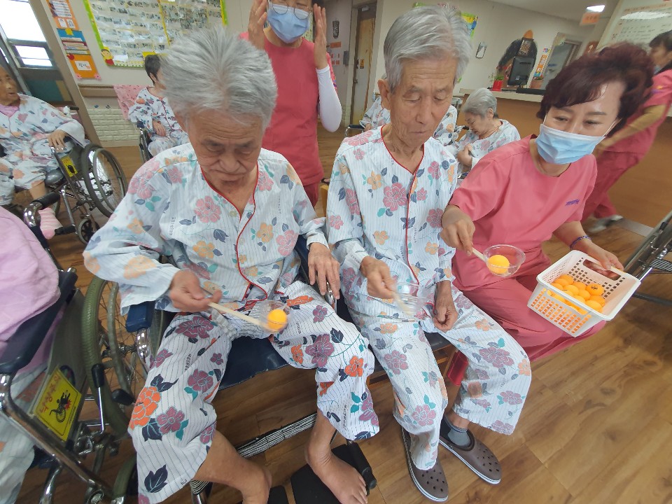 트로틋 음악을 들으며 게임을 진행 합니다. 서로 협심해서 게임을 진행하니 경쟁심과 단합을 함께 느낄 껴 열심히 소근육 활동과 인지 활동을 하십니다. 한명은 할 수 없는 게임으로 함께 하는 것이 중요한 게임으로 집중력 있게 게임을 진행 하셨음 어르신 만족감이 높은 게임으로 경쟁심과 남을 배려하는 마음도 함께 배우시는 시간을 가져 봅니다. |