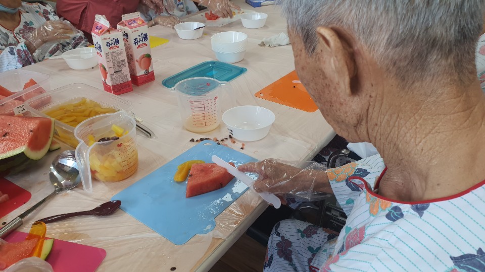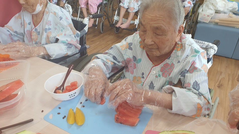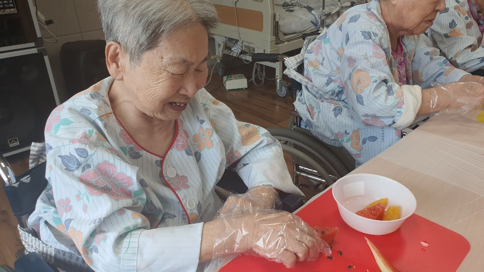 오늘은 고령영생요양원 어르신 요리시간입니다. 직접 만들어서 드시는 간식~~ 오늘 요리는 수박화채입니다 더운 날씨에 수분섭취는 꼭 필요하죠 수박 + 복숭아 통조림 + 후르츠 + 쿨피스를 이용해 달달한 화채를 만들어 에너지 보충하셨어요 차례 차례~ 천천히 ~ 다음 어르신 앉으세요 ㅋㅋ 요리를 하기 위해 재료를 드렸더니 입속에 쏙~~~ 소근육 활동 인지향상 그리고 입도 즐거운 요리시간 요리 시간 후 시간이 남아서 인절미 시집가는 동화책( 인절미를 요리하는 동화책)도 읽어드리며 간식을 맛있게 드셨습니다. " 아비야 어미야 우리는 잘 있다"~~~ 돈보다 옷보다 먹는게 최고다 ㅎㅎㅎㅎ 하십니다. |