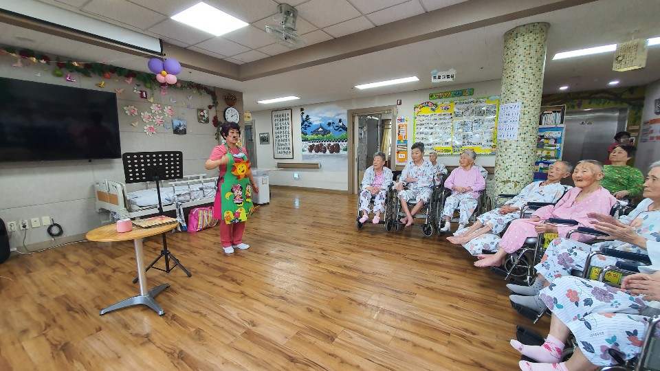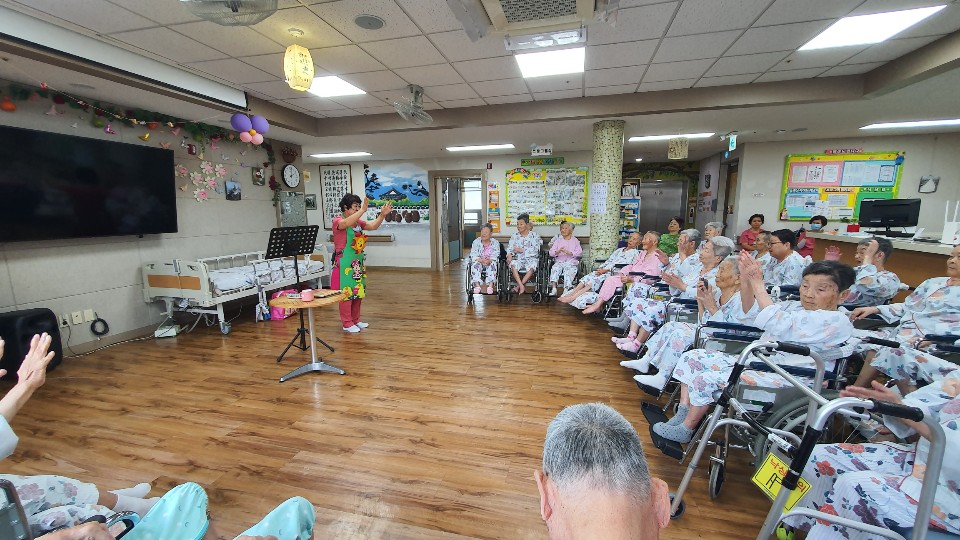 손유민과 함께 하는 동화시간 전래동화책을 동화구연을 해주셨습니다. 재미있는 손유희와 어르신들 인지 체조까지 함께 해주셔서 어르신들 호흥도가 좋으십니다. 백일홍 이야기를 재미있게 들려 주셨습니다. 어르신의 호흥도가 좋은 시간이었습니다. |