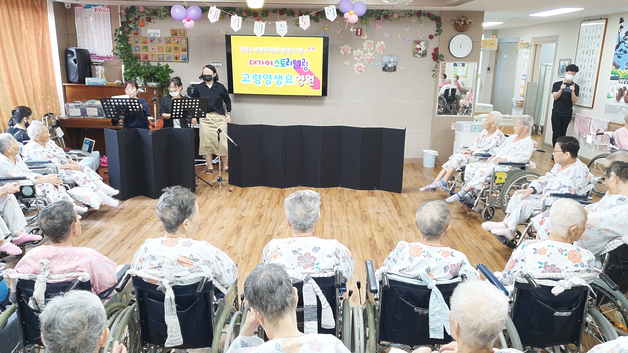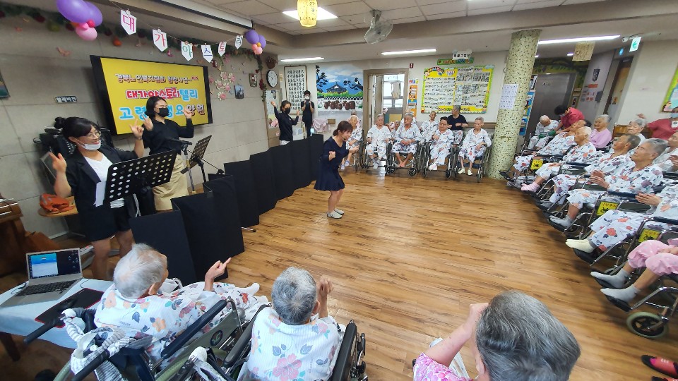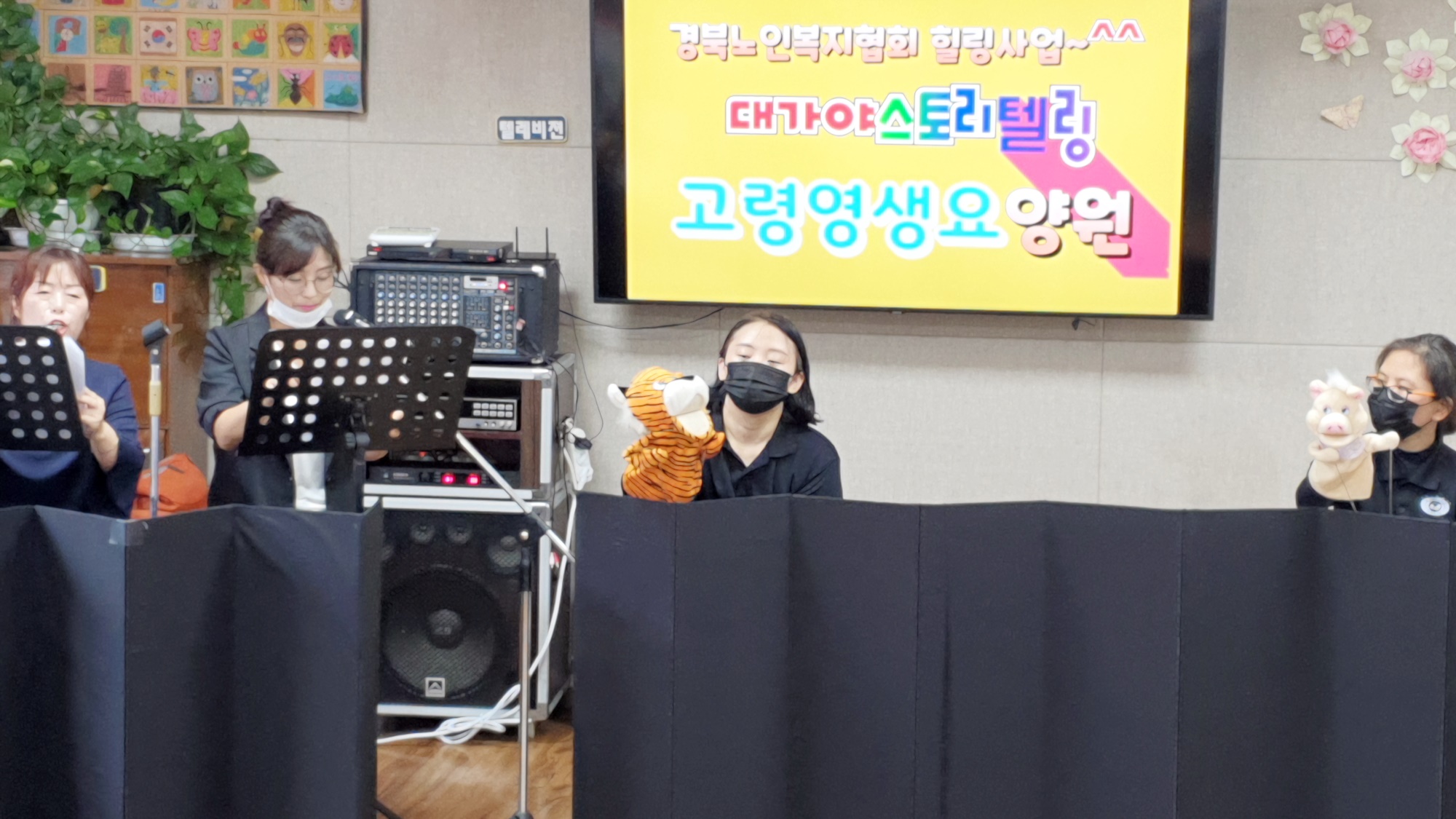 동화속 이야기를 통해 표현력과 집중력, 기억력을 증진 하여 건강하고 즐거운 생활을 유지드리고자 대가야스토리텔링예술연구회 회원들께서 아기돼지와 호랑이 공연을 보여 주셨습니다. 인형극과 즉석 멘트로 어르신들의 집중력이 좋았던 공연입니다. 실버체조도 함께 선보여 즐거운 시간이 되었습니다. |