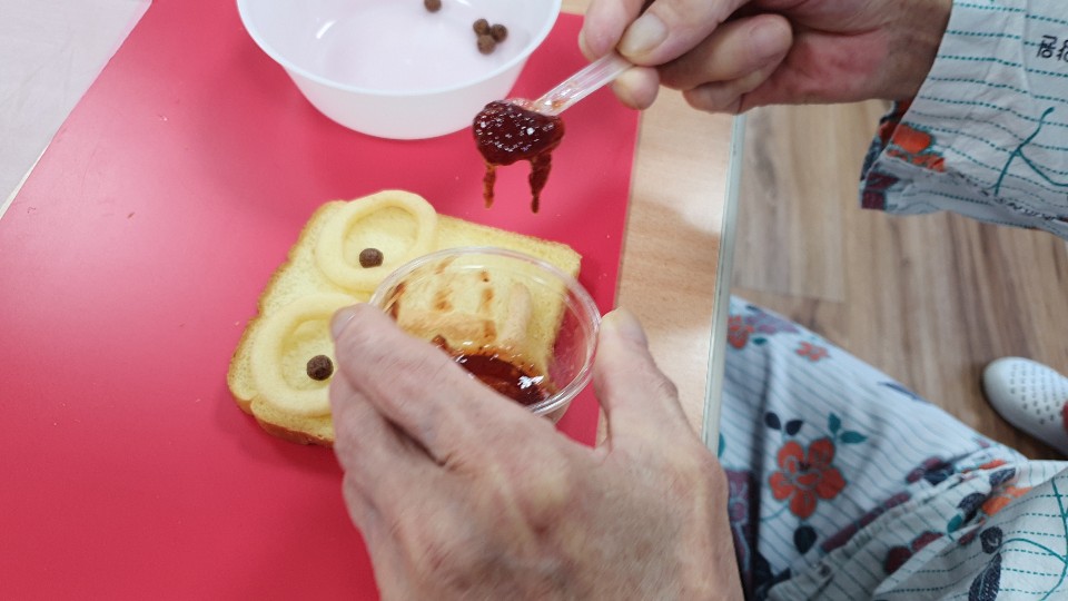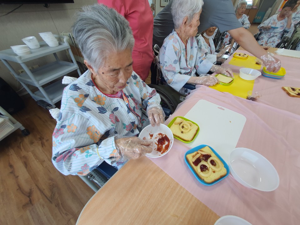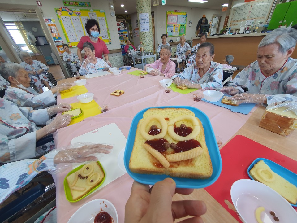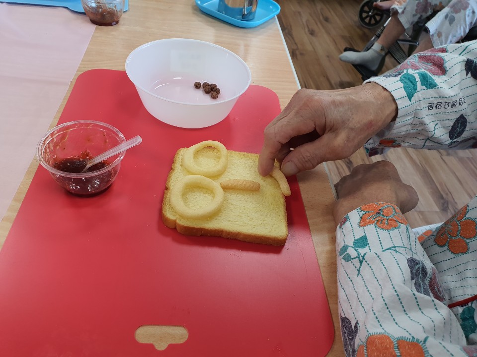 요리미술시간입니다. 식빵으로 어르신 자화상을 꾸민 후 얌얌~~ 맛있는 간식을 드시는 시간 소근육 활동도 하고 맛있게 드시는 시간 고령딸기잼과 과자를 이용해 얼굴을 꾸며봅니다. 맛있는 사과주스와 함께 ~~~ 얌얌 쩝쩝 사과 같은 내얼굴 이쁘기도 하지요 눈도 반짝 코도 반짝 입도 반짝반짝 식빵같은 내얼굴 맛있기도 하구나 눈도 얌얌 코도 얌얌 입도 얌얌얌얌 |