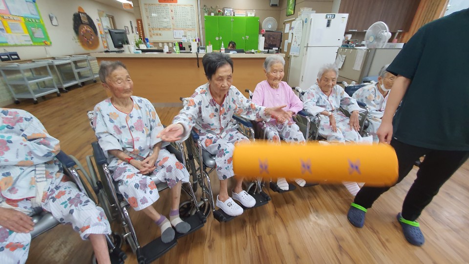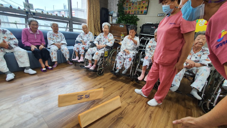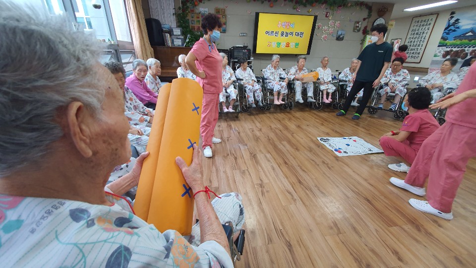 편을 나눠 윷놀이 한판승부~~ 전통음악을 들으며 대형 윷을 이용해 어르신들과 윷놀이를 했습니다. 소근육활동과 말을 놓으며 인지 활동을 진행 했는데요 승부욕 ㅎㅎ 정말 즐거운 시간이 되었습니다. 홍팀이 이겼지만 선물은 모두에게 어르신들날씨가 추워지셔서 따뜻하시라고 양말 선물을 나눠드렸습니다. 선생님들 윷 주으러 다니시고 말 놓으신다고 활동량이 엄청 나셨어요 ㅎㅎ |
