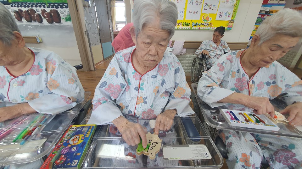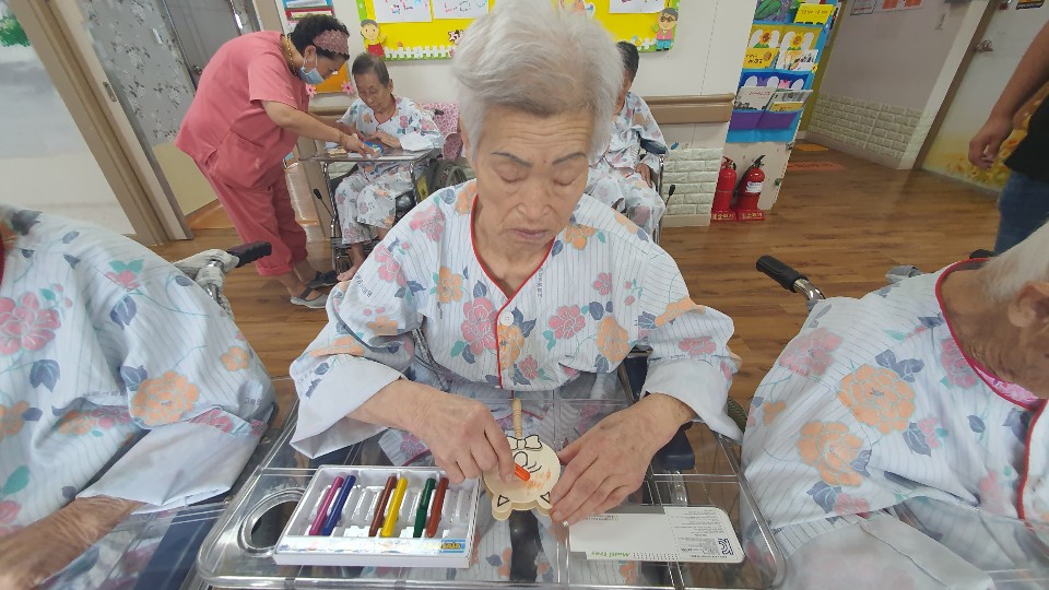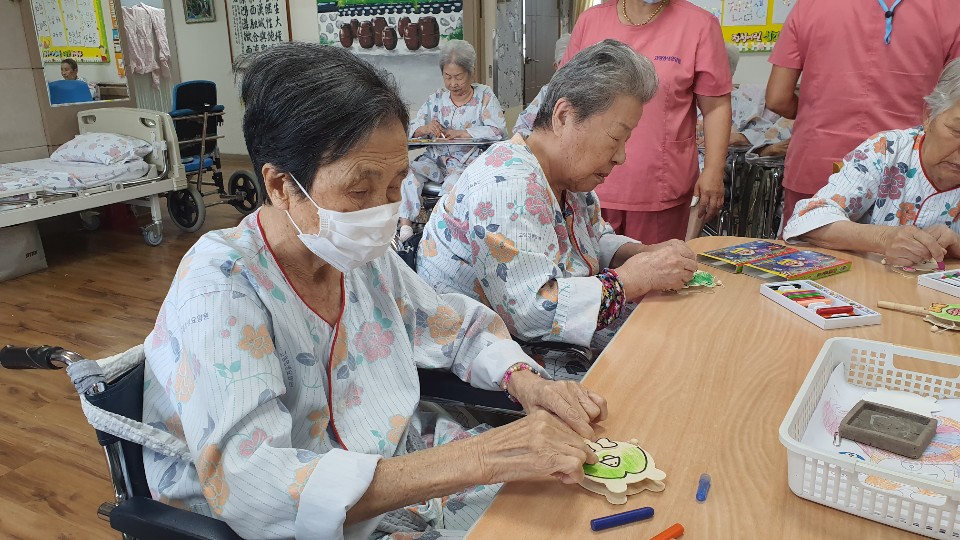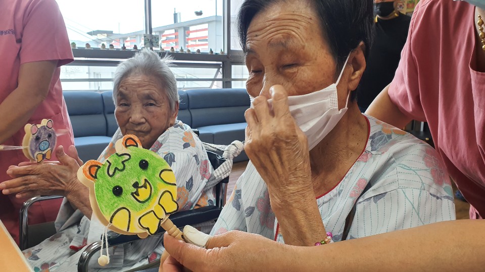 흔들이북을 나눠드린 후 샘플을 보여드려 음악에 맞추어 노래를 부르며 흔들이북을 쳐 보는 놀이와 미술이 함께 하는 프로그램입니다. 색칠로 예쁘게 만든 흔들이북을 소근육 활동이 되도록 흔들어서 장단을 맞춘다 뱅글 뱅글 돌리며 손에 마찰을 주어 놀이를 통해 자연스럽게 운동을 하시도록 유도한다. 수행도도 좋으시고 재미 있었다고 하시며 활짝 웃으셨네요 그린 흔들이 북은 어르신들이 각자 가지고 방으로 가셔서 심심할때 마다 한들어 보시도록 유도 드렸더니 즐거워 하심 |