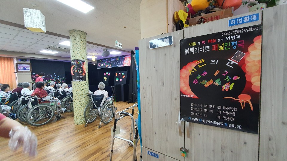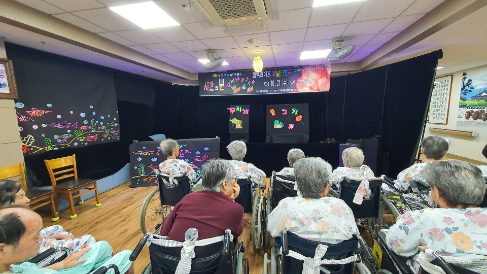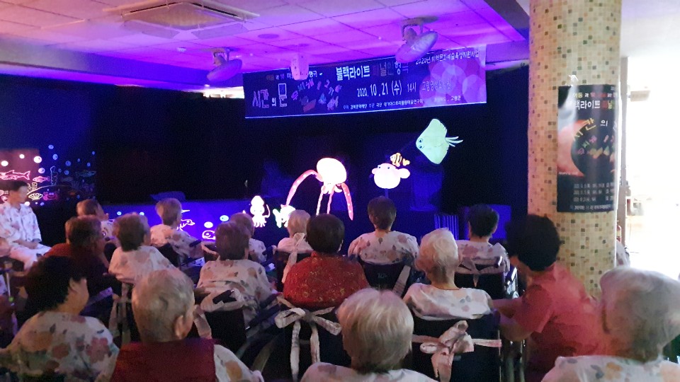 어르신과 비대면으로 공연을 진행했습니다. 대가야스토리텔링 예술연구회에서 블랙라이트패널공연을 어르신과 접촉없이 kf94마스크를 작용하시고 공연을 진행해주셨습니다. 바닷속으로 떠나는 랜선여행 어르신들 너무도 즐거워 하셨네요 |