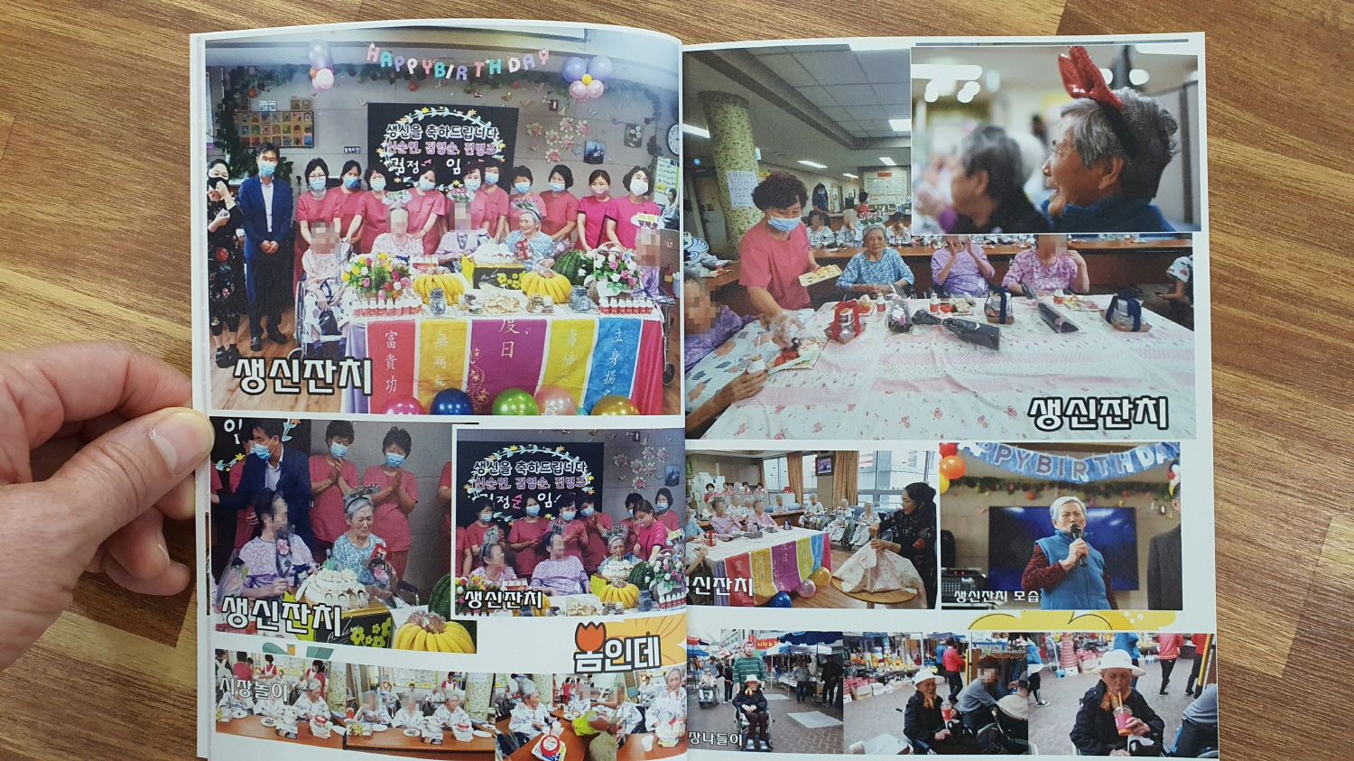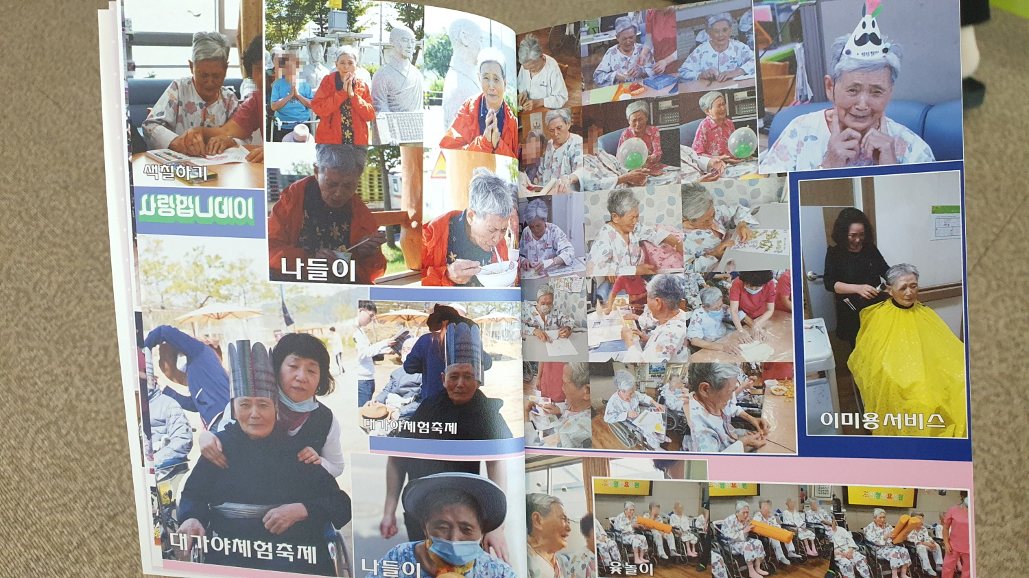 코로나 19의 지속은 보호자님에게도 큰 아픔이었습니다. 부모님을 뵙지 못한 안타까움 때문이죠. 그래도 영상전화도 가끔 하시고 안부 전화도 하시지만 더욱 가까이서 뵙고 싶은 마음이야 오죽하시겠습니까. 따라서 본원은 그동안 사회복지프로그램을 통한 다양한 어르신의 모습 활동을 앨범에 담아 보호자님께 드리고자 계획했고, 마침내 완성이 되었습니다. 이것으로 보호자님께 위안이 되었으면 하는 작은 바람입니다. 비록 전문적이지는 못한 투박하고 아마추어적이지만 오랜 시간을 두고 한 분 한 분의 모습을 담았습니다. 총 24-28쪽 분량으로 앞 부분에는 개인사진을, 뒷 부분에는 공통적 프로그램 사진을 수록해놨습니다. 면회 오시는 계약자 보호자님께 드리겠습니다. 비록 코로나로 인해 자주 면회는 오시지 못하지만 이 앨범을 통해 내 부모님의 근황을 살펴 보시기 바랍니다. 감사합니다. |
