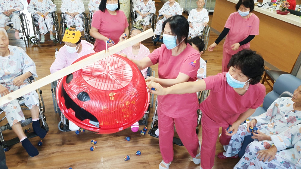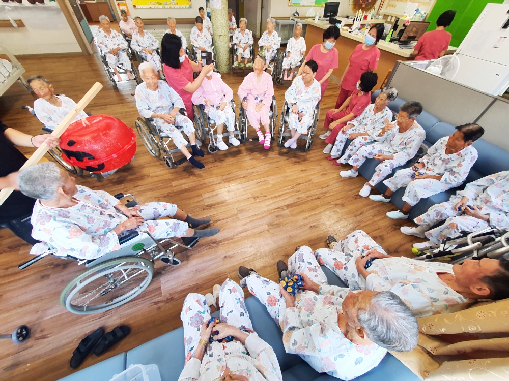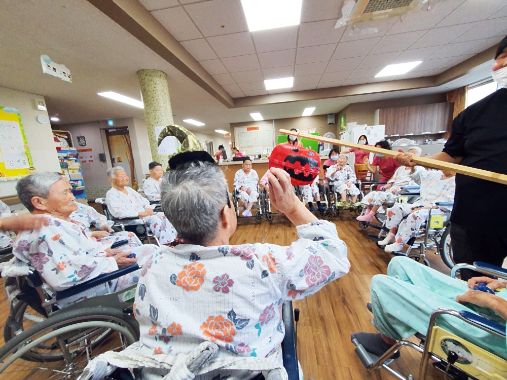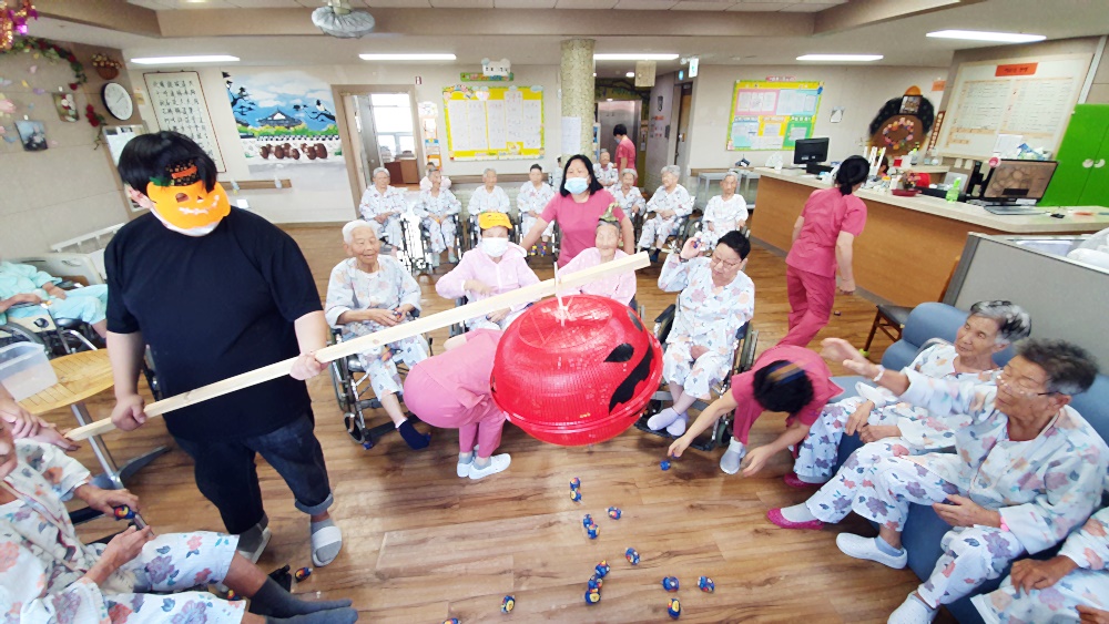 고령영생요양원 할로윈데이 축제가 열렸습니다. 호박모양 박터트리기를 준비해 과자를 넣고 어르신들과 추억의 게임 오자미 던지를 진행했습니다. 손자들이 운동회때 하던 추억을 떠올리시며 직접 해보기는 처음이지만 재미있다고 하셨습니다. 게임 후 느낀 점을 이야기 하며 어릴적 손자의 모습을 회상해 보는 시간과 손근육 활동으로 재미있는 게임을 즐기셨는데요 박이 터지면서 안에서 금돈이 우르륵~~~ 반짝반짝 금박지에 싸인 초콜렛을 드시면 달달한 하루를 보내셨습니다. |
