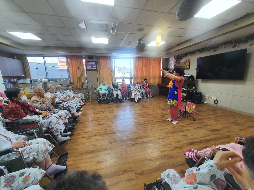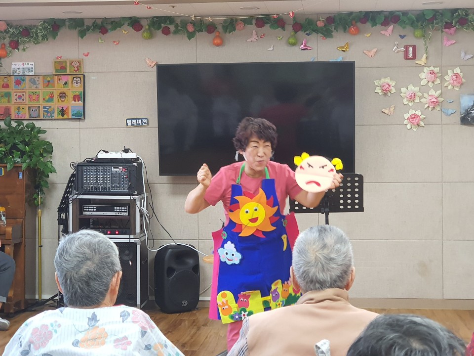 즐거운 동화시간이 왔습니다. 어르신들 경청하시며 호흥도가 좋으시간~~ 재미난 옛날 이야기를 한번 들어 보시겠어요 즐거운 동화시간이 왔습니다. 손유희를 따라하시며 인지력 쑥쑥~~ 옛 이야기 들으시며 희노애락을 느끼시는 시간 동화구연 시간입니다. 비말차단 마스크 착용하시고 공연을 진행합니다. ~~ |