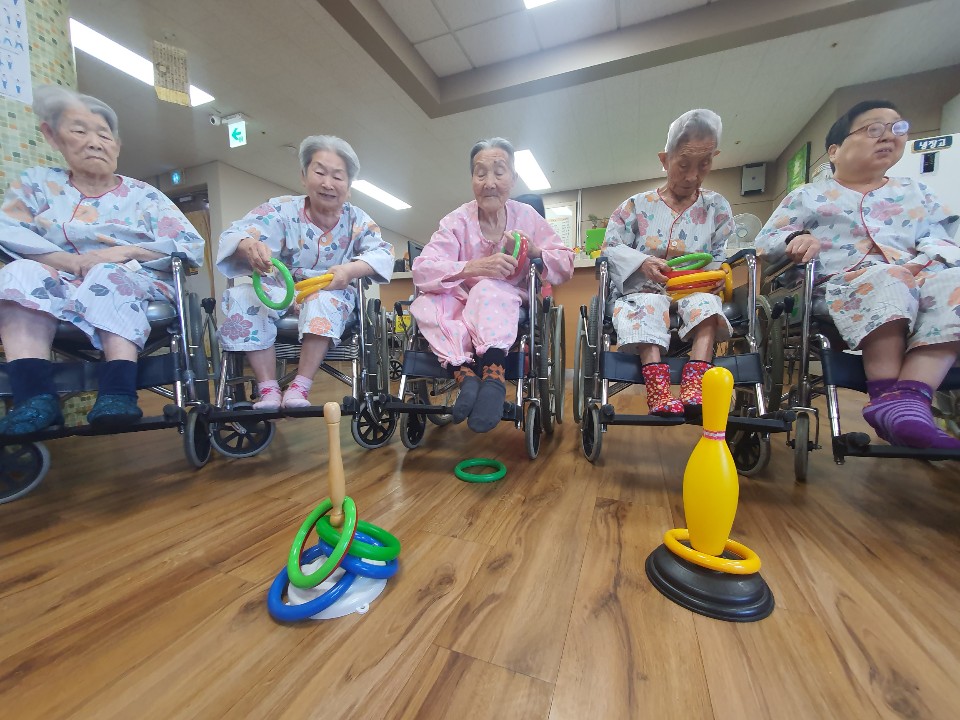 고리를 던지므로 손조작력과 집중력을 키우는 프로그램으로 휠체어를 타시는 분이나 편마비가 있으셔도 반대편 손을 이용해 고리던지를 해 고리가 막대에 들어갈때 성취감을 느끼도록 함 고리던지 후 어르신들과 모여 노래를 부르며 흥겨운 시간을 가졌습니다 |
